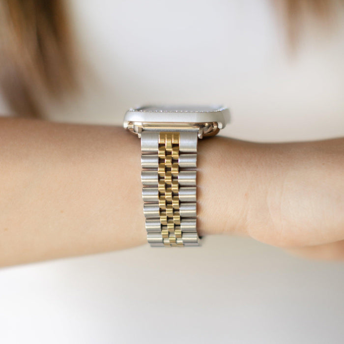 Show off your style in this beautiful band. It is made from high-quality stainless steel, and double electroplated. The sleekest, look for your Apple Watch band. It features a two tone sleek interwoven design with removable links for wrist sizing adjustments.