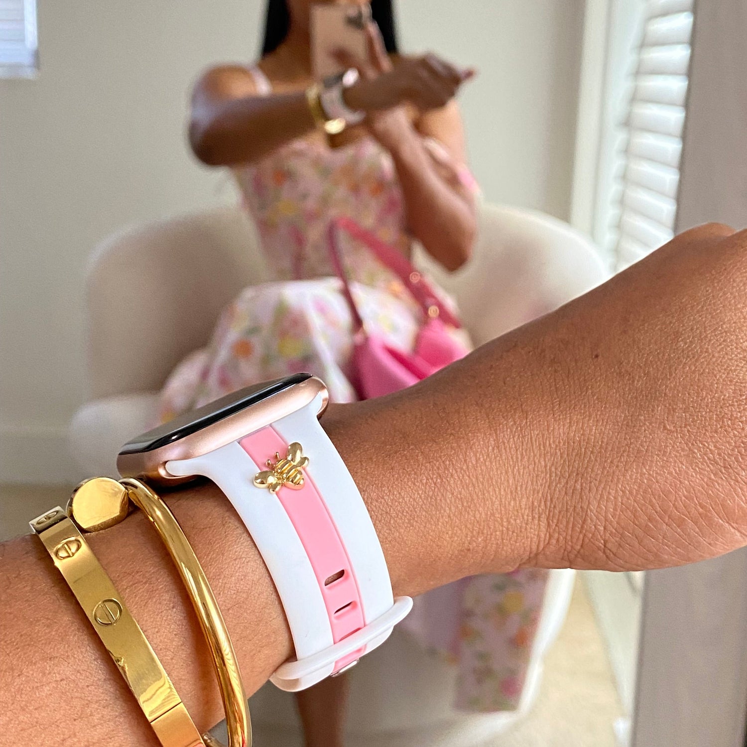 This Apple Watch band features our original molded band (nothing painted on printed on) high quality, soft, comfortable and beautifullll! You have a choice of a pair of Pup charms in either gold, silver or rose gold finish.