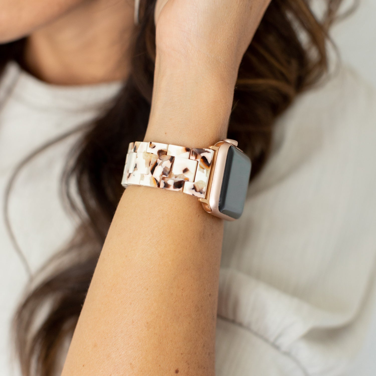 Show off your style in this beautiful band. It is made from high-quality acrylic. The sleekest, look for your Apple Watch band. It features a two tone sleek marbled design with removable links for wrist sizing adjustments.