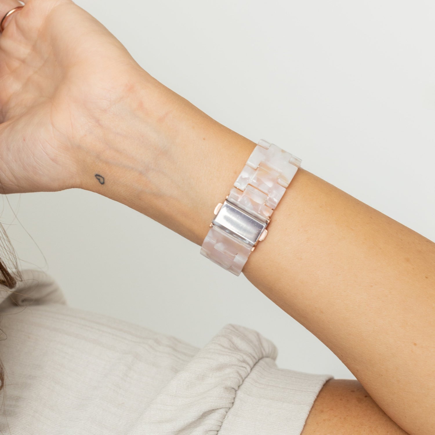 Show off your style in this beautiful band. It is made from high-quality acrylic. The sleekest, look for your Apple Watch band. It features a two tone sleek marbled design with removable links for wrist sizing adjustments.