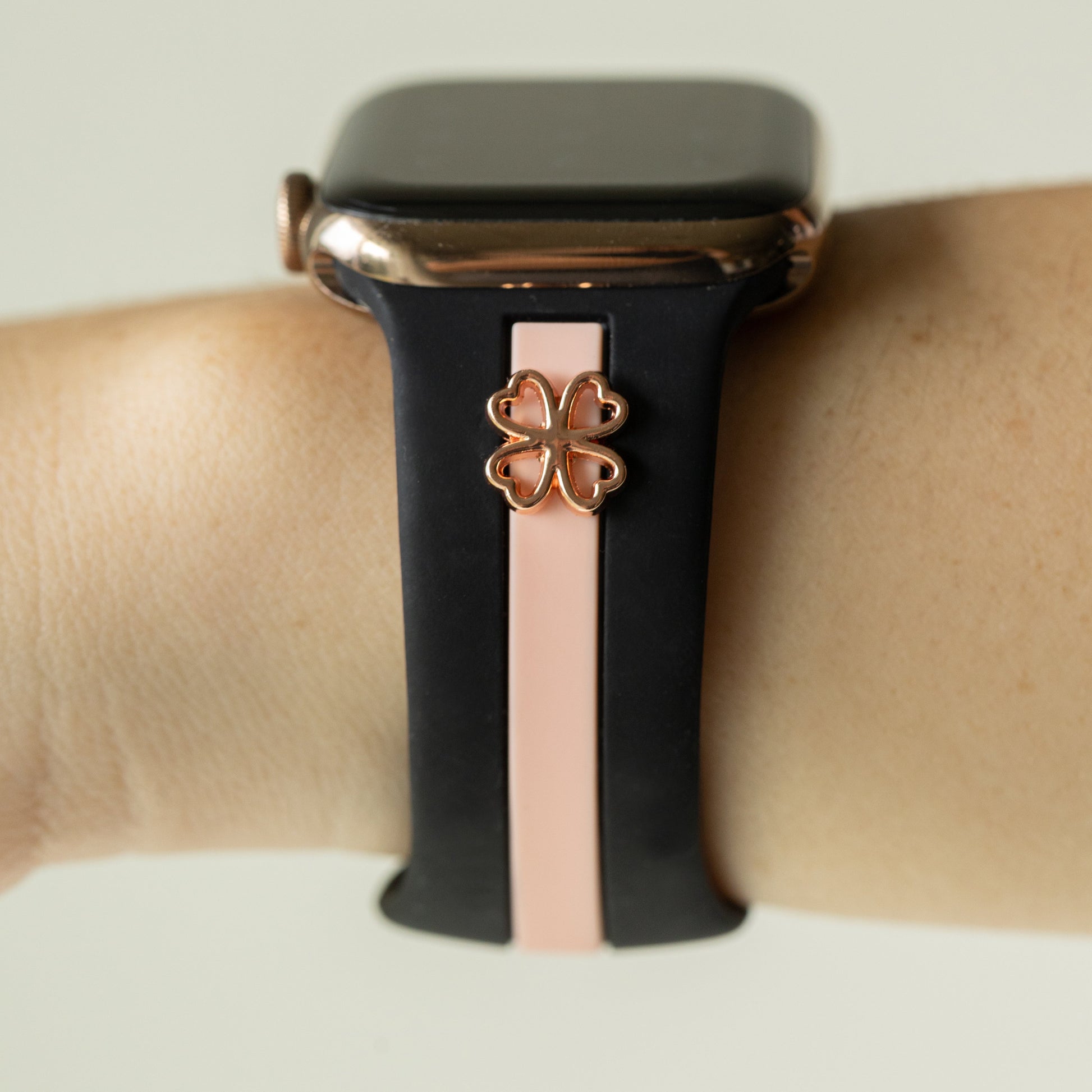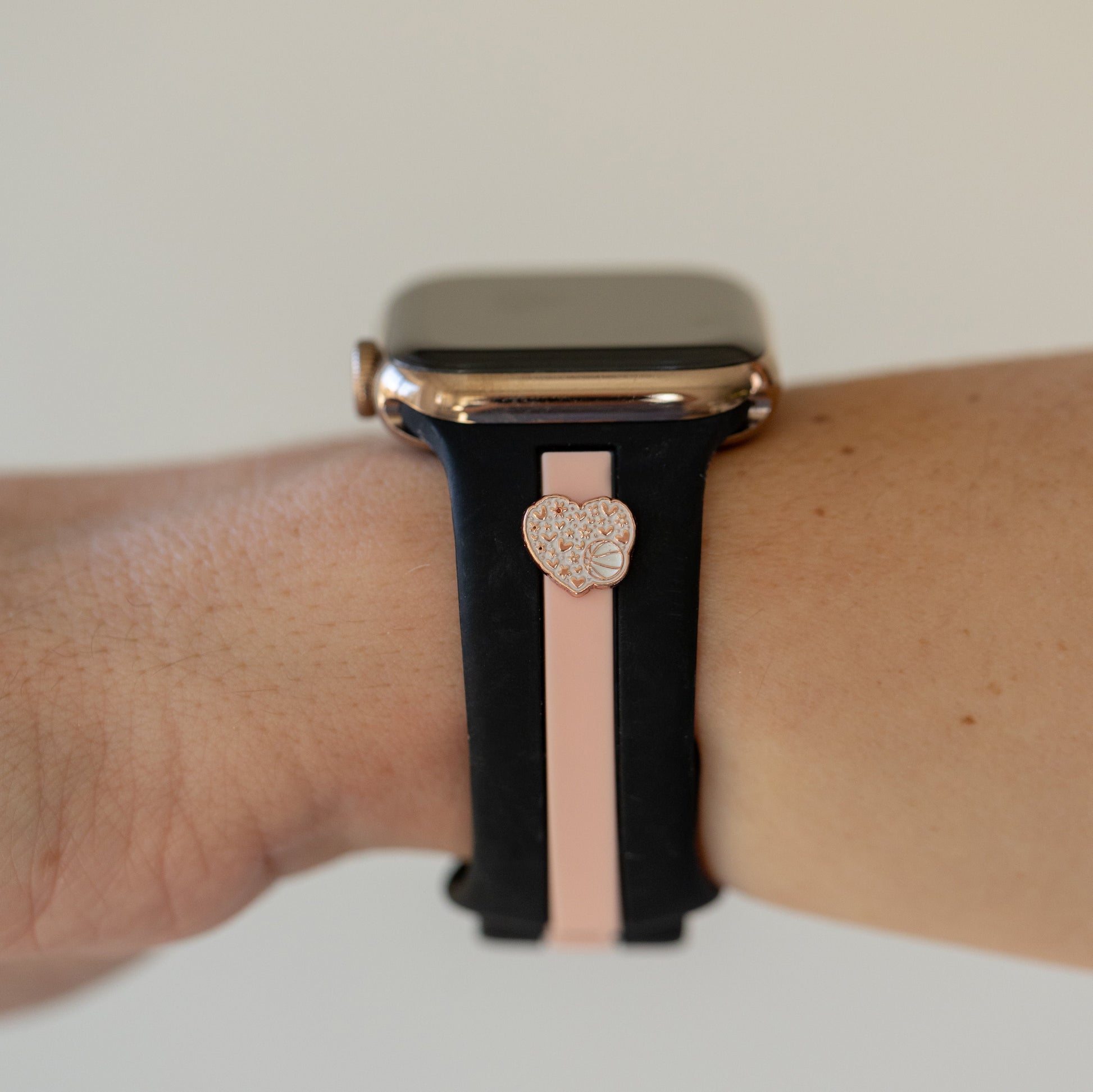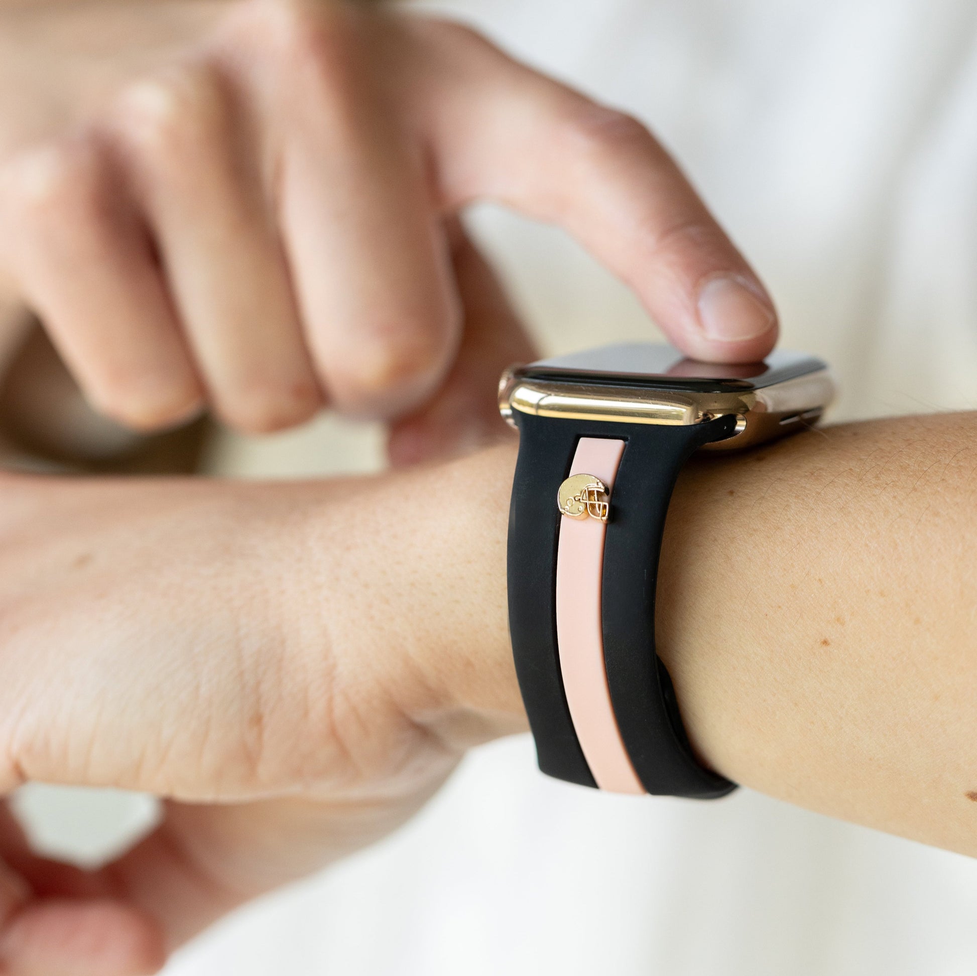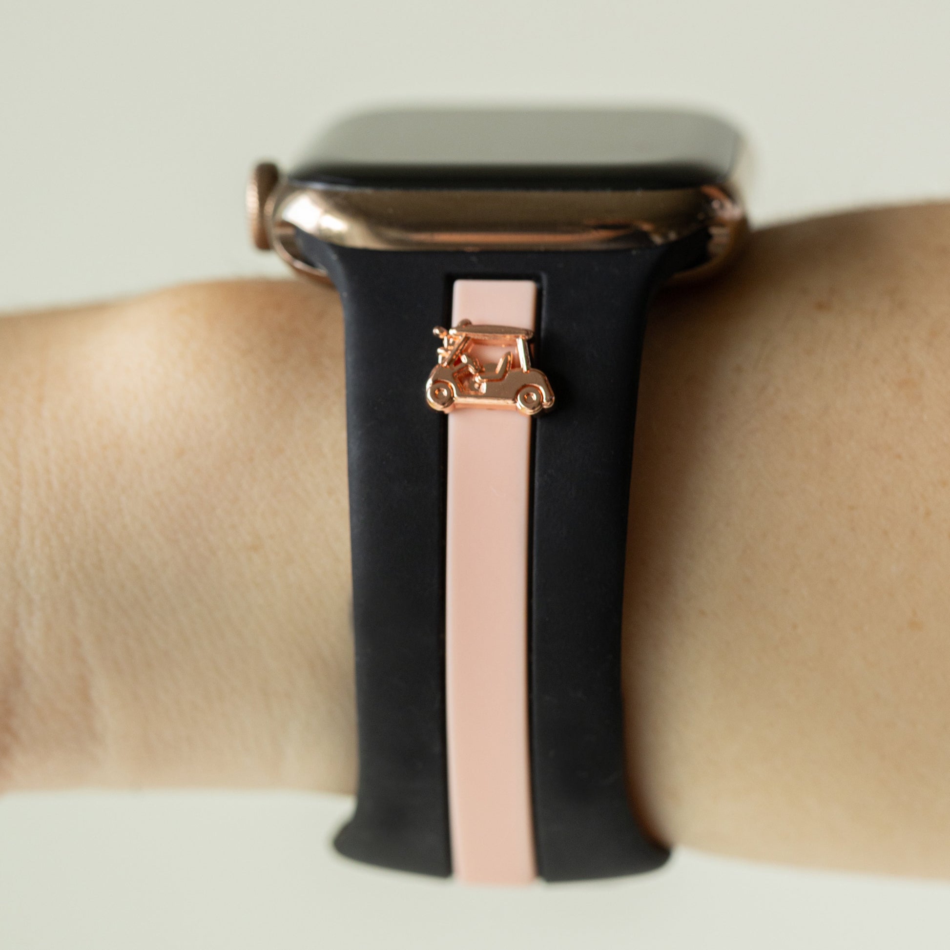 This band is designer-esque, comfiest silicone with the cutest, delicate charm options in gold, rose gold, or silver.
