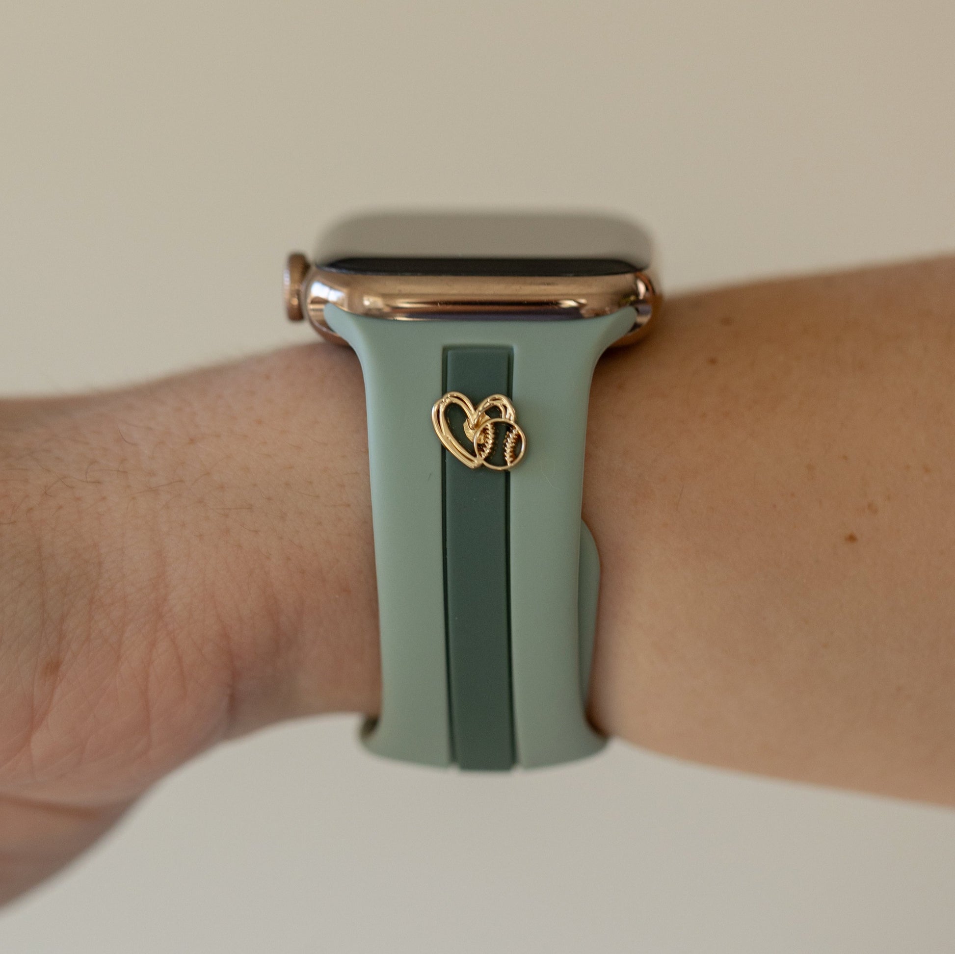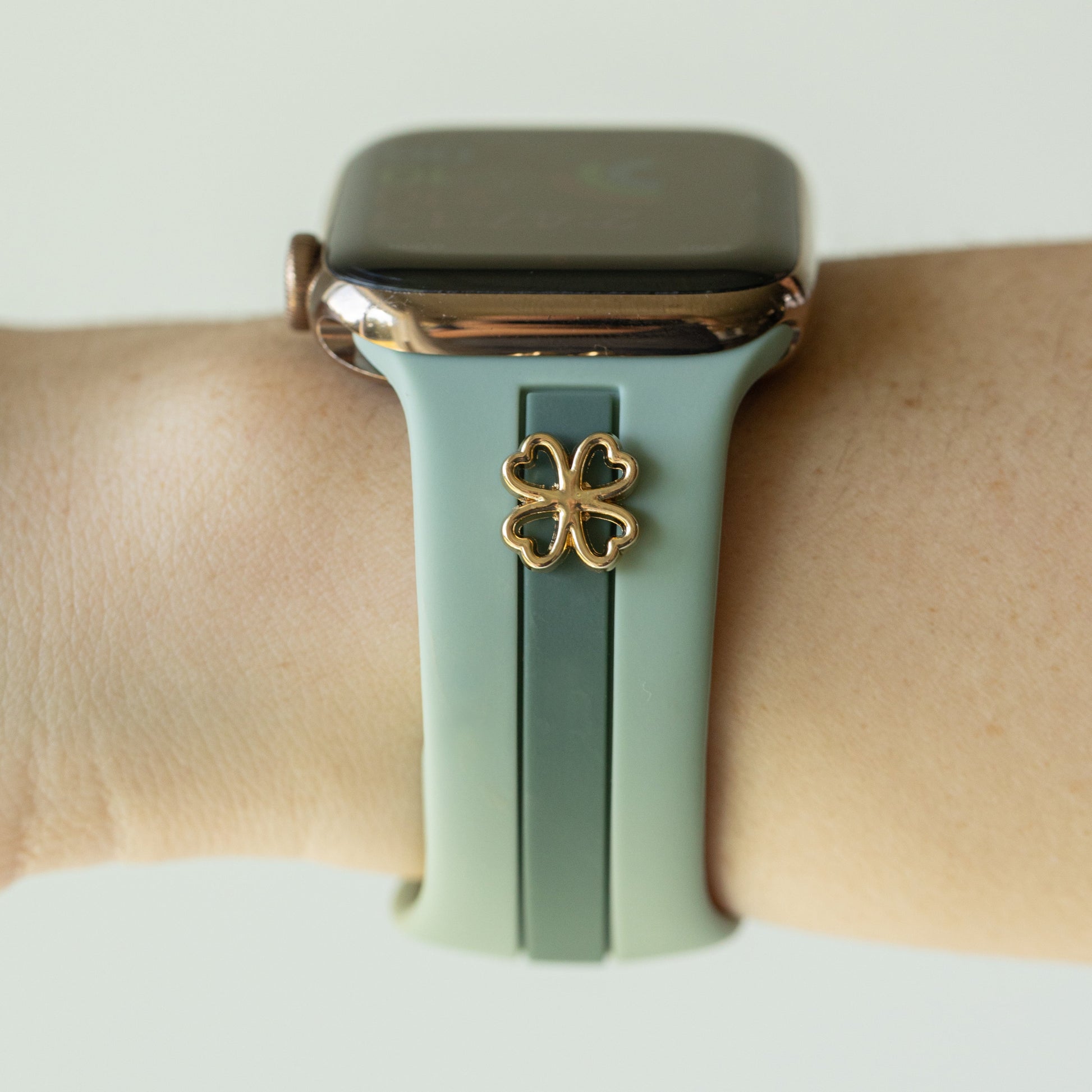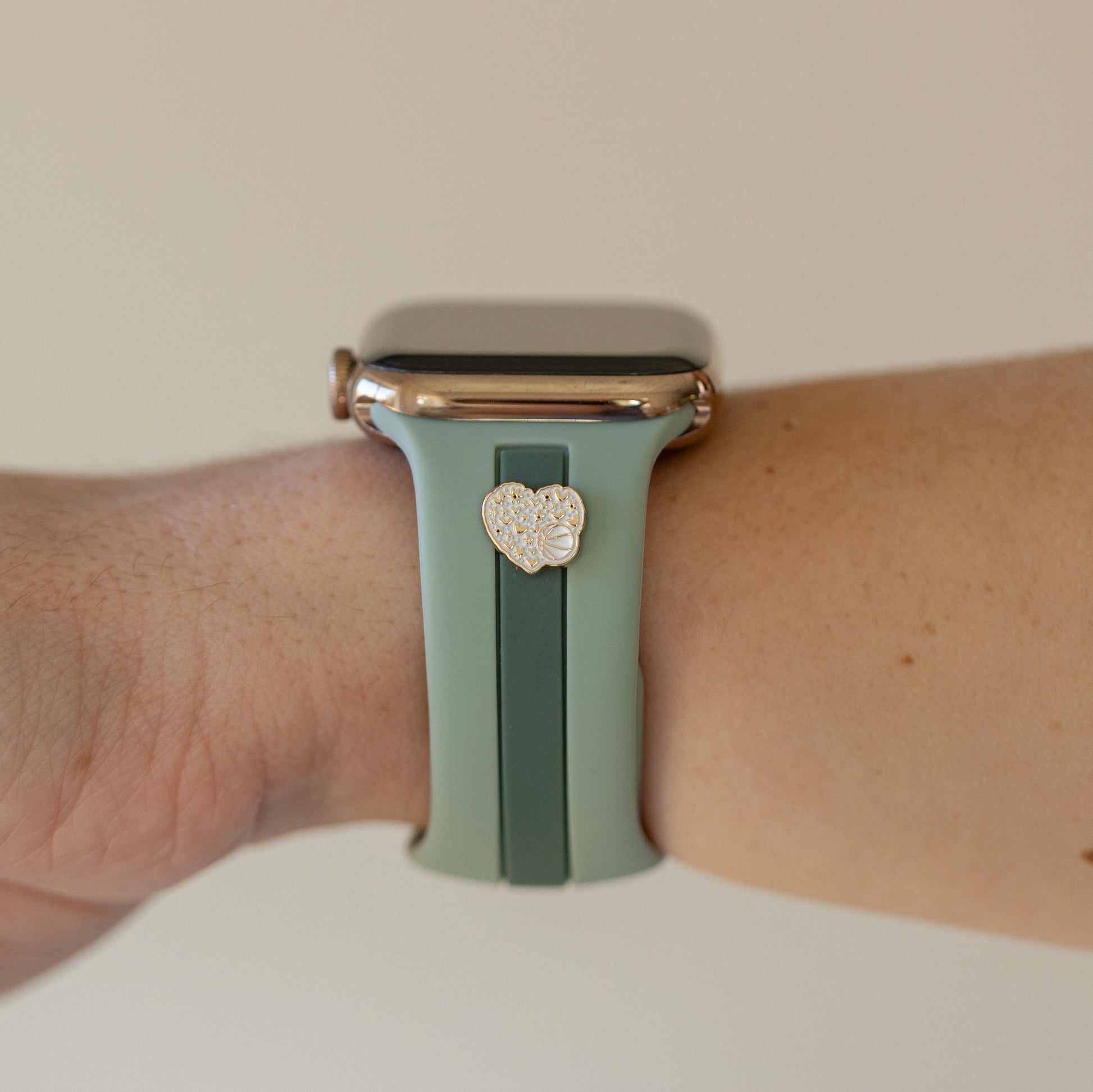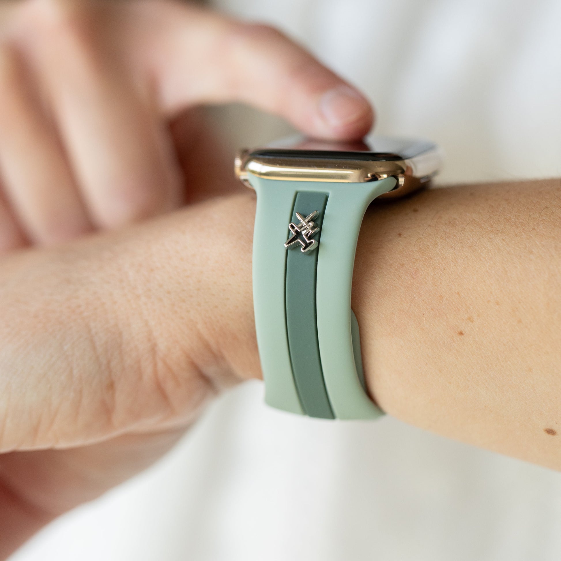 This band is designer-esque, comfiest silicone with the cutest, delicate charm options in gold, rose gold, or silver.
