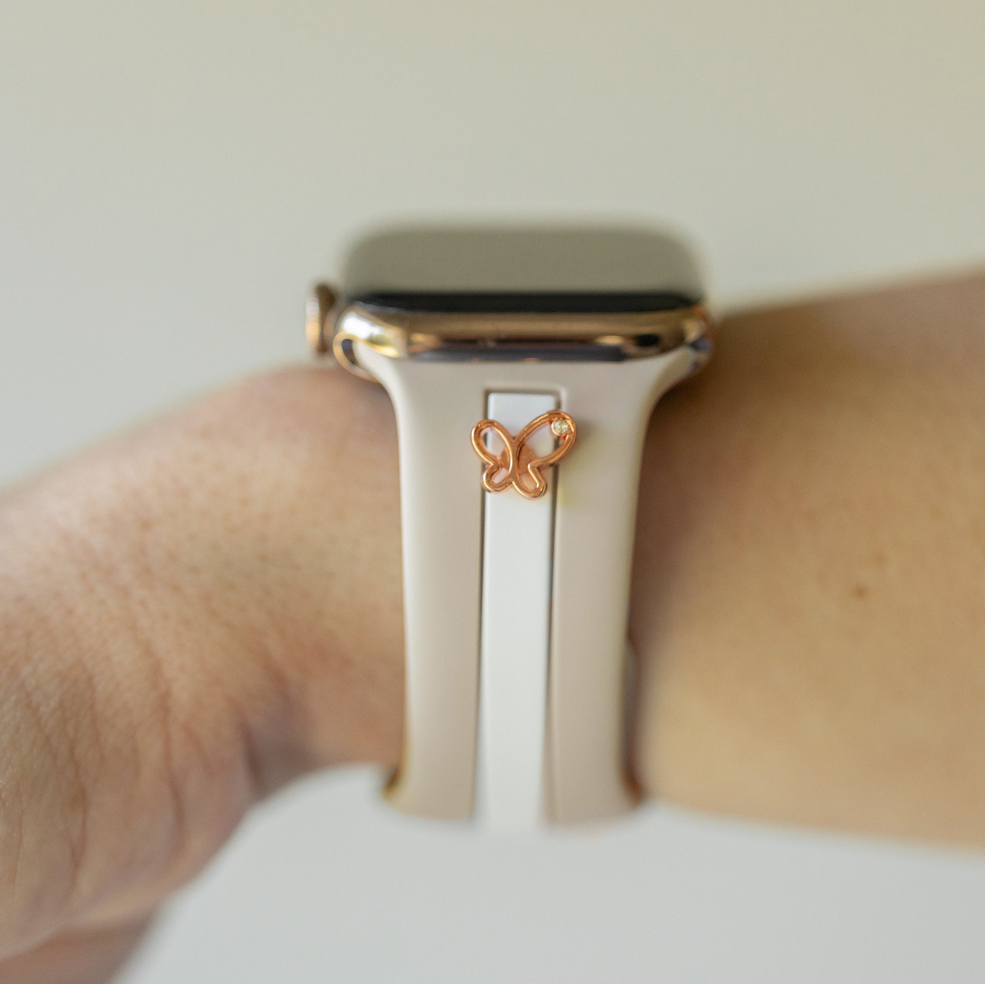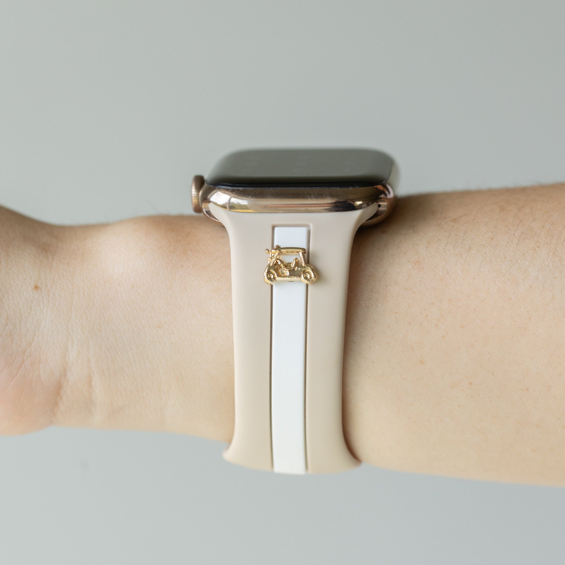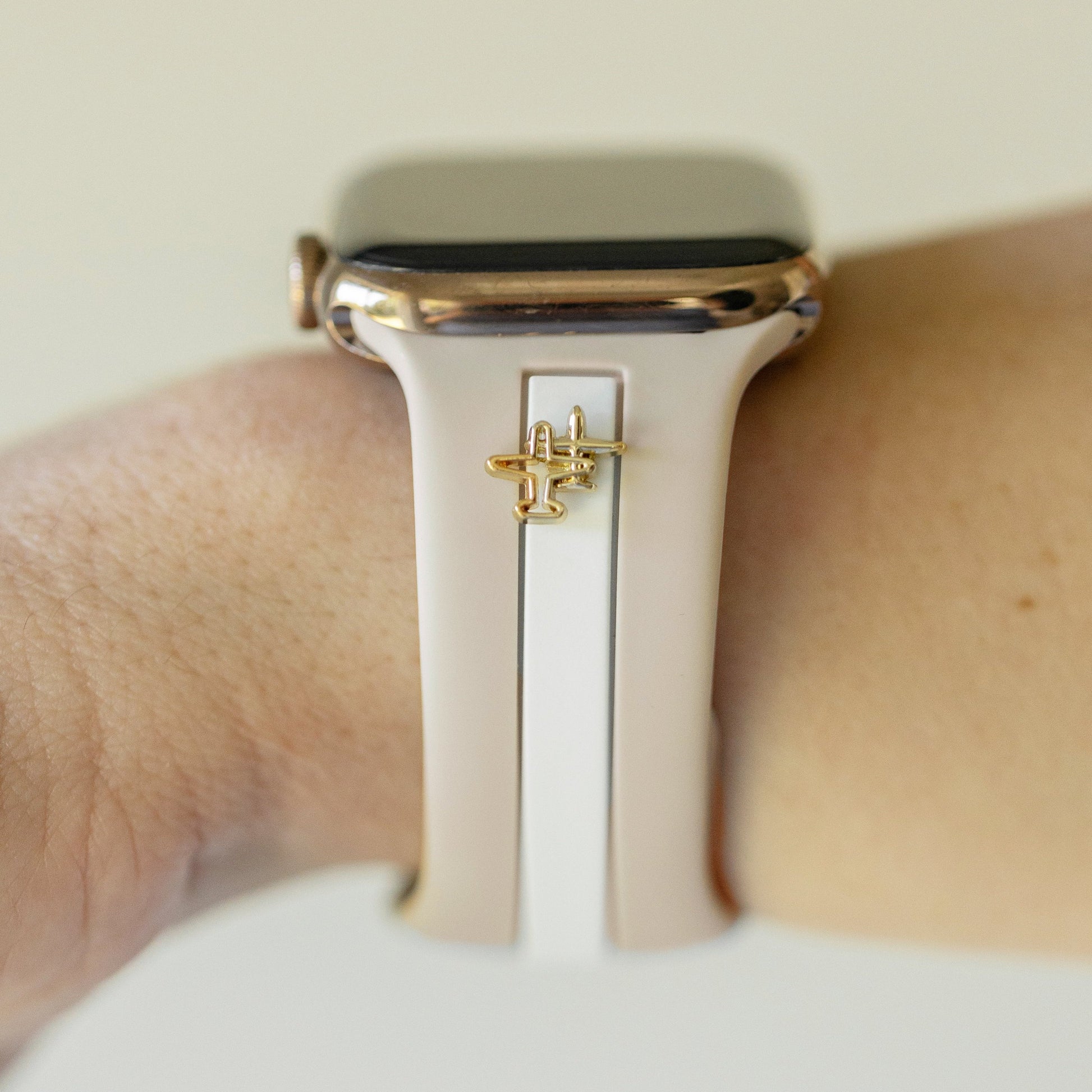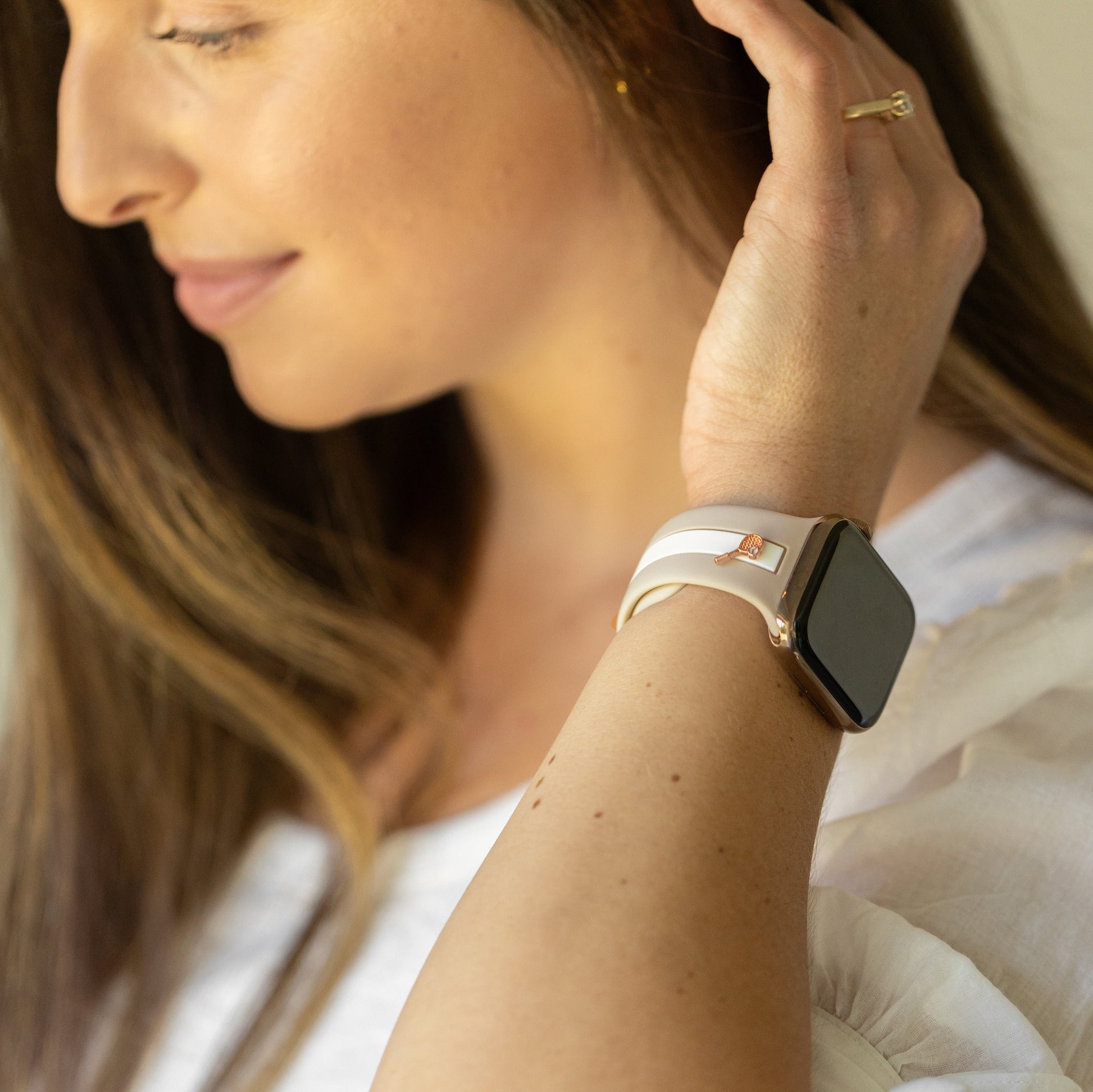 This band is designer-esque, comfiest silicone with the cutest, delicate charm options in gold, rose gold, or silver.