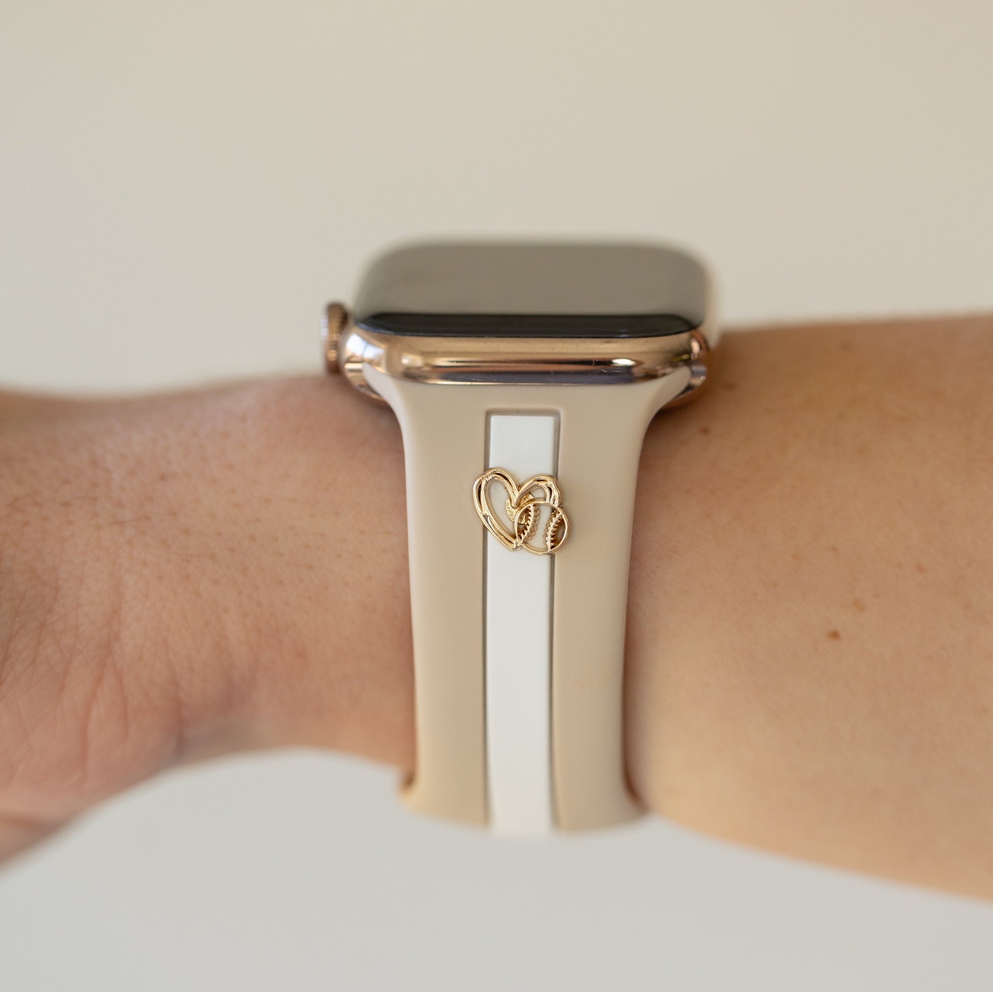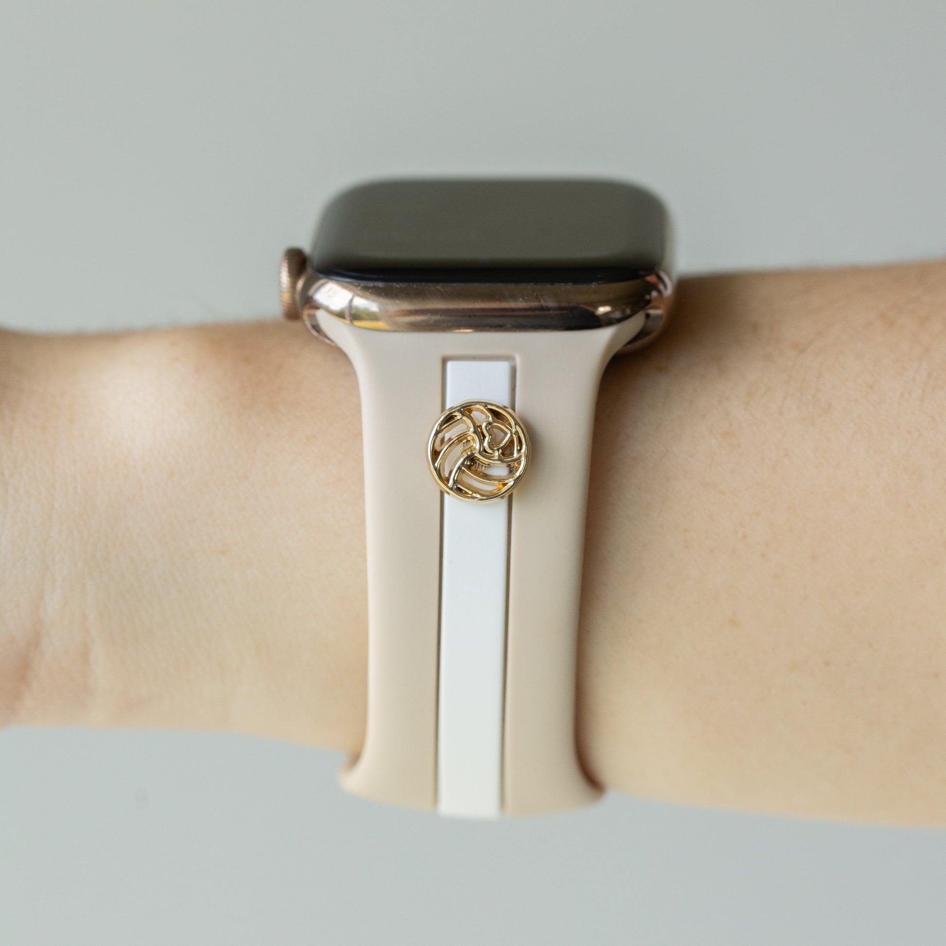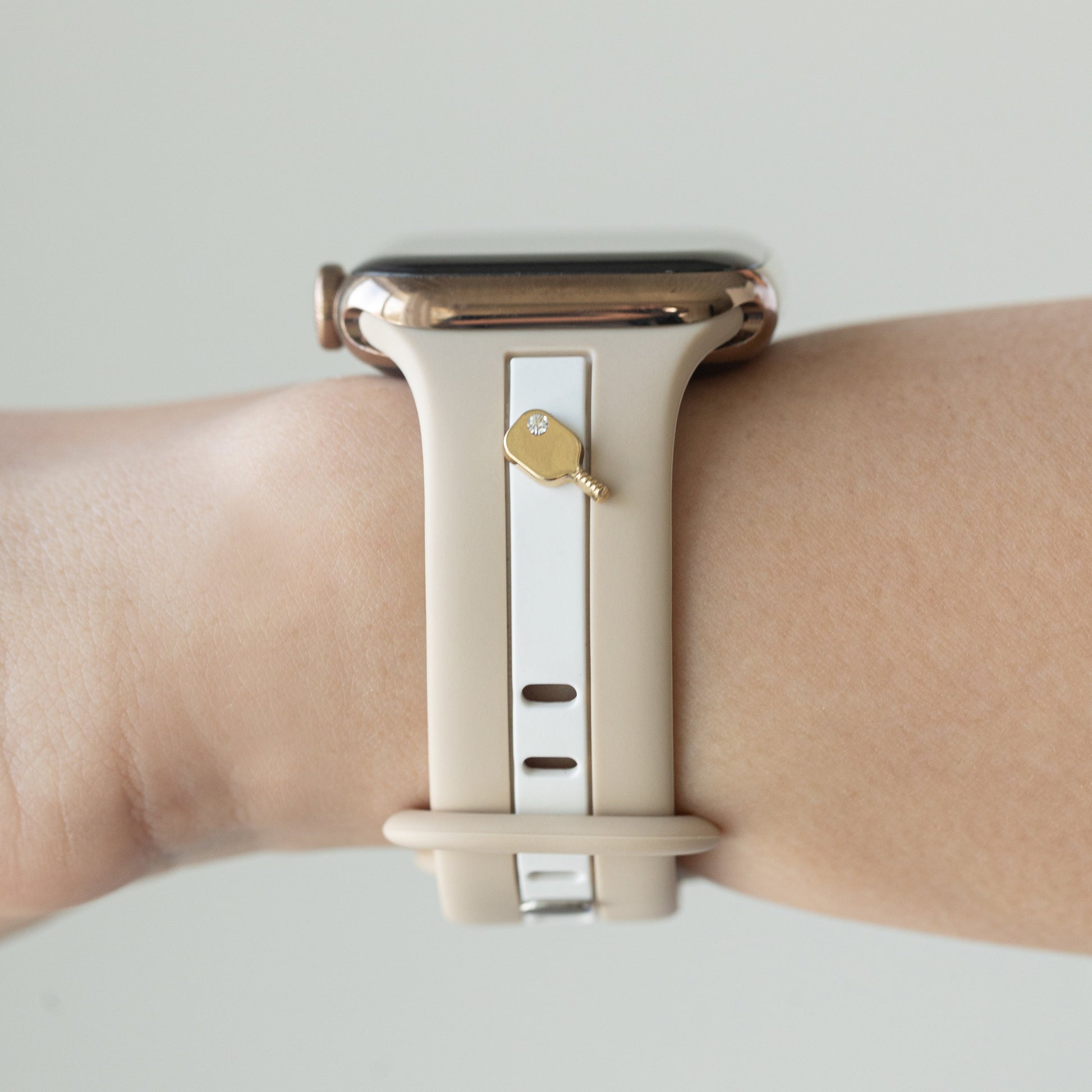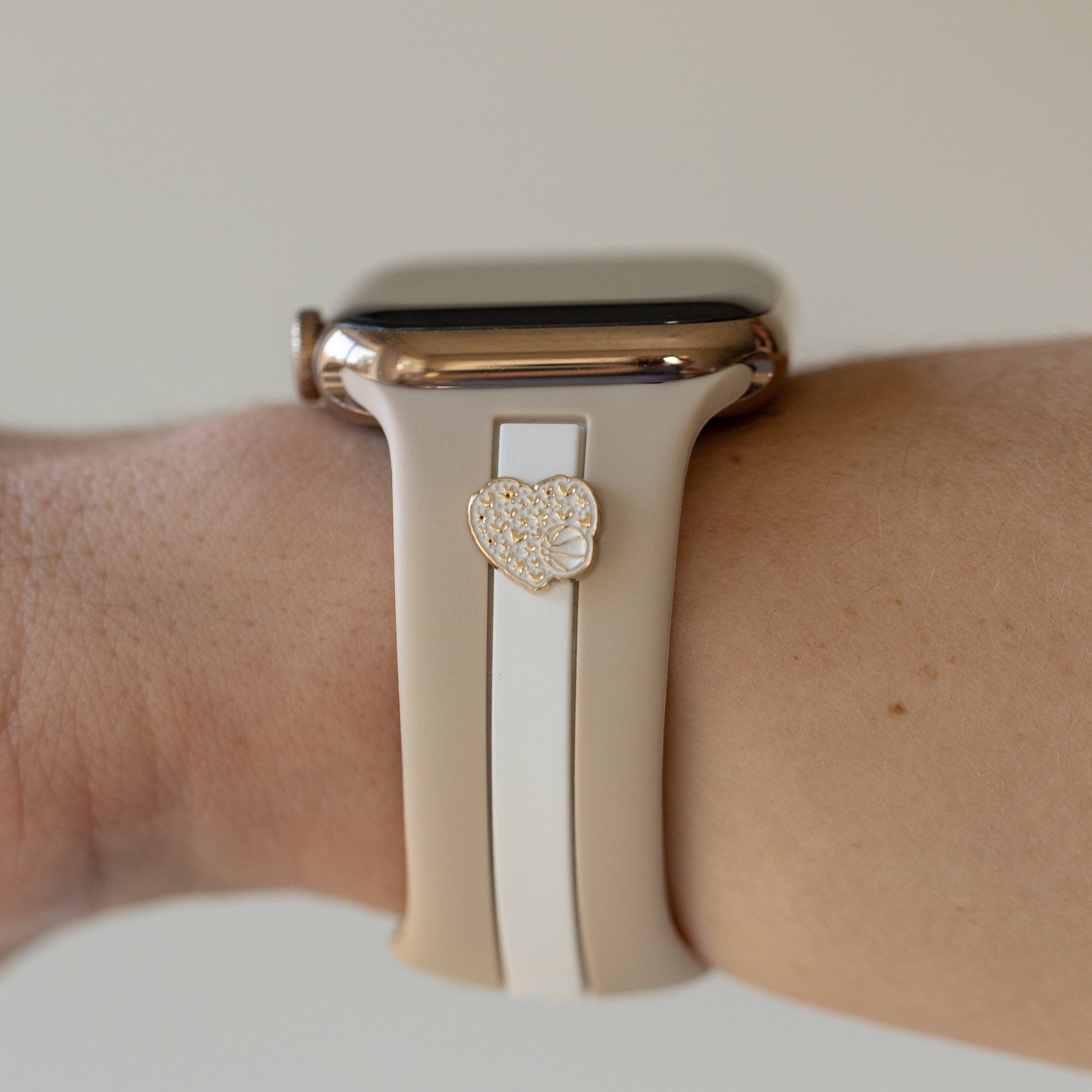 This band is designer-esque, comfiest silicone with the cutest, delicate charm options in gold, rose gold, or silver.