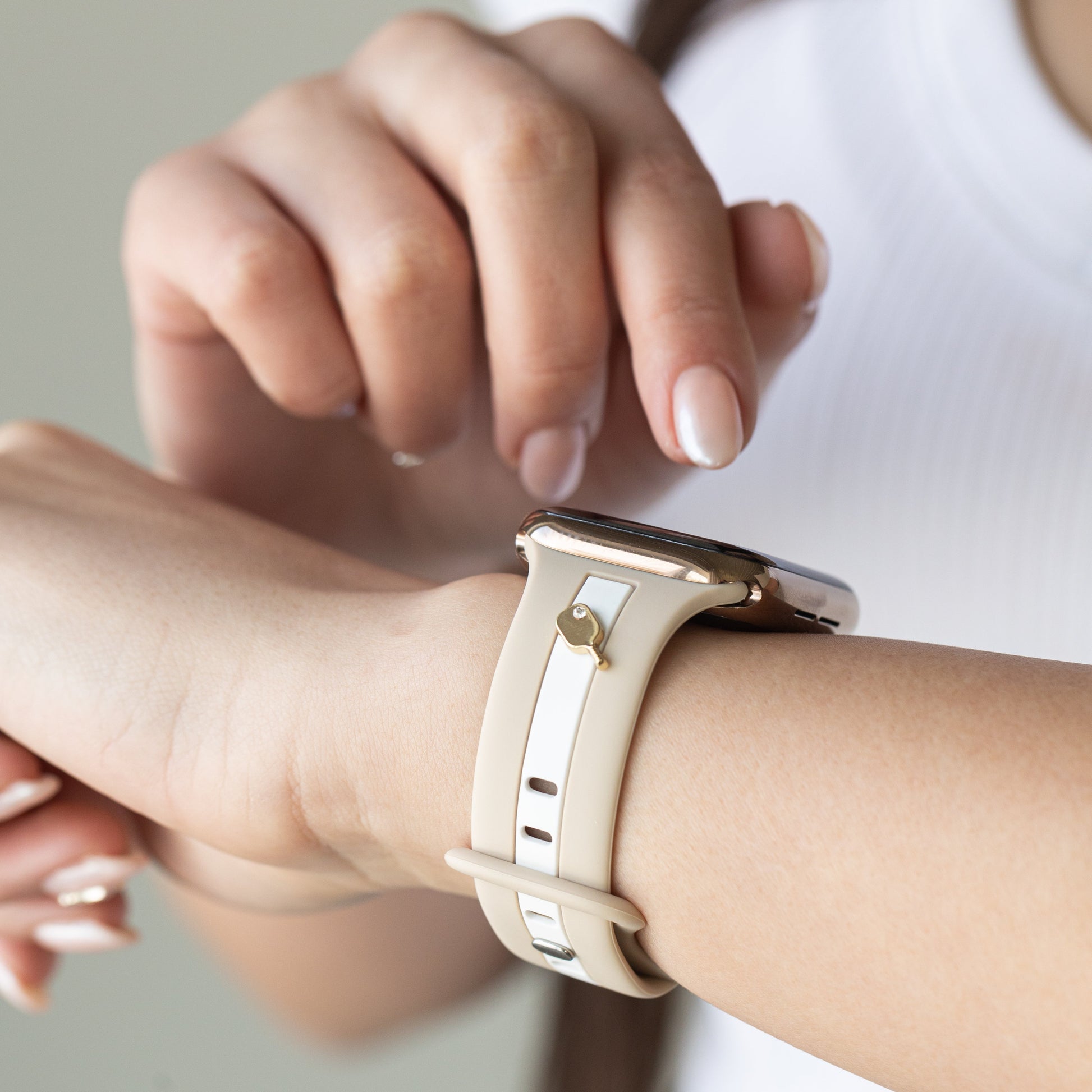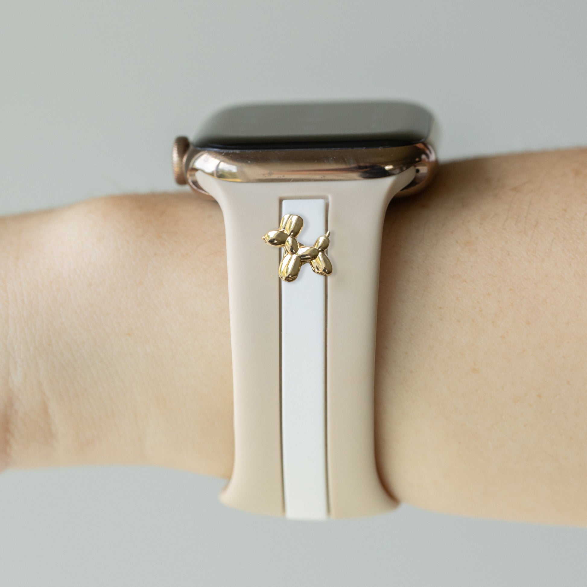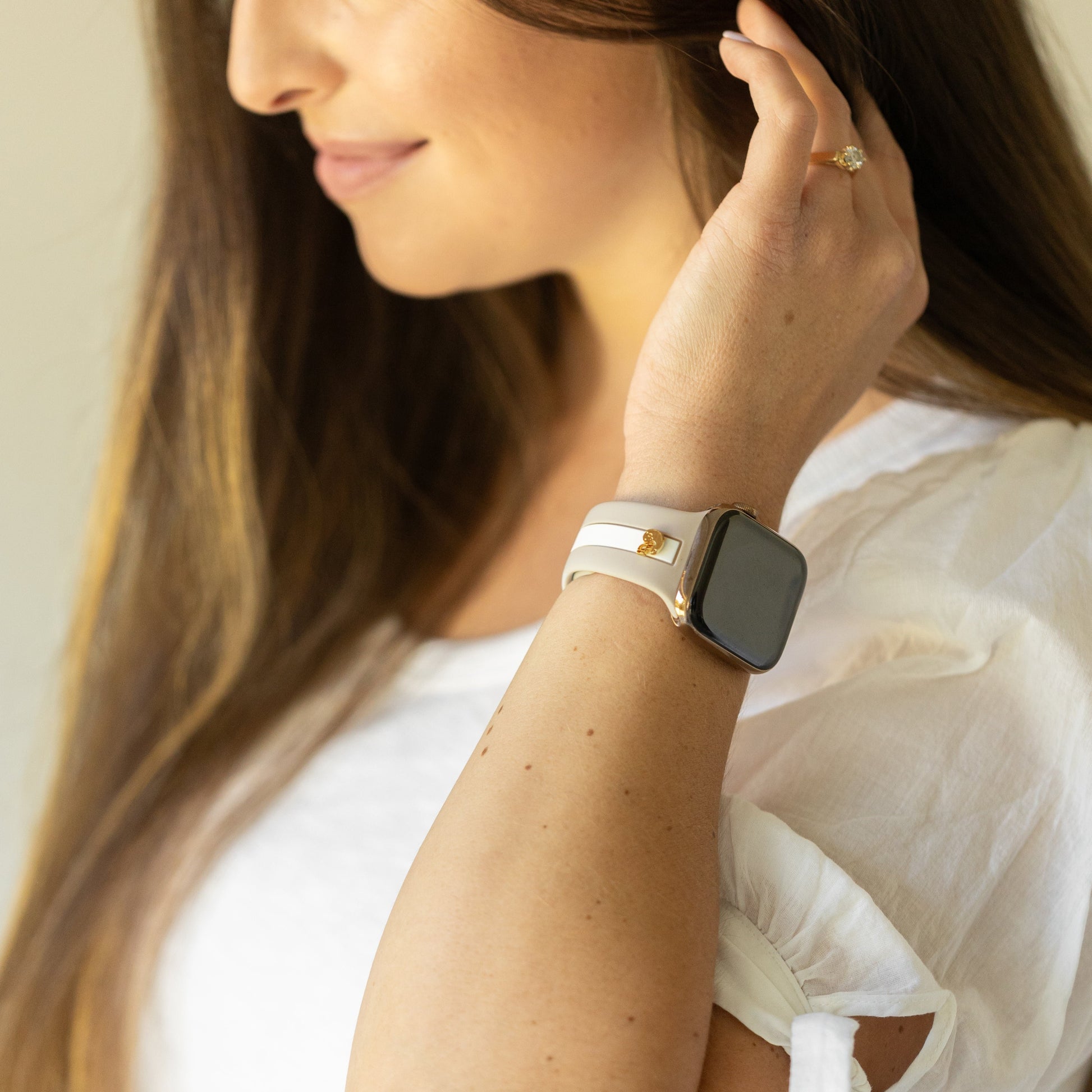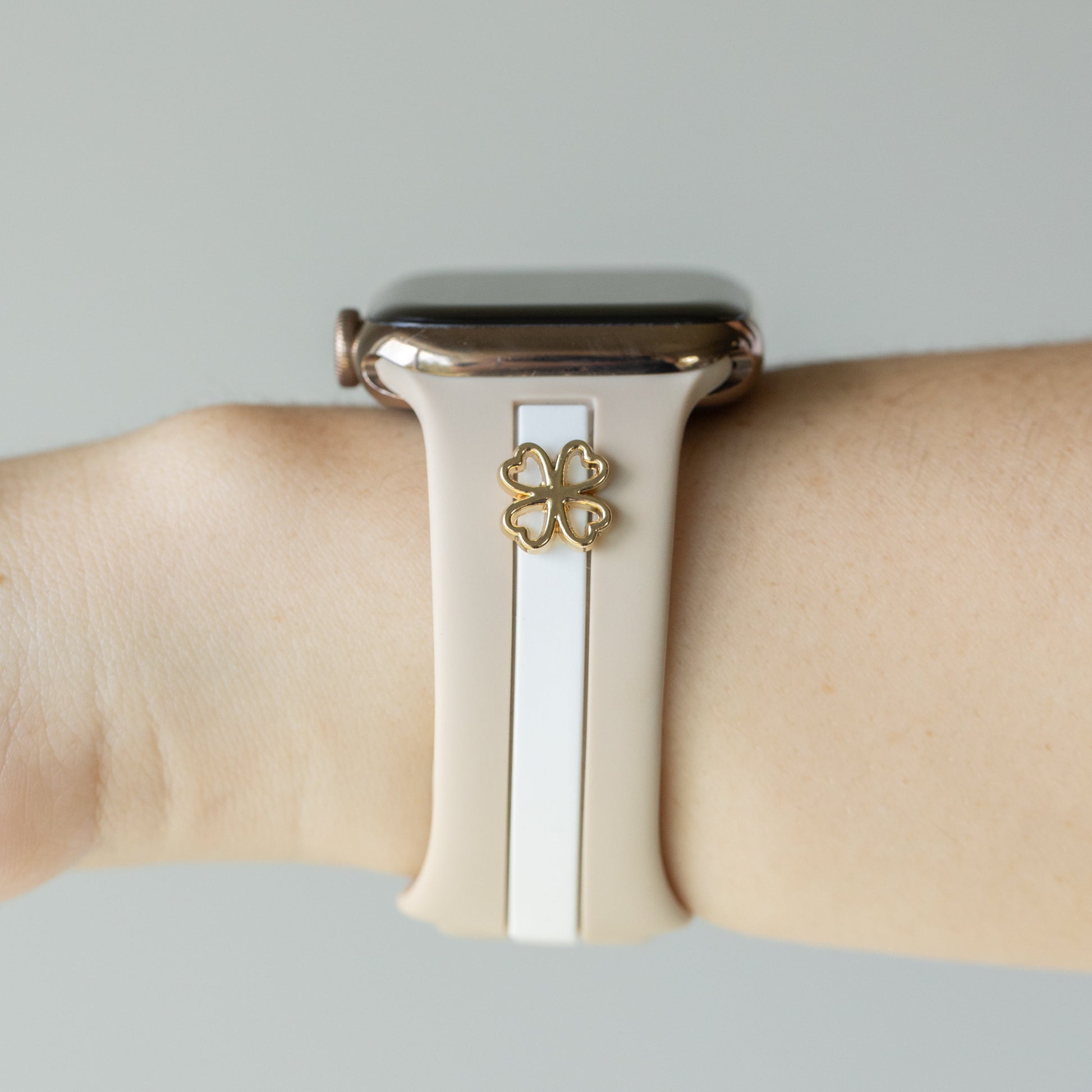 This band is designer-esque, comfiest silicone with the cutest, delicate charm options in gold, rose gold, or silver.