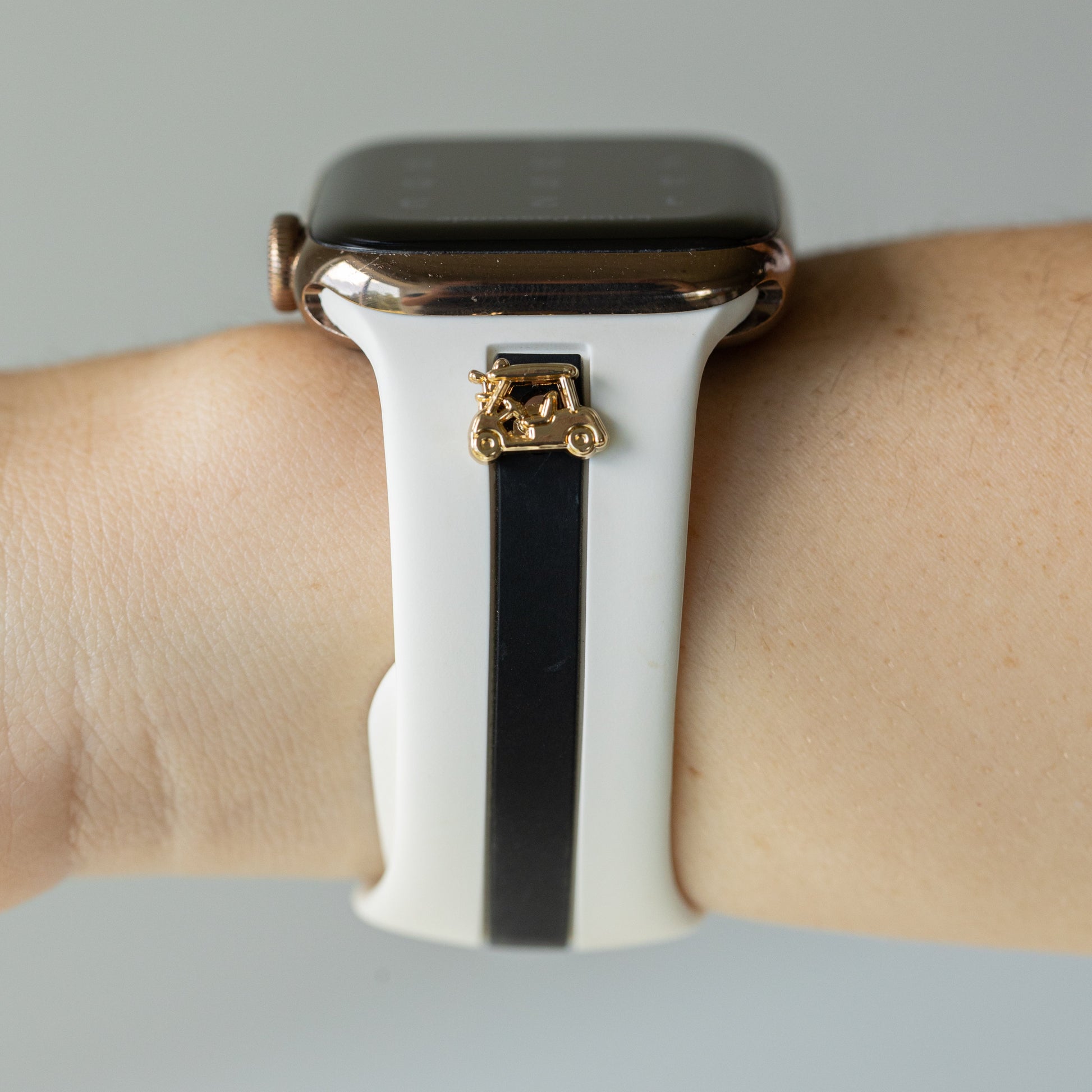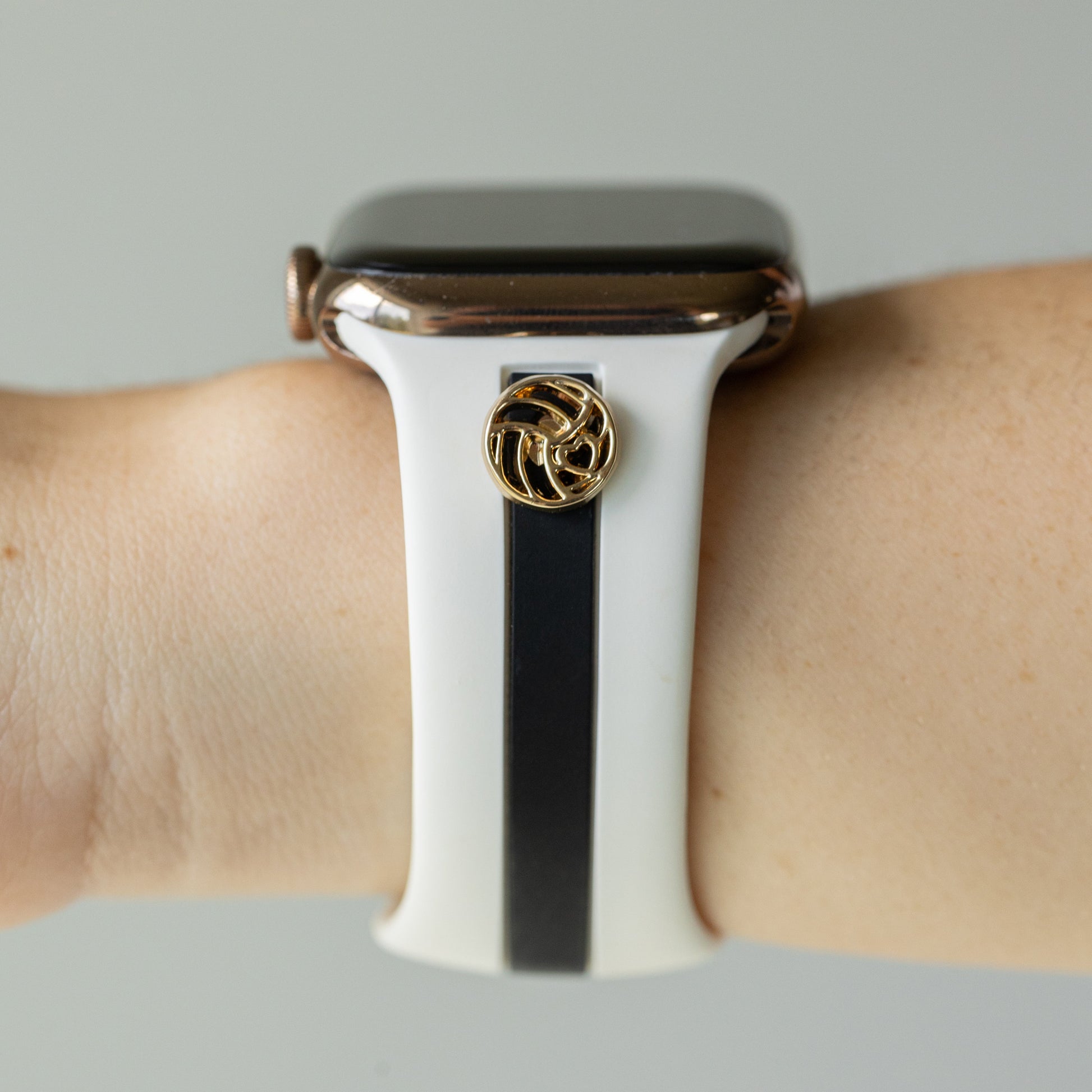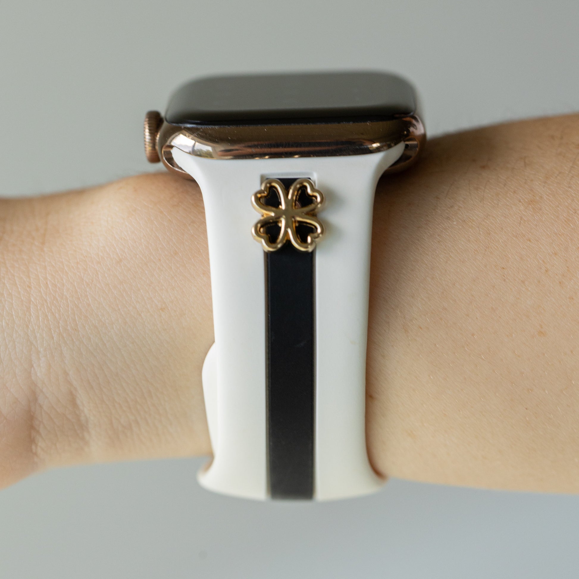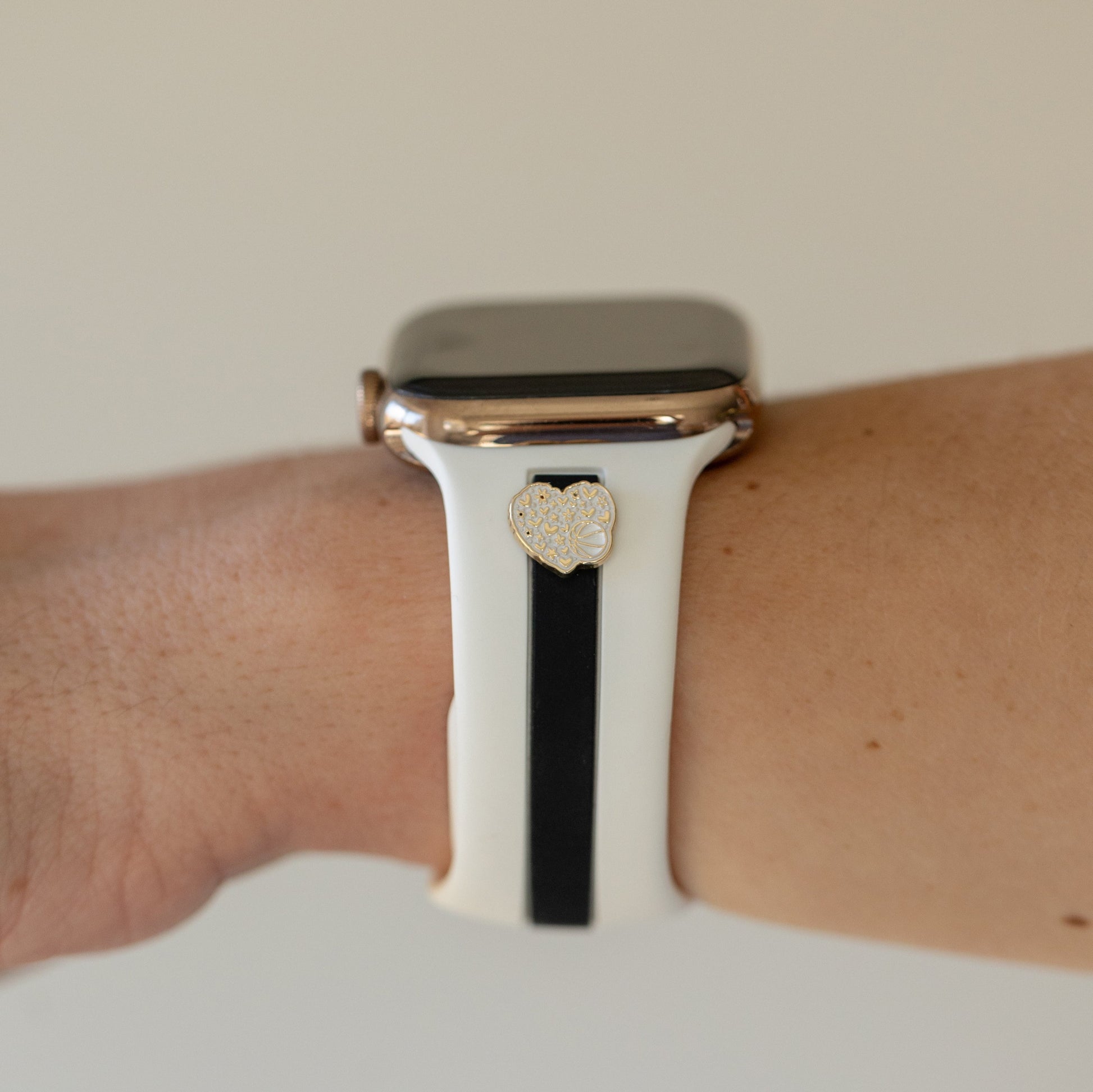 This band is designer-esque, comfiest silicone with the cutest, delicate charm options in gold, rose gold, or silver.