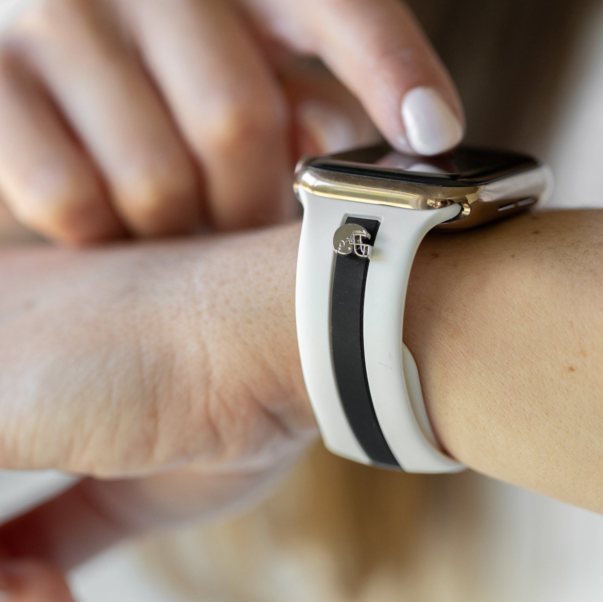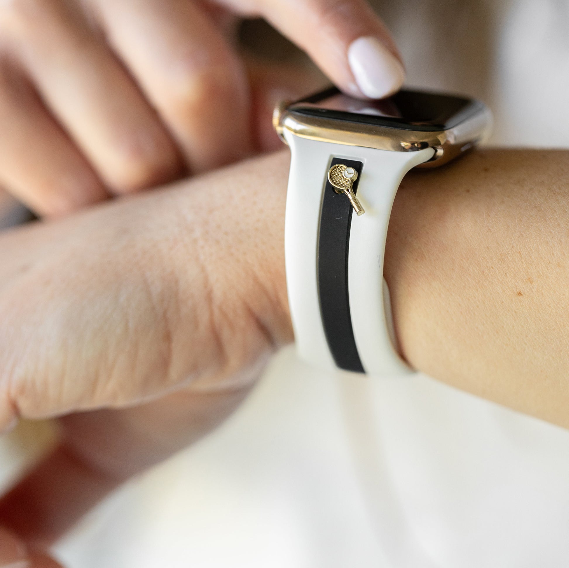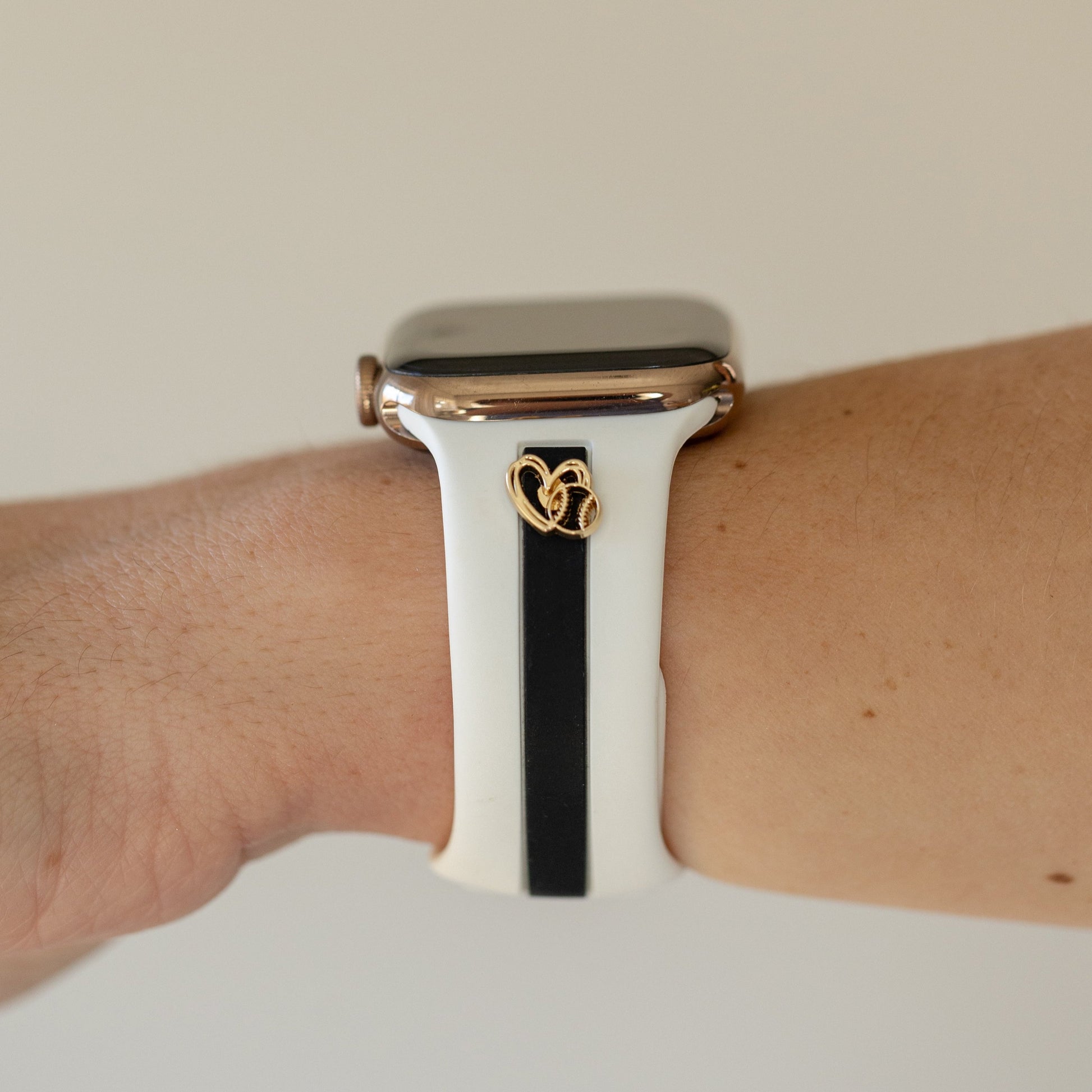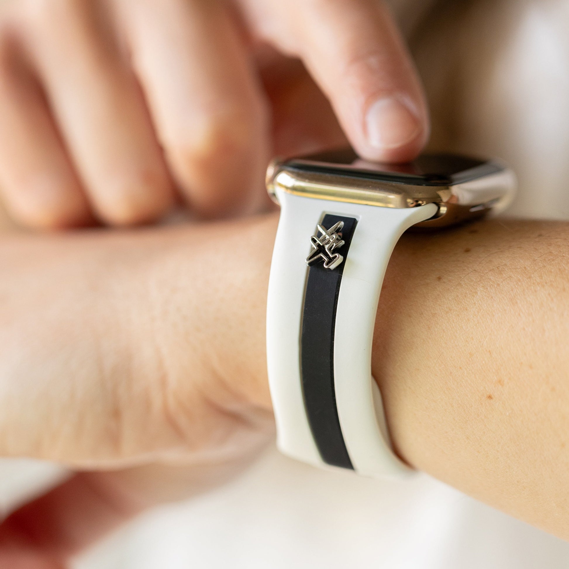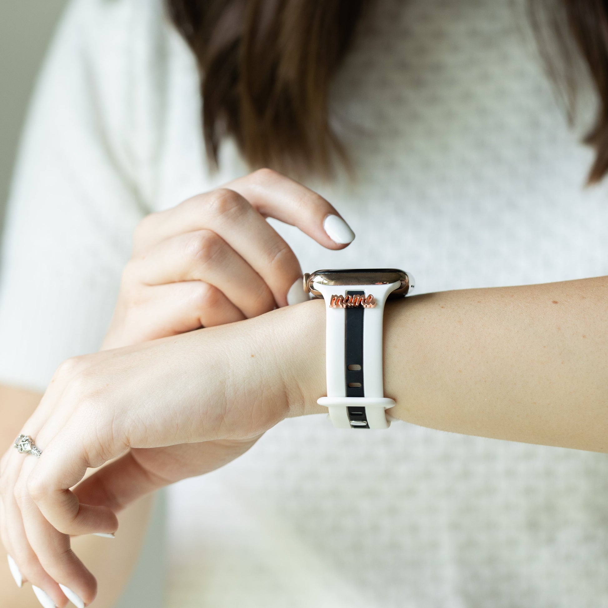 This band is designer-esque, comfiest silicone with the cutest, delicate charm options in gold, rose gold, or silver.