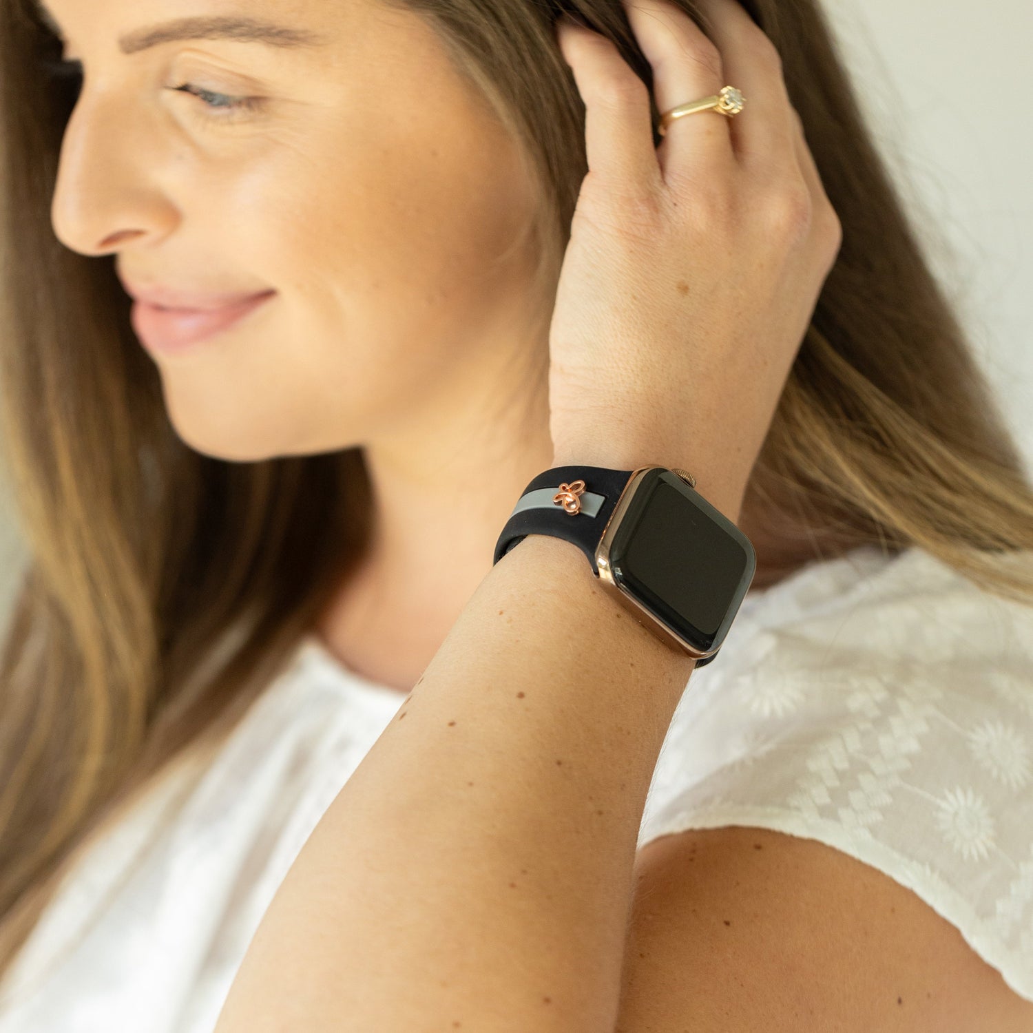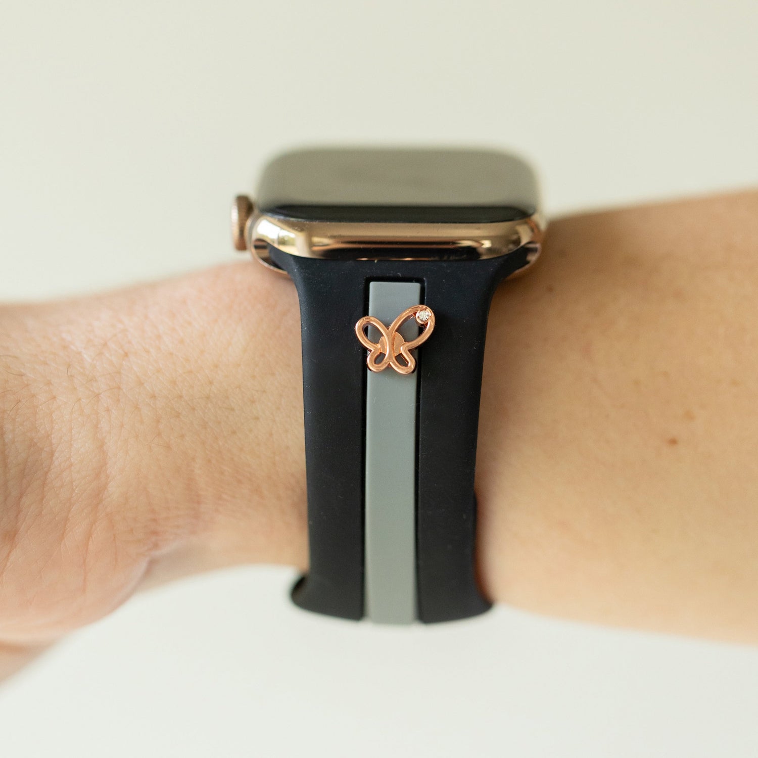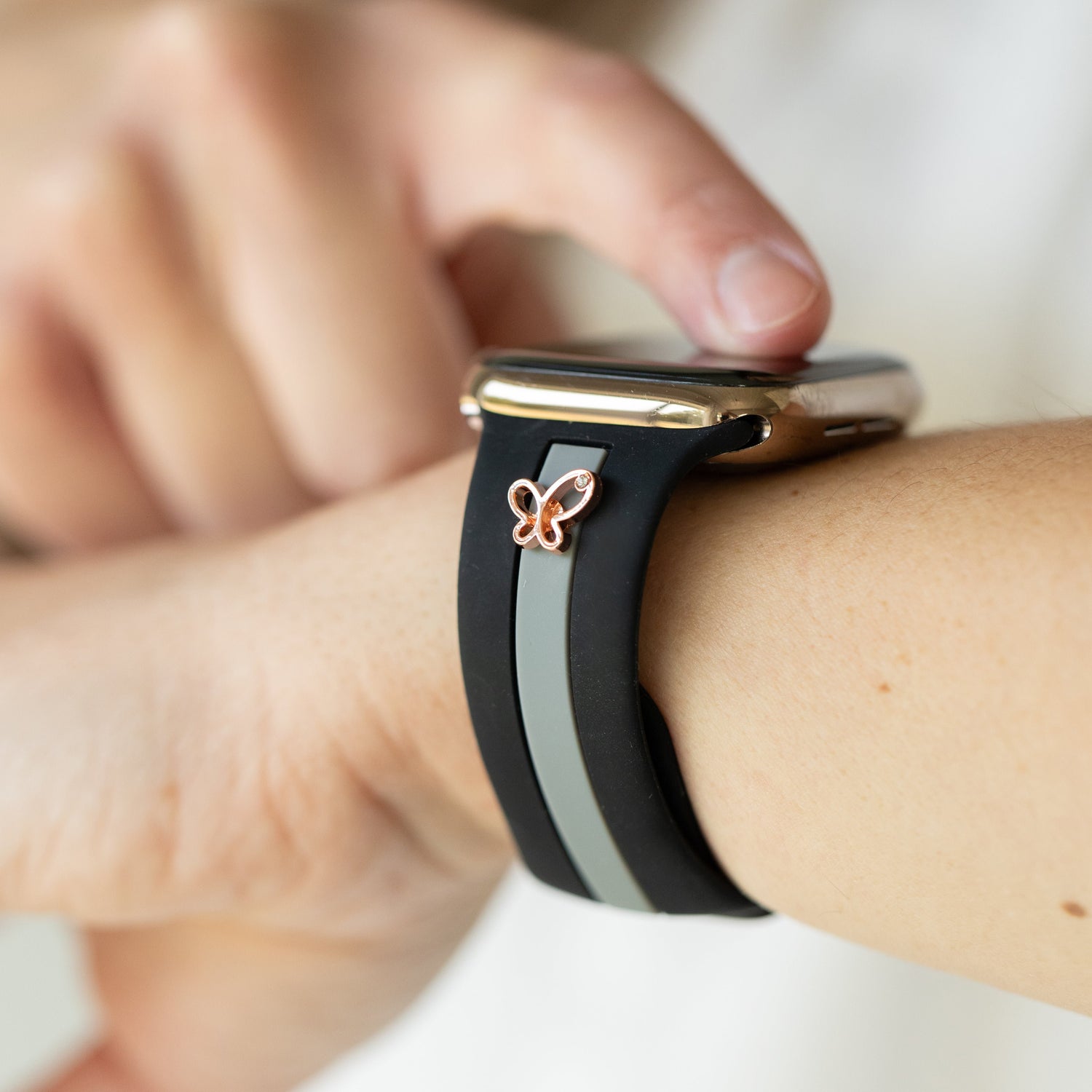 This Apple Watch band features our original molded band (nothing painted on printed on) high quality, soft, comfortable and beautifullll! You have a choice of a pair of butterfly charms in either gold, silver or rose gold finish.