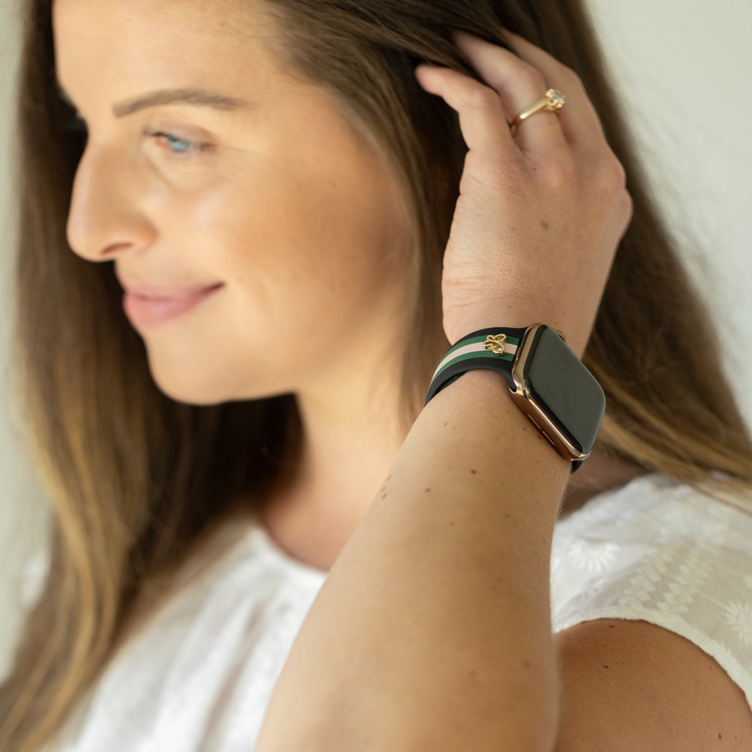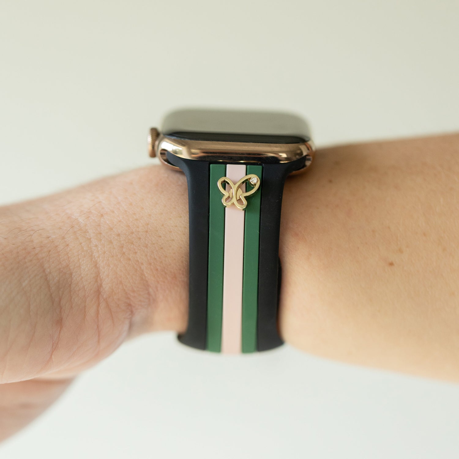 This Apple Watch band features our original molded band (nothing painted on printed on) high quality, soft, comfortable and beautifullll! You have a choice of a pair of butterfly charms in either gold, silver or rose gold finish.
