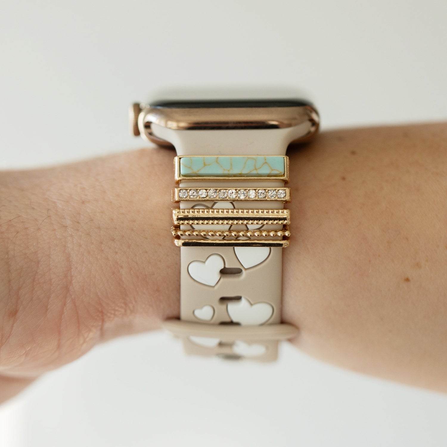 This stunning molded, leopard textured silicone band, is adorned with turquoise stone, and rhinestone charms. Charms are available in gold and silver. It is made from the softest silicone, to give you the most comfortable fit. You can wear it all day, as its luxe design makes it perfect for work, and play. It also makes the perfect gift.