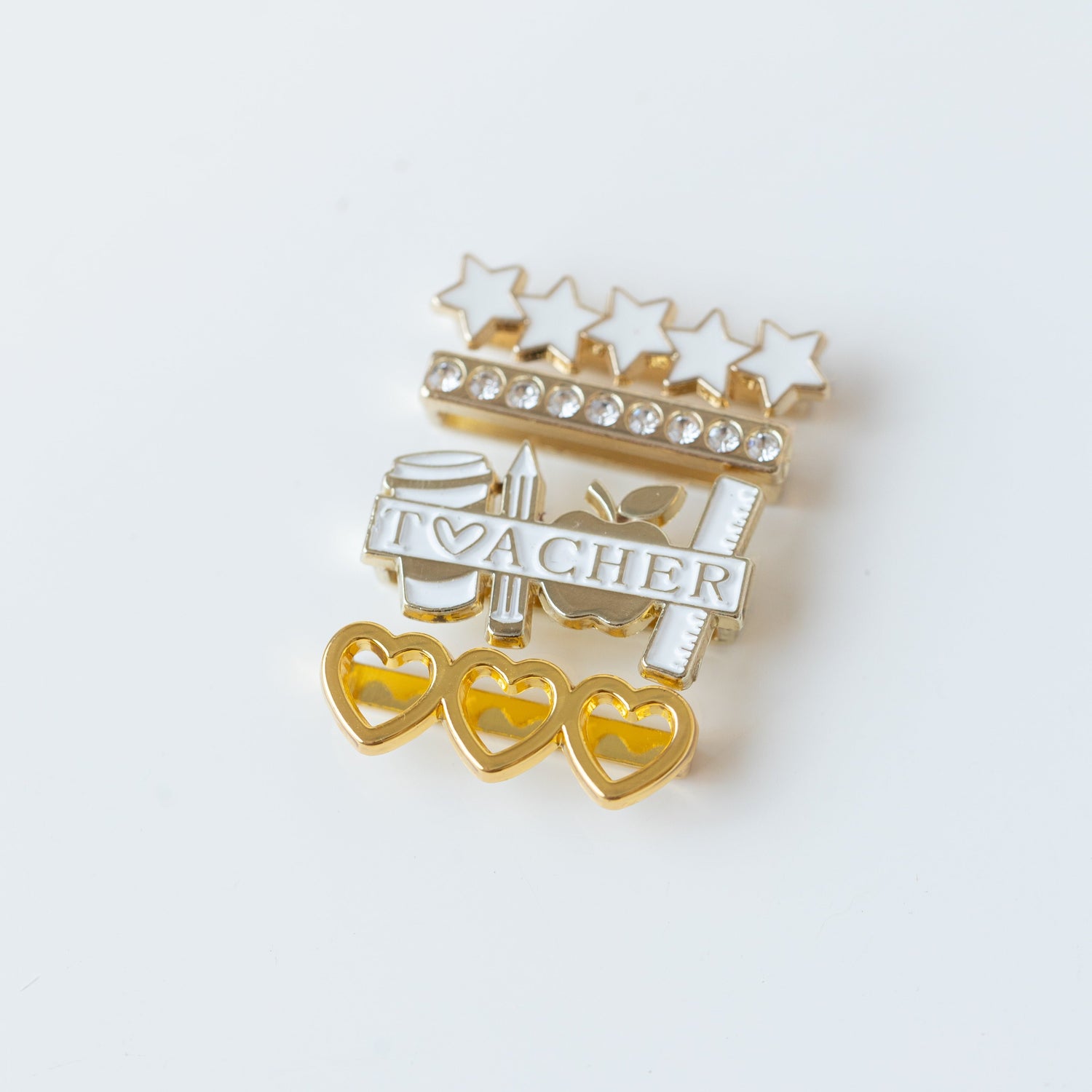 "For The Teachers". This 4-piece watch band charm set features delicate gold, white enamel, and rhinestone accents. Pair this charm set with our limited edition Candy Red Apple Love and Luxe watch band or purchase separately.