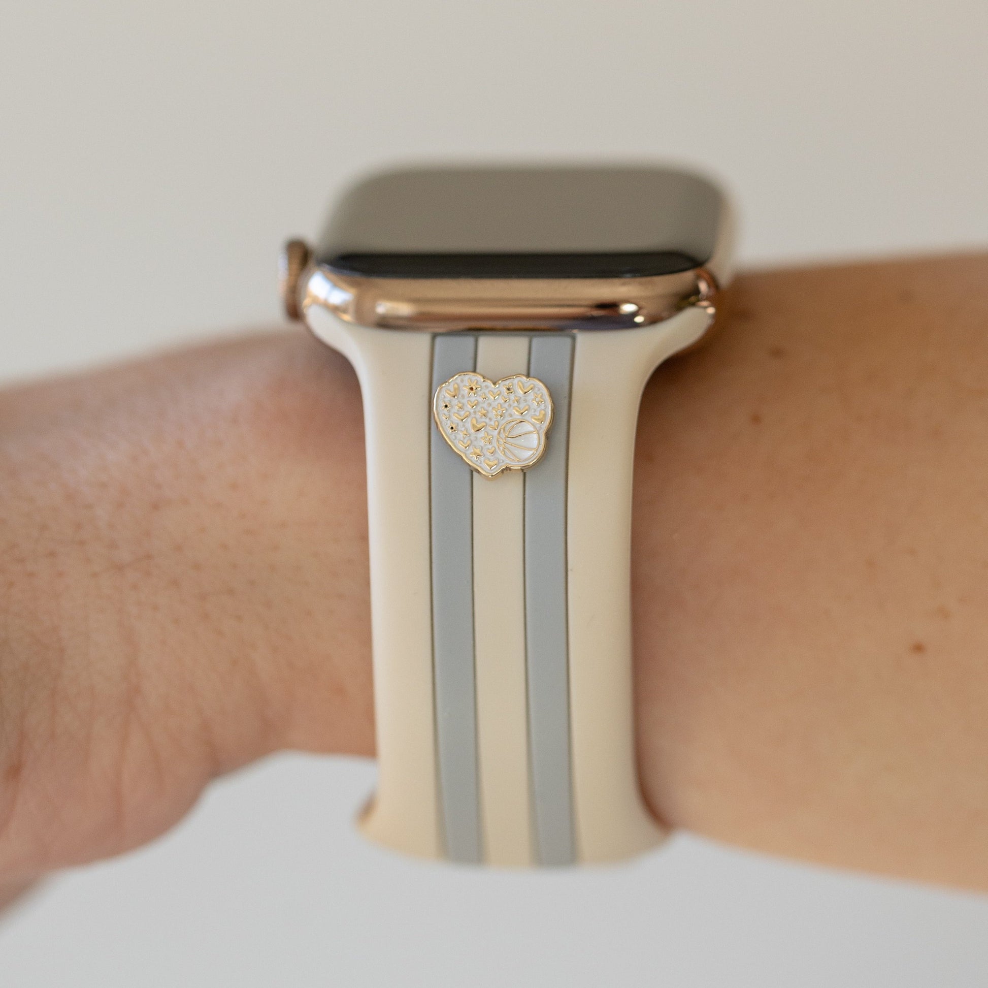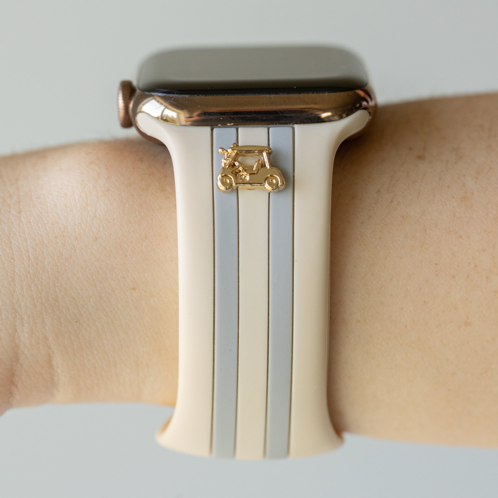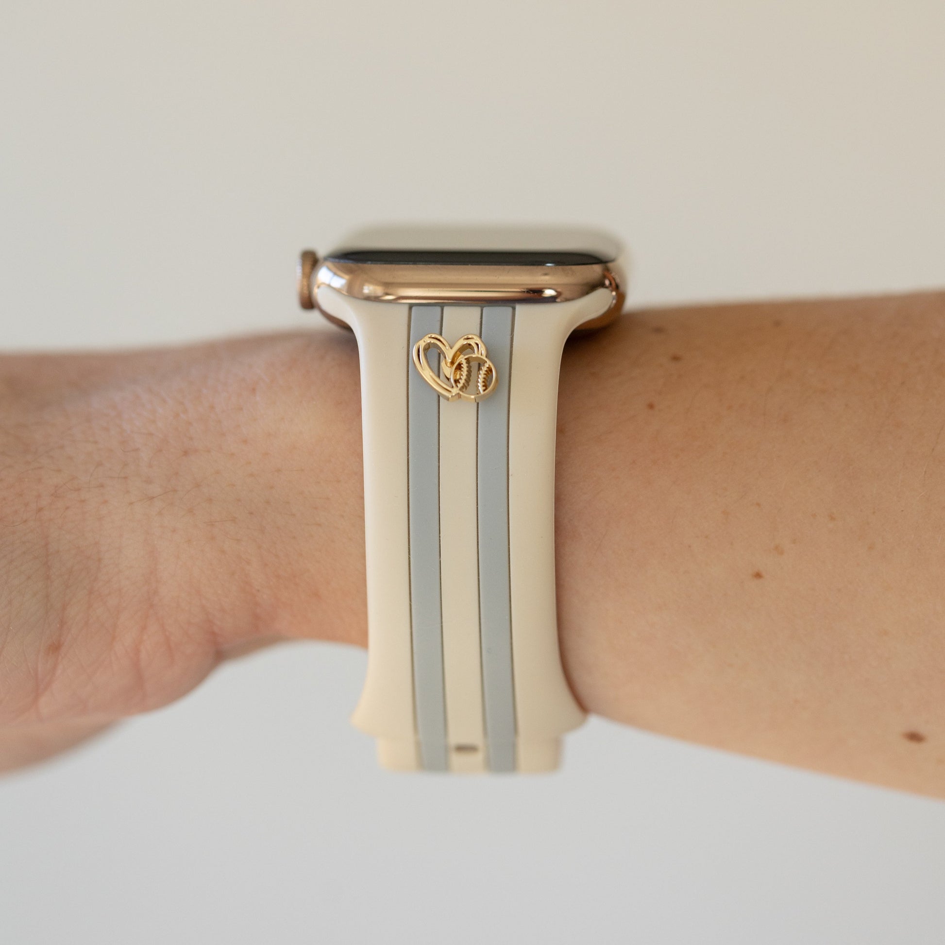 This band is designer-esque, comfiest silicone with the cutest, delicate charm options in gold, rose gold, or silver.