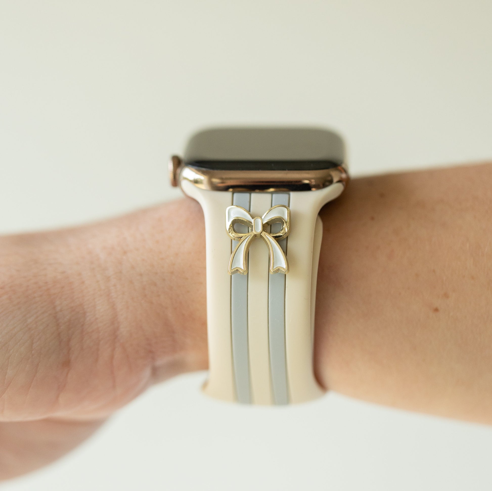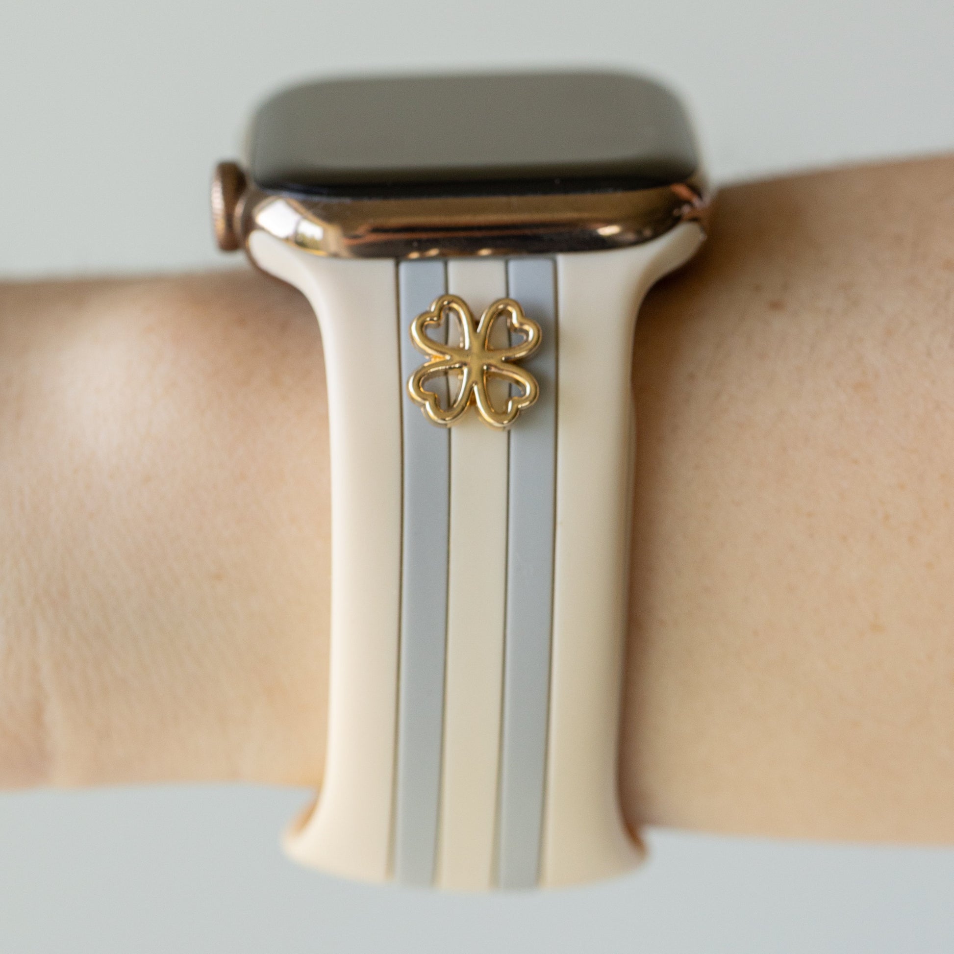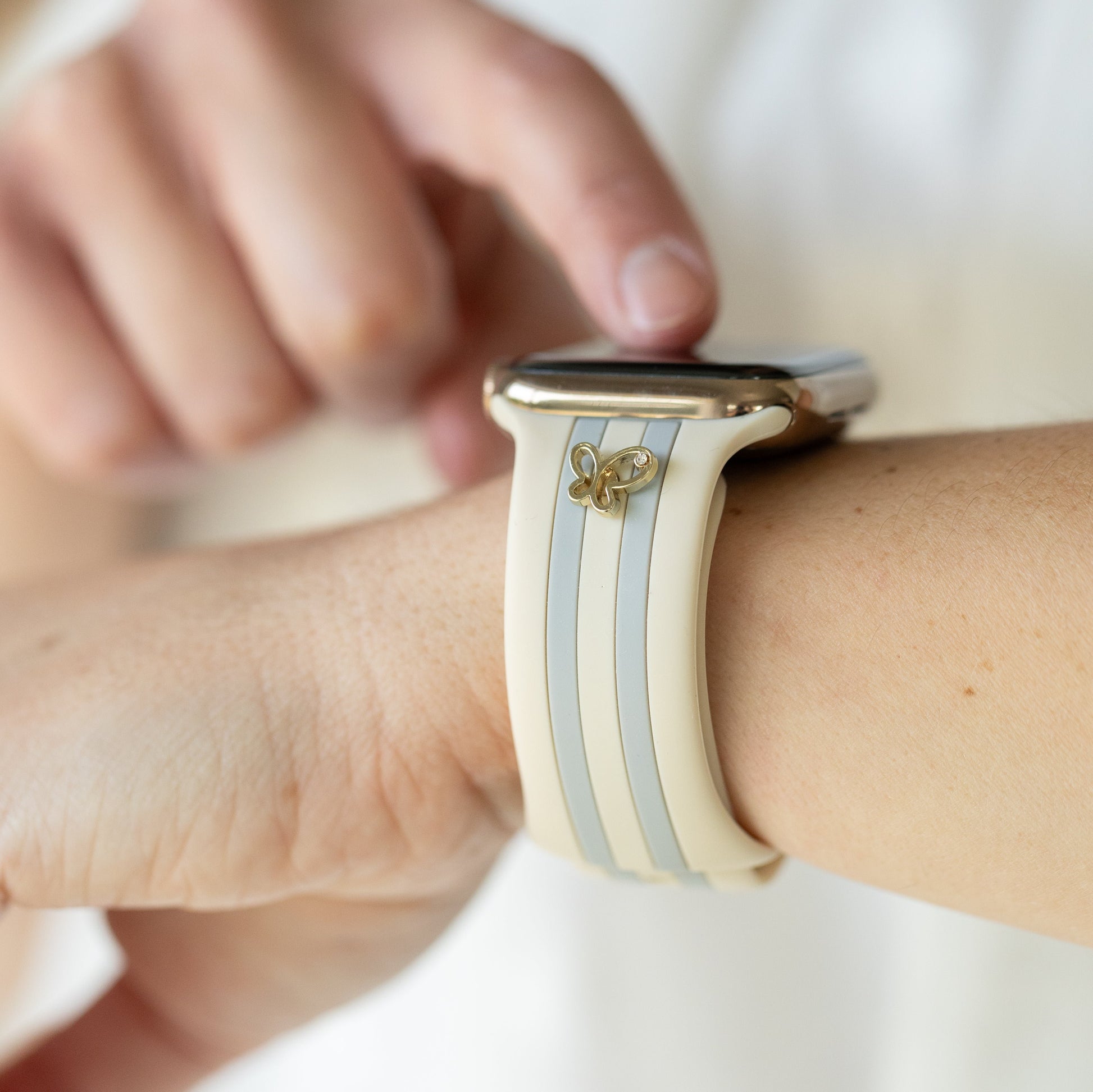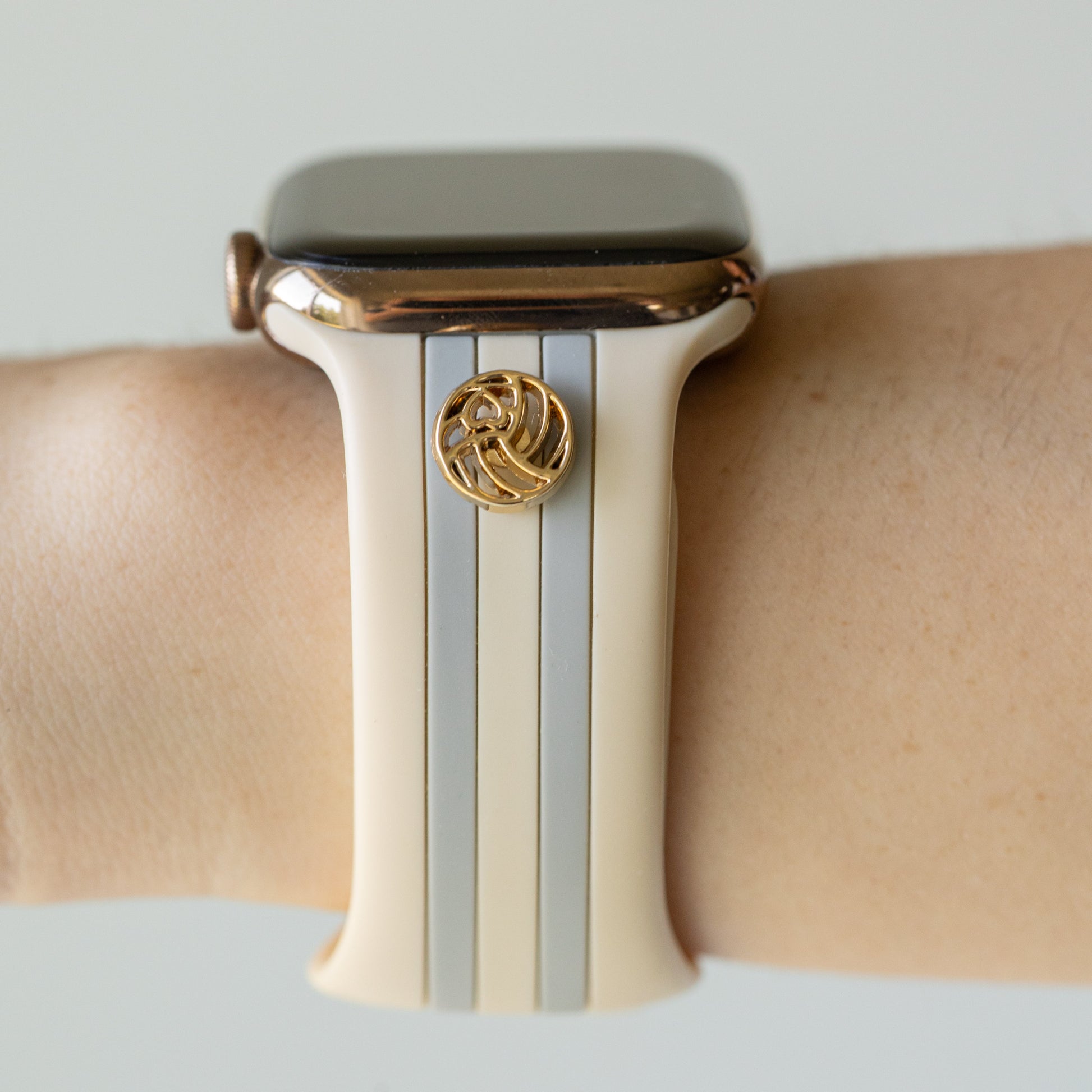 This band is designer-esque, comfiest silicone with the cutest, delicate charm options in gold, rose gold, or silver.