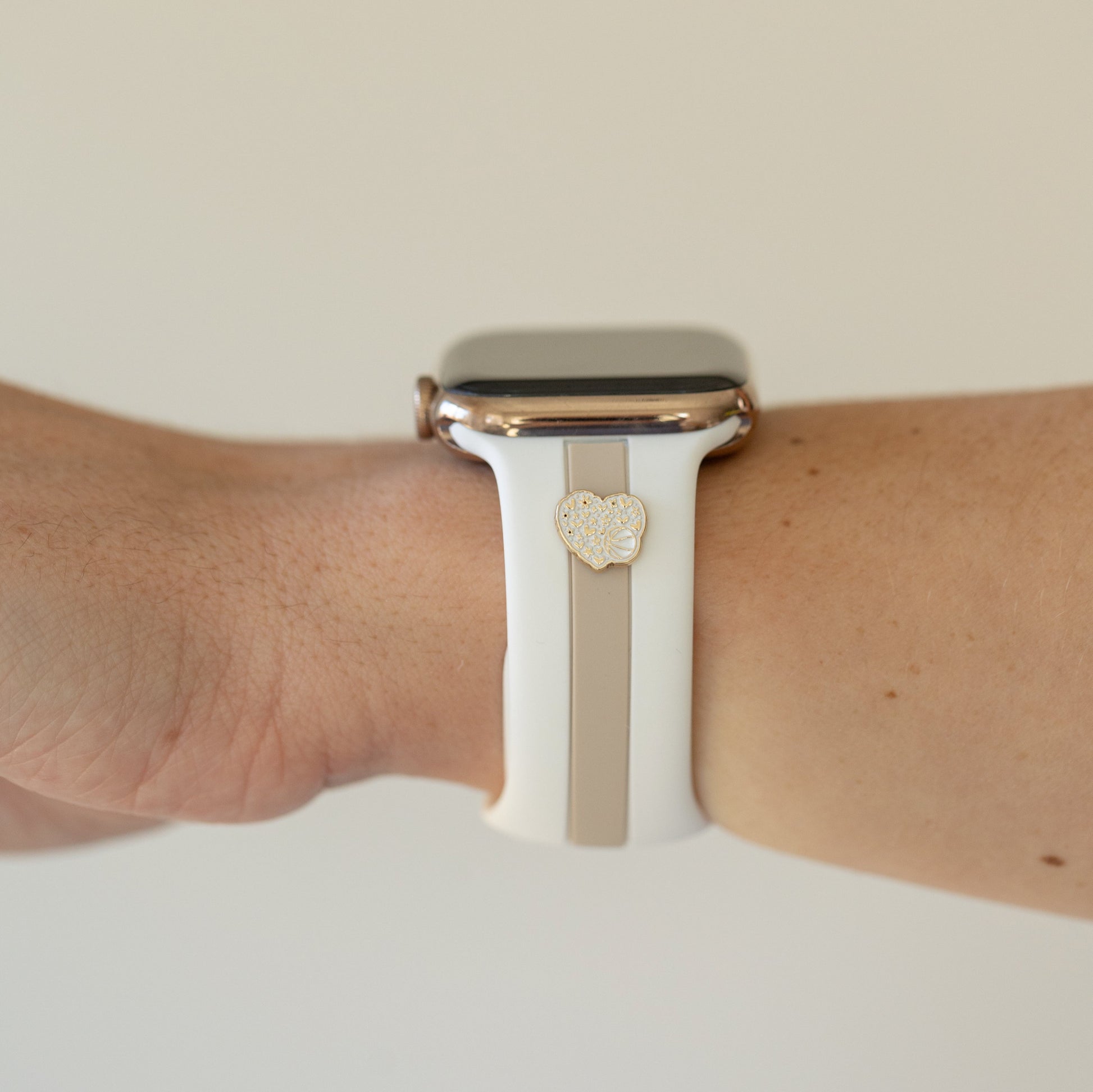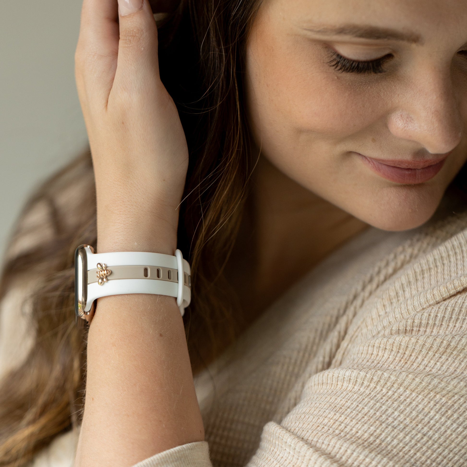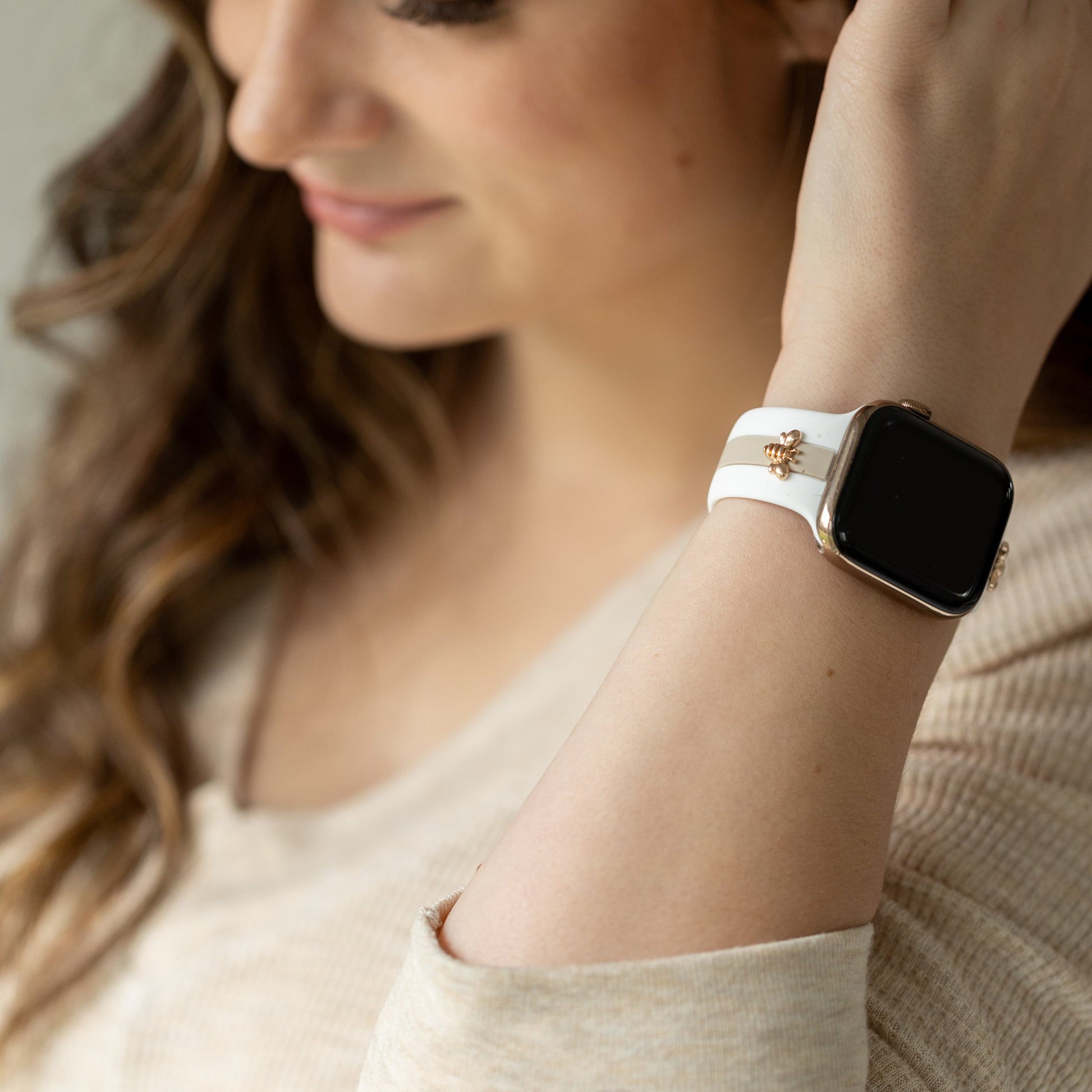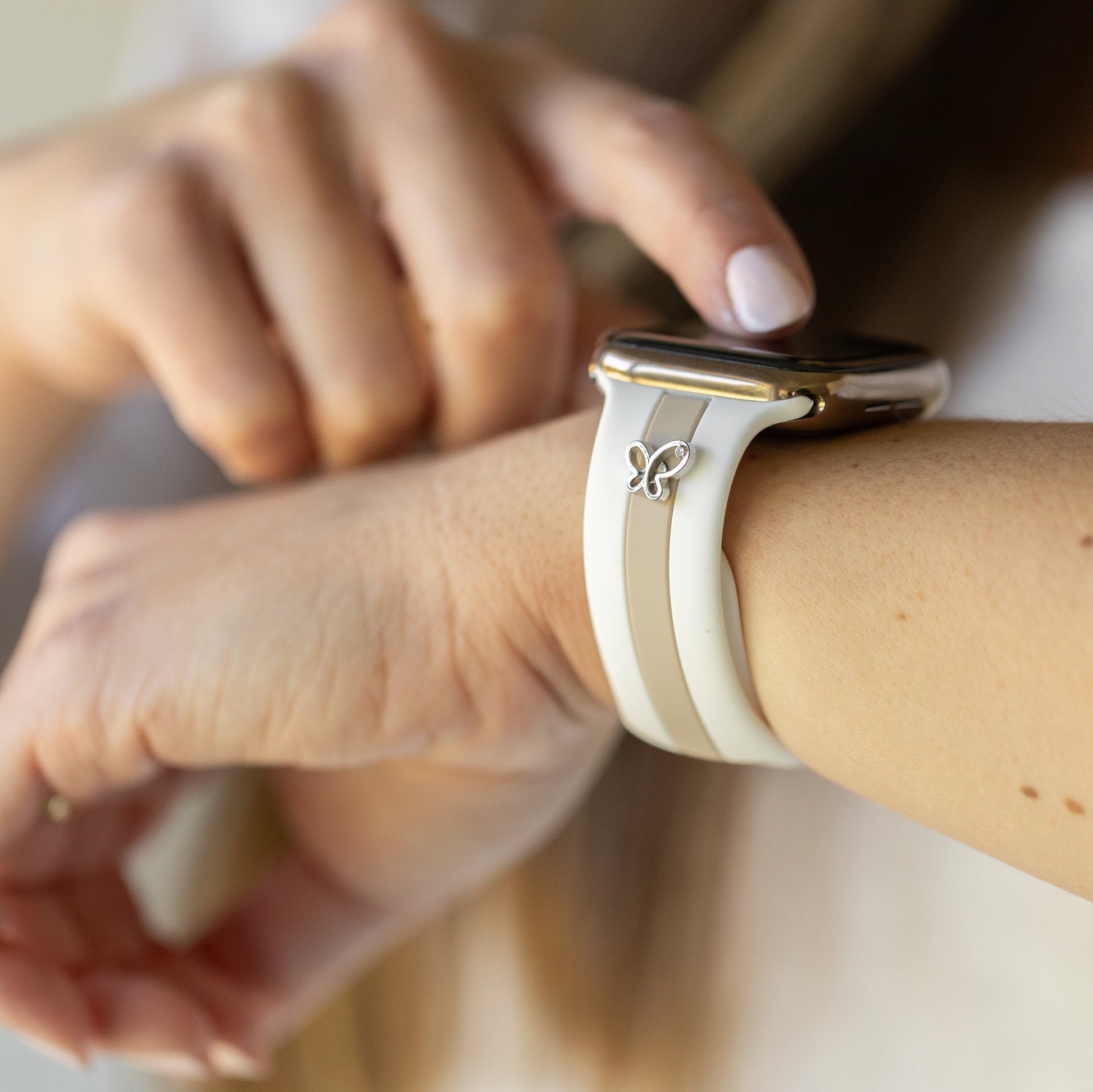 This band is designer-esque, comfiest silicone with the cutest, delicate charm options in gold, rose gold, or silver.