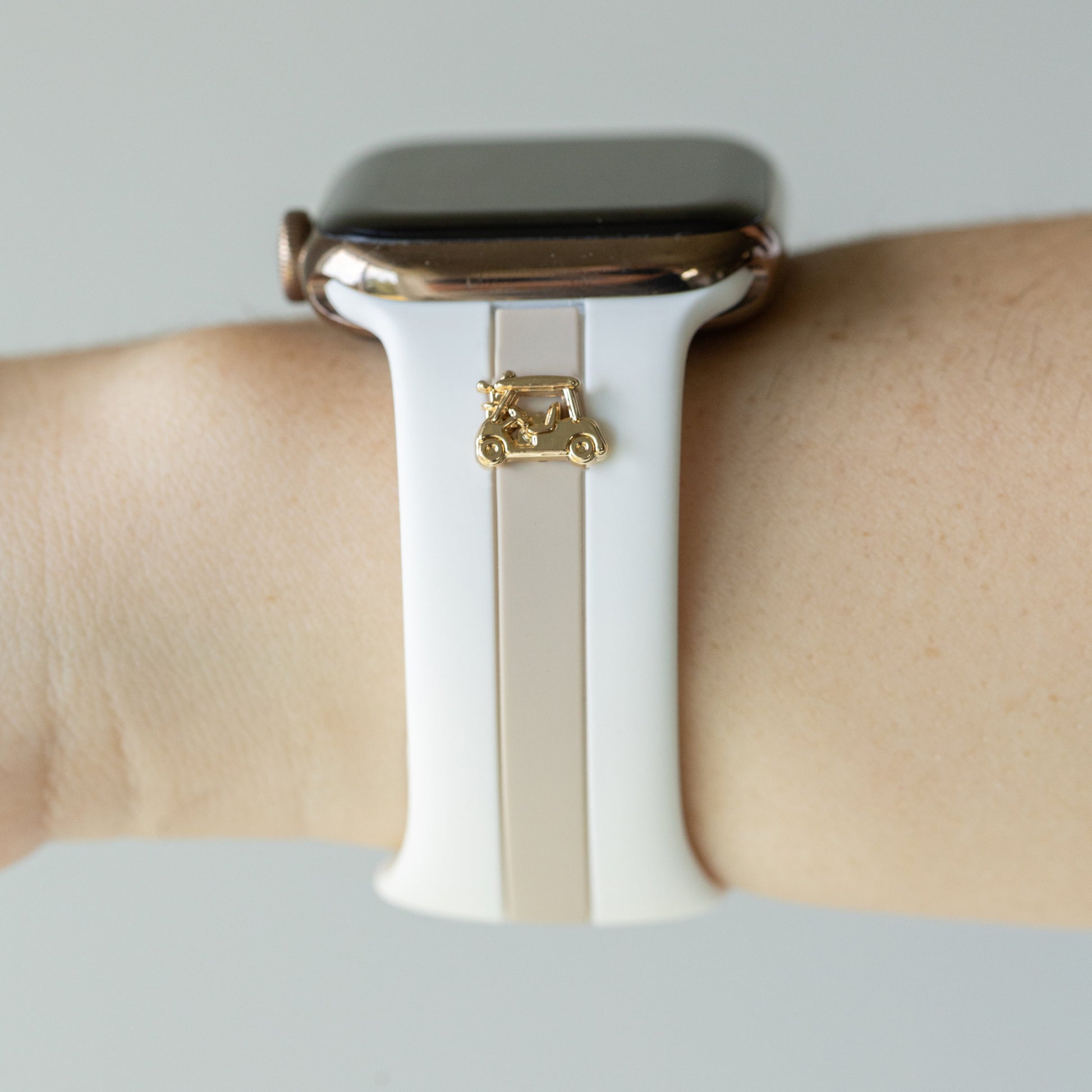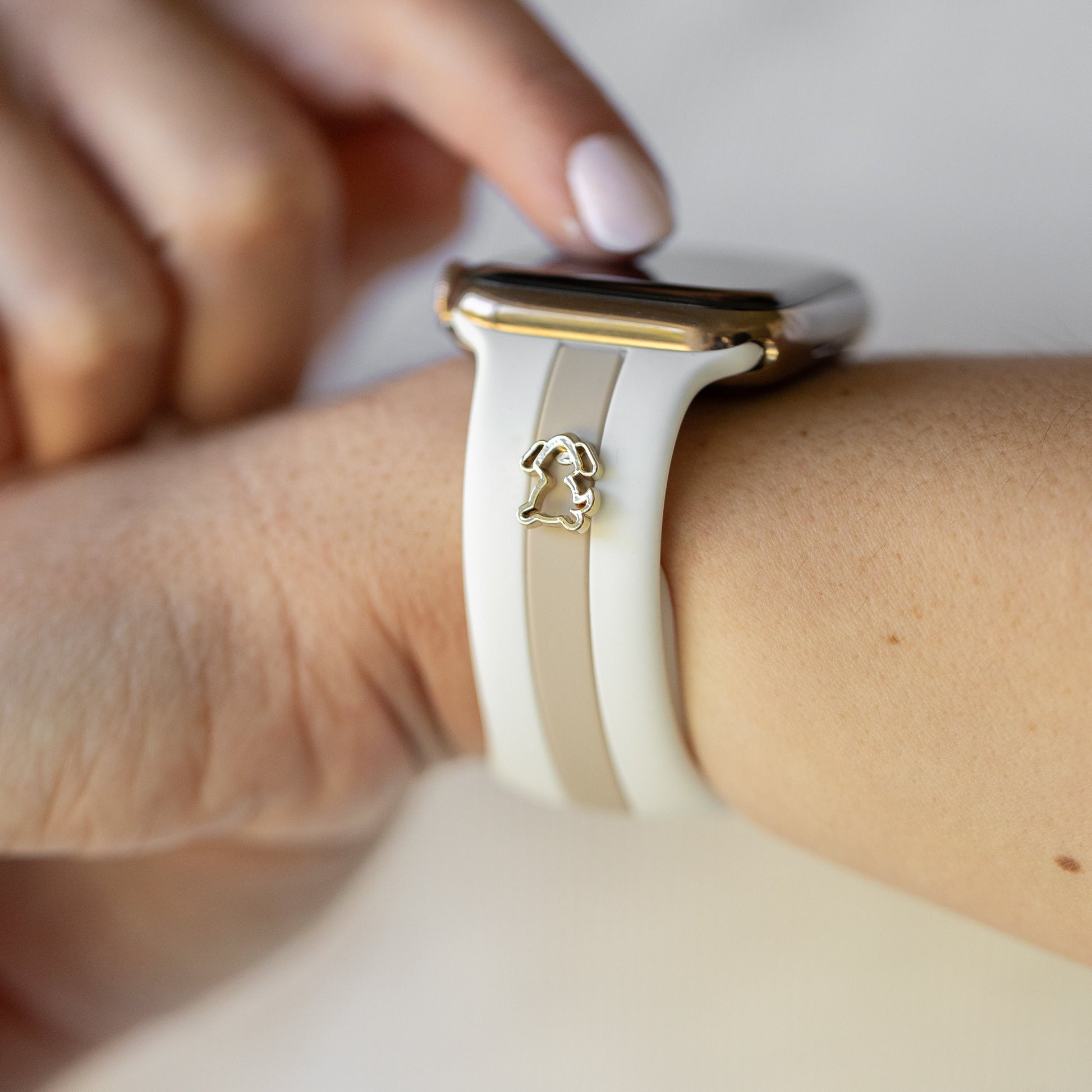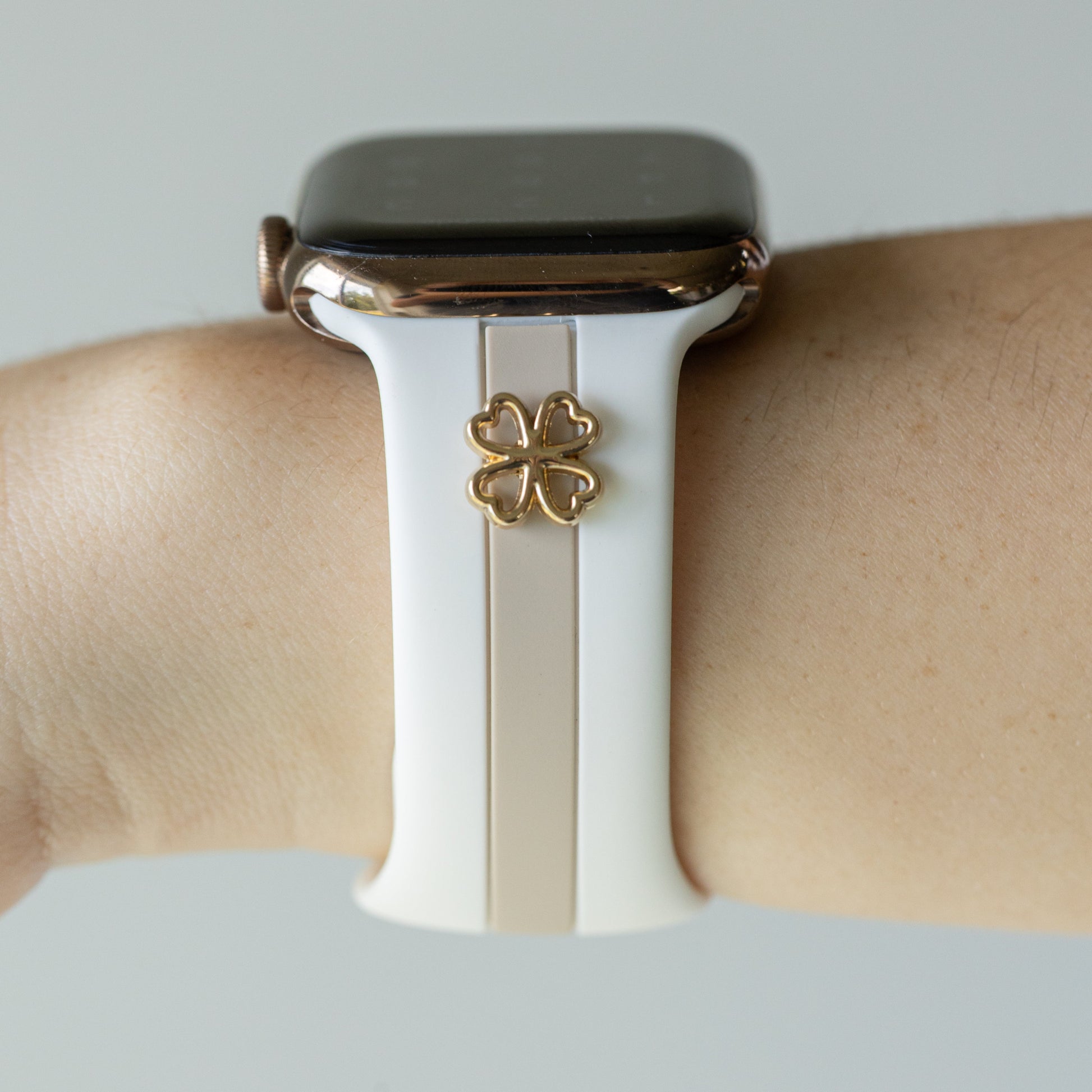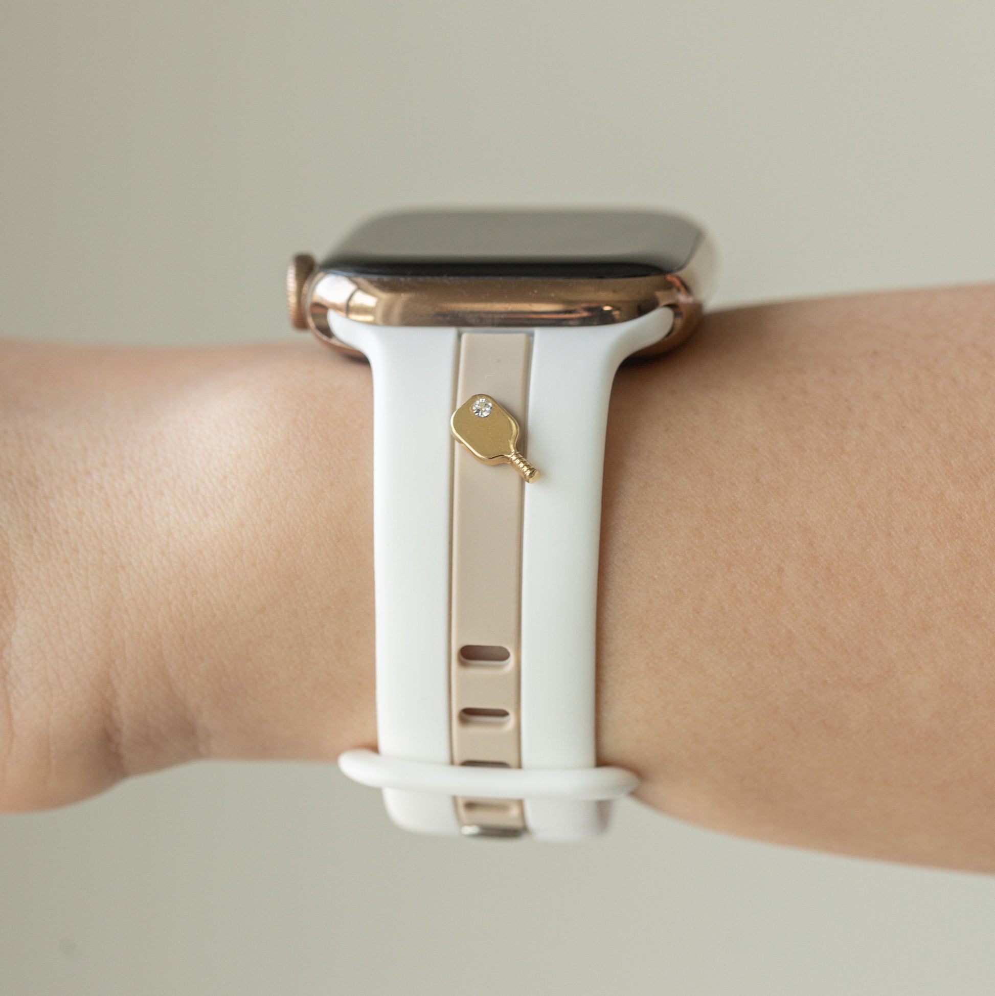 This band is designer-esque, comfiest silicone with the cutest, delicate charm options in gold, rose gold, or silver.