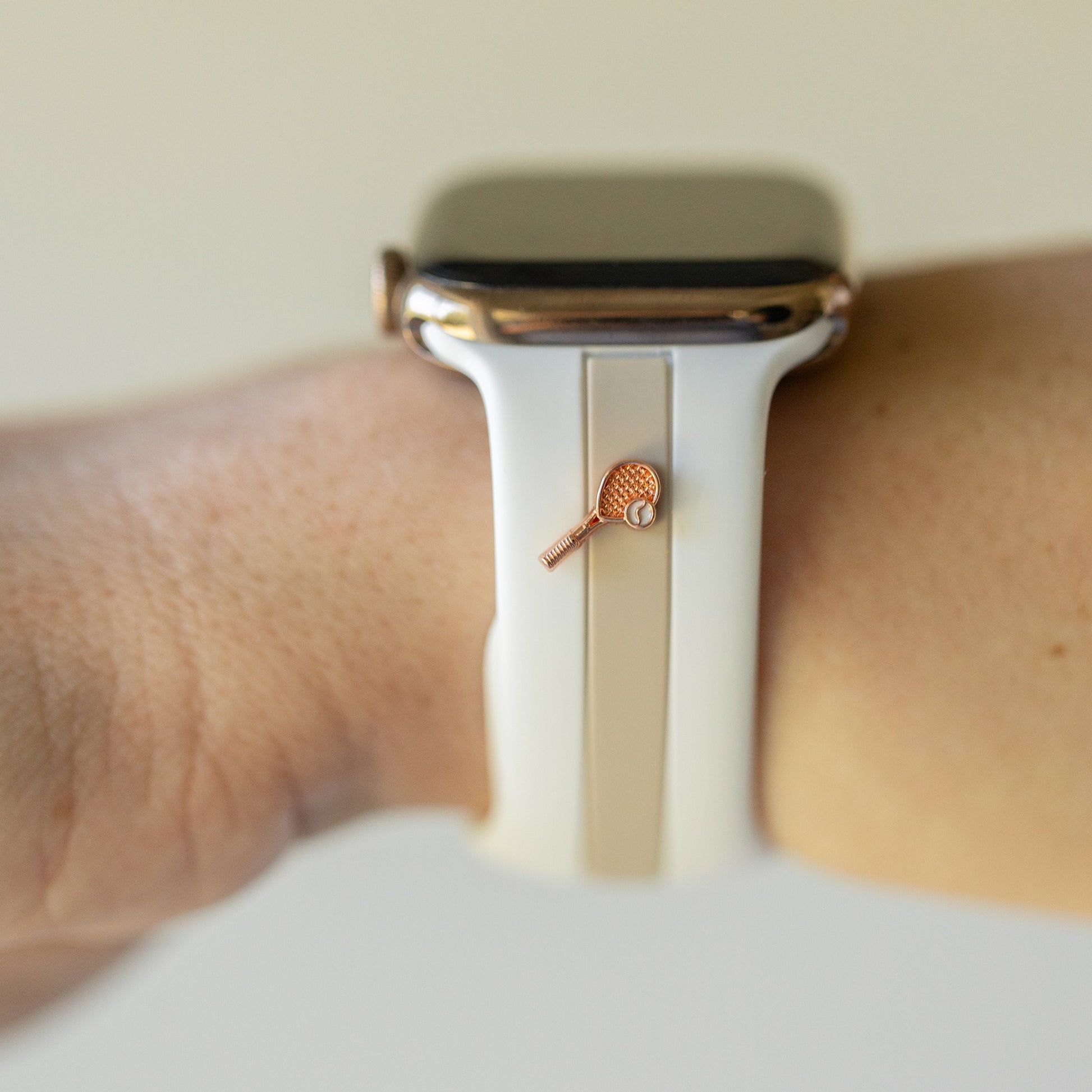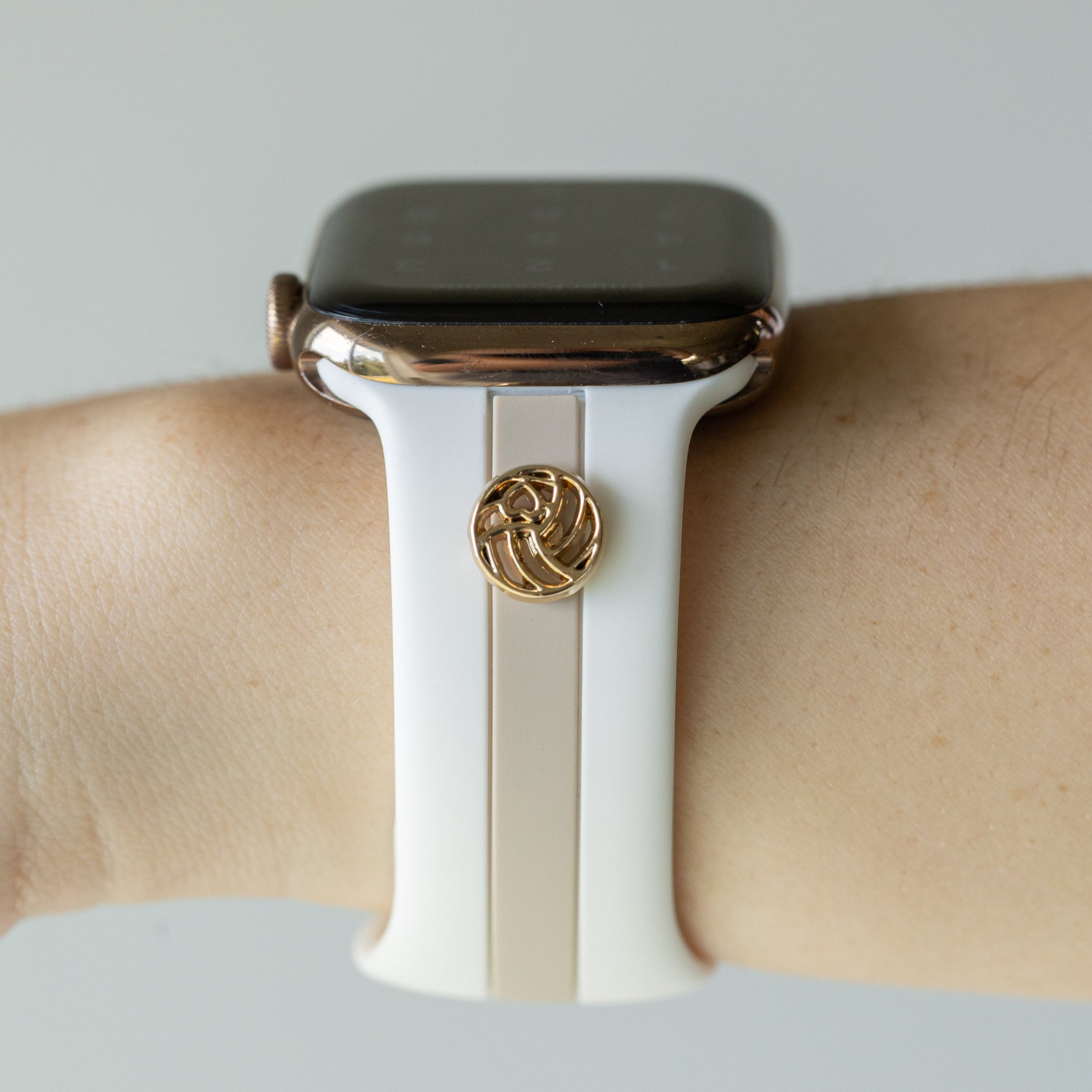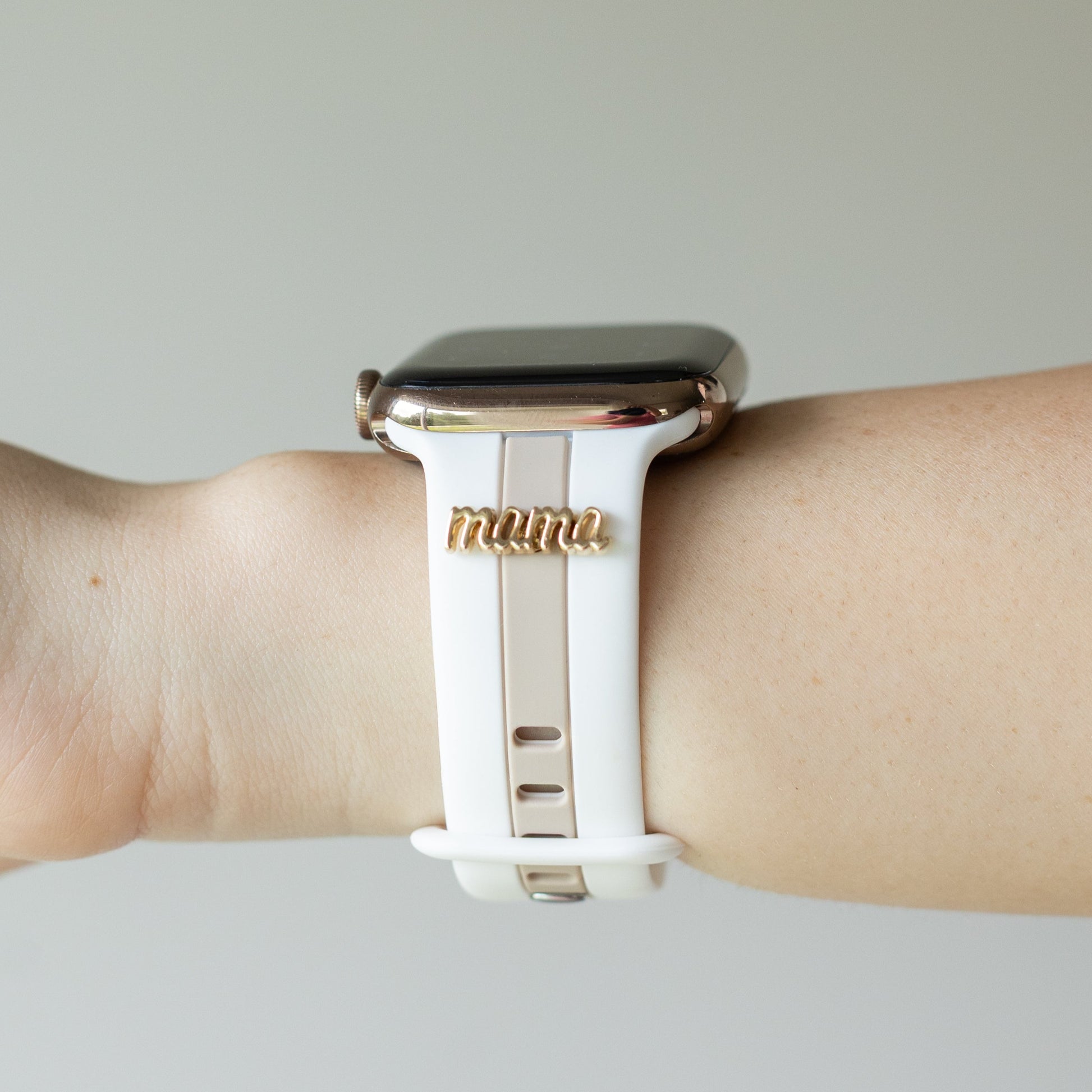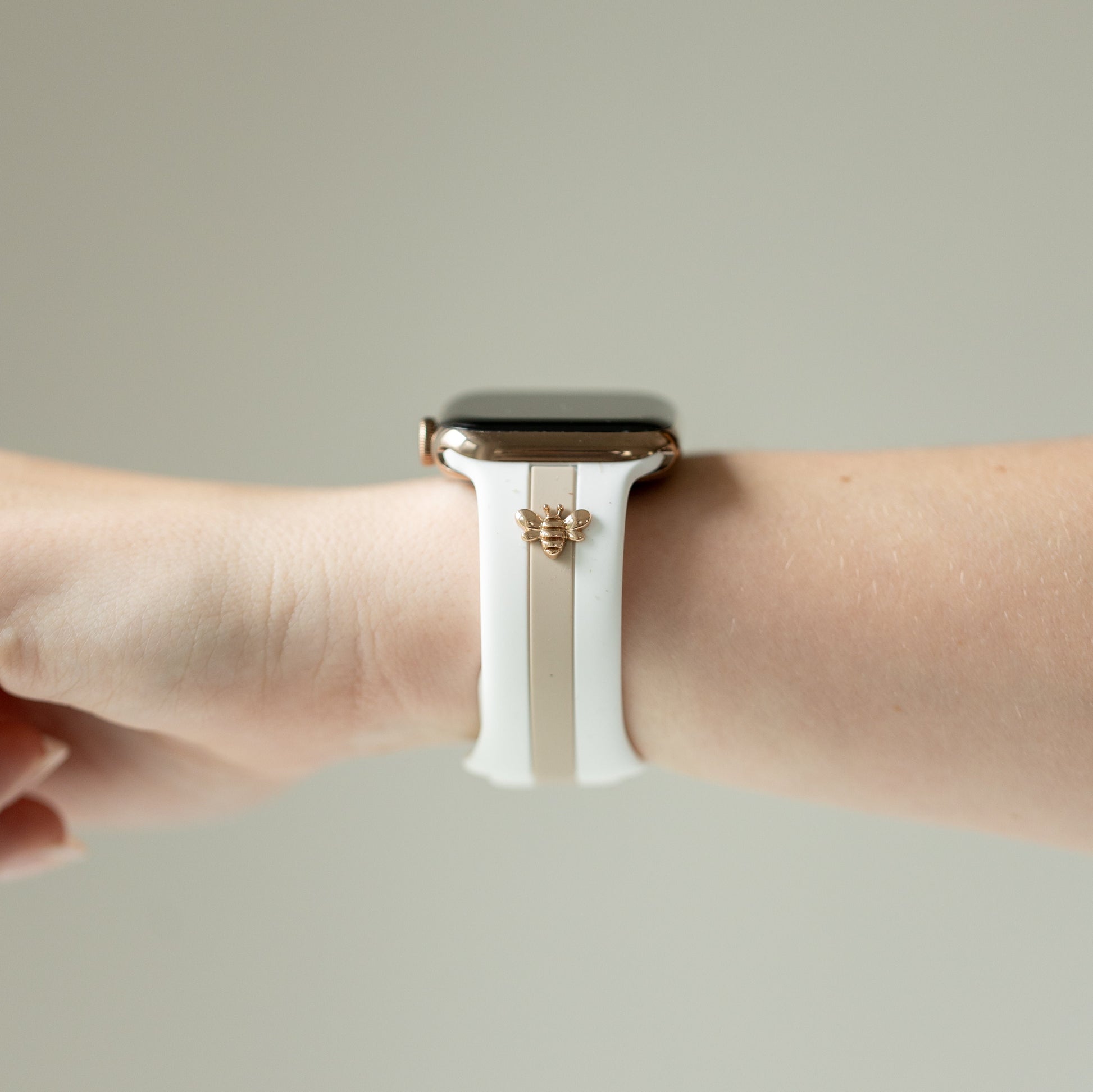 This band is designer-esque, comfiest silicone with the cutest, delicate charm options in gold, rose gold, or silver.