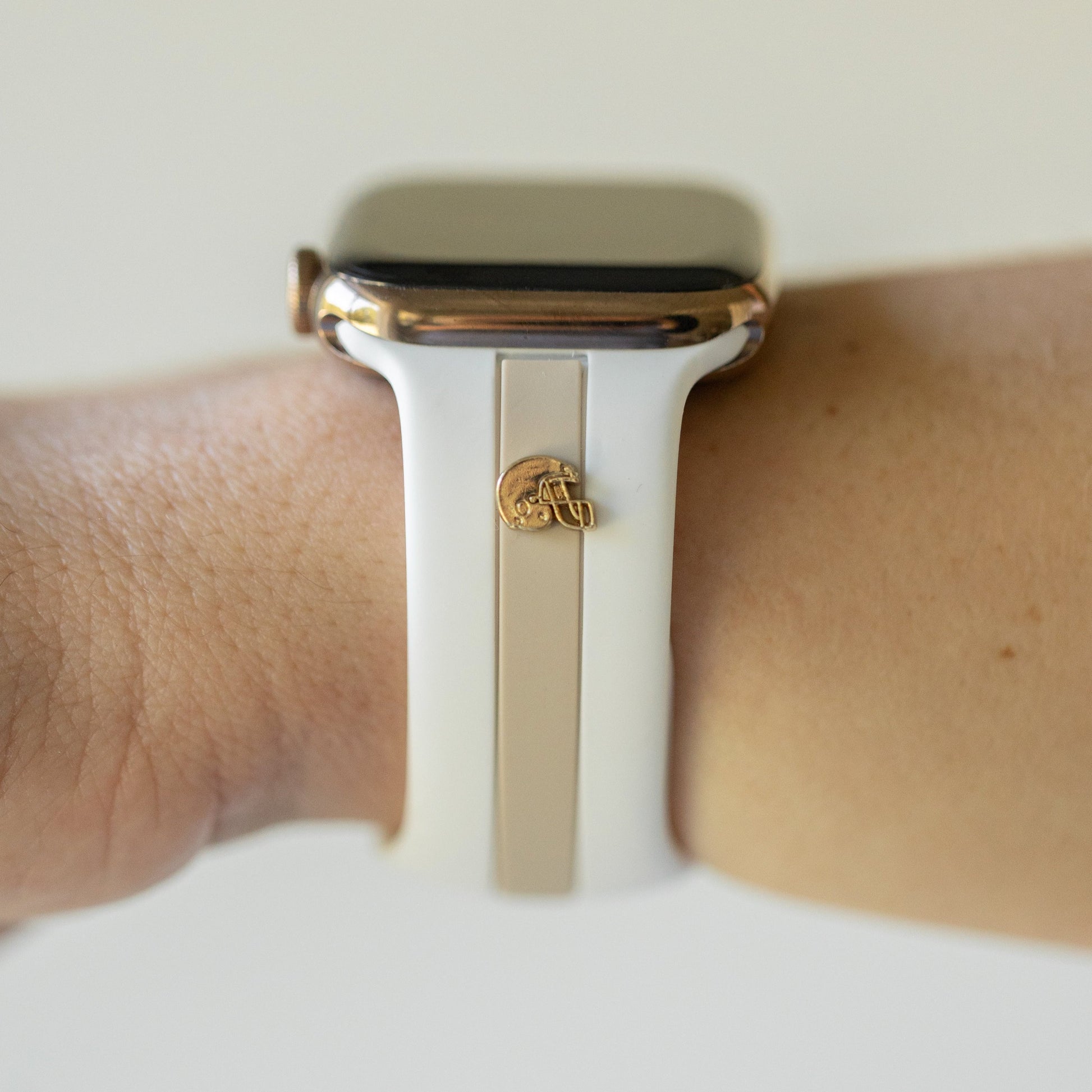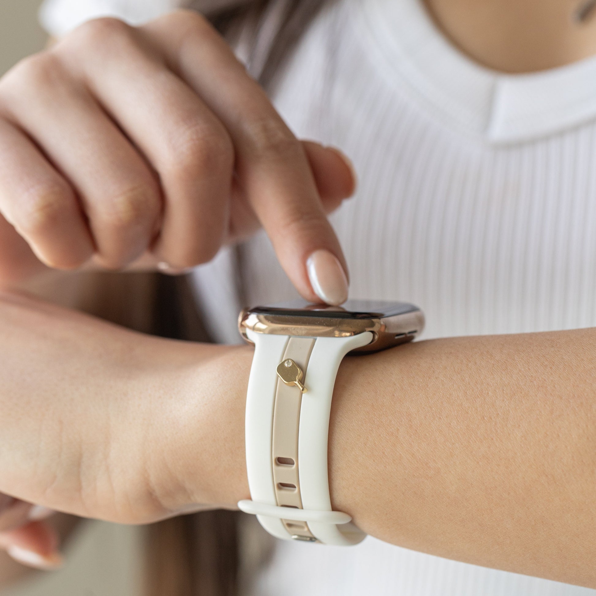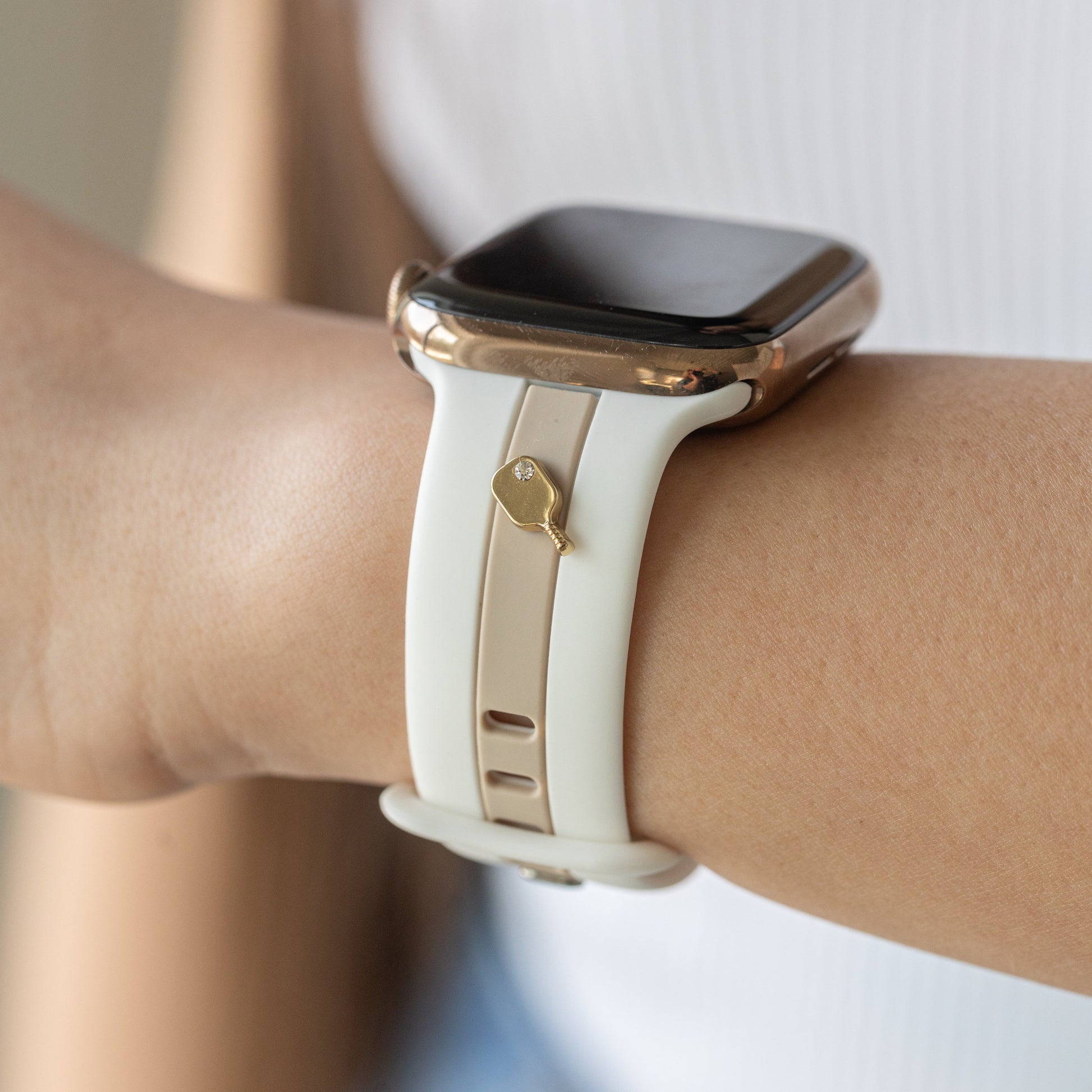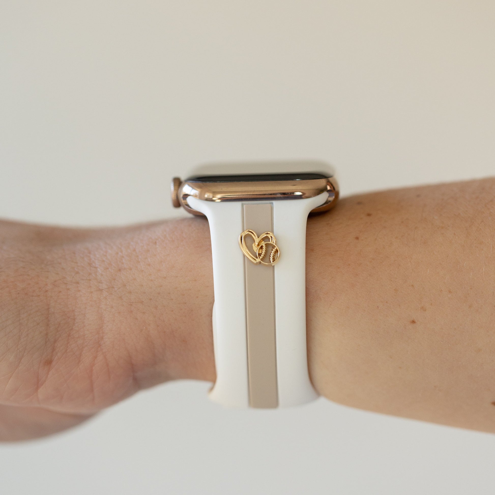 This band is designer-esque, comfiest silicone with the cutest, delicate charm options in gold, rose gold, or silver.