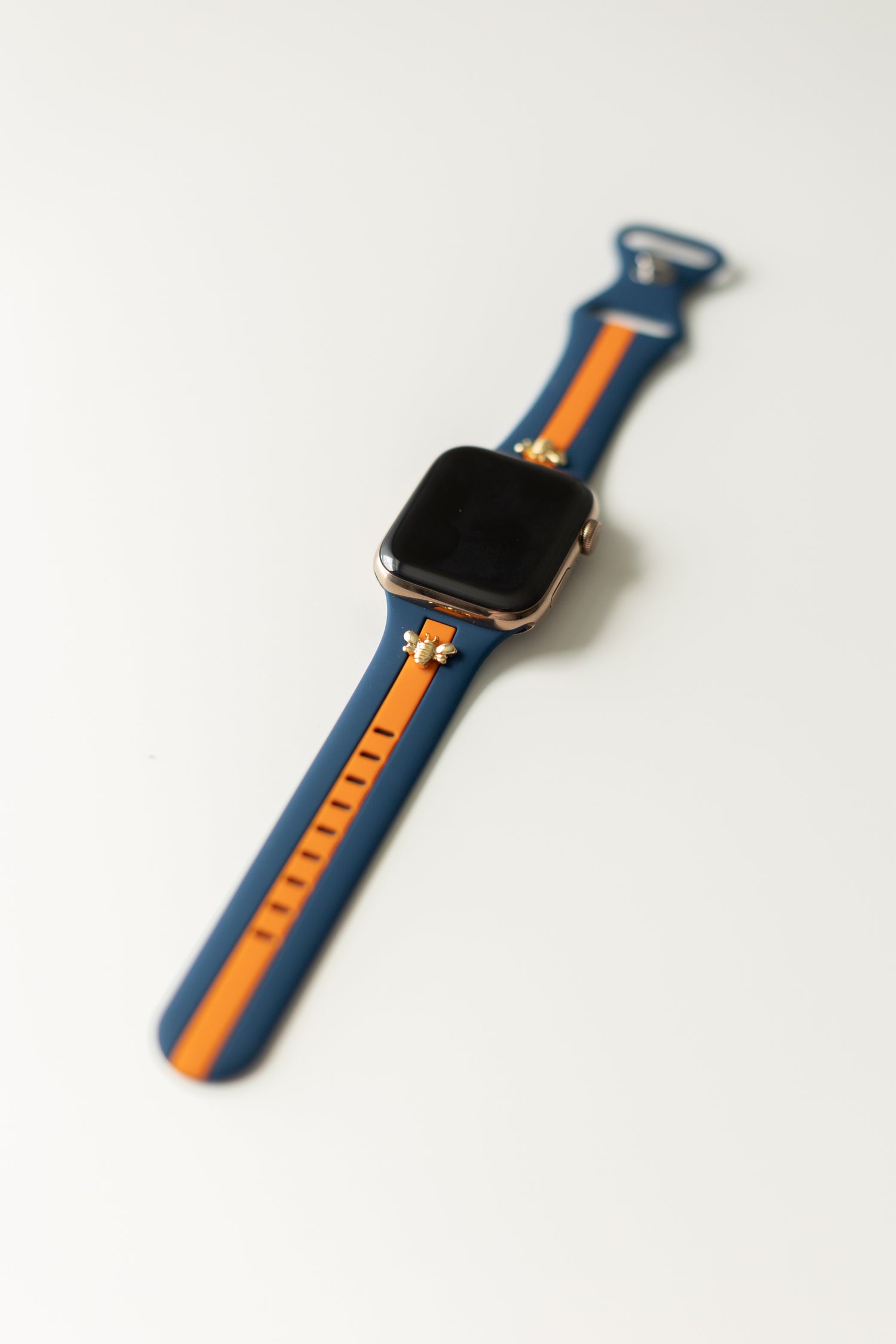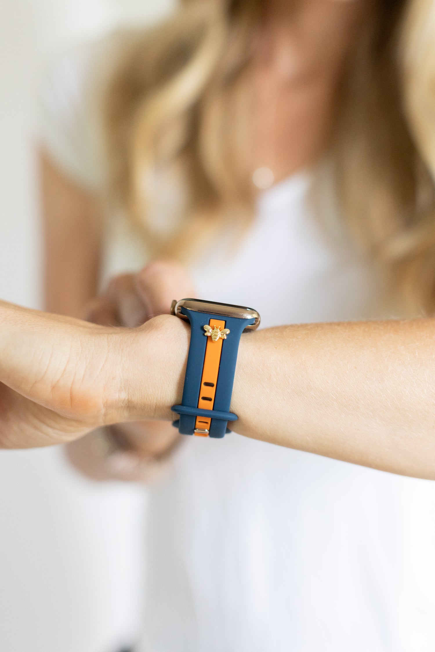 This Apple Watch band features our original molded band (nothing painted on printed on) high quality, soft, comfortable and beautifullll! You have a choice of a pair of dainty white bow charms in either gold, silver or rose gold finish.