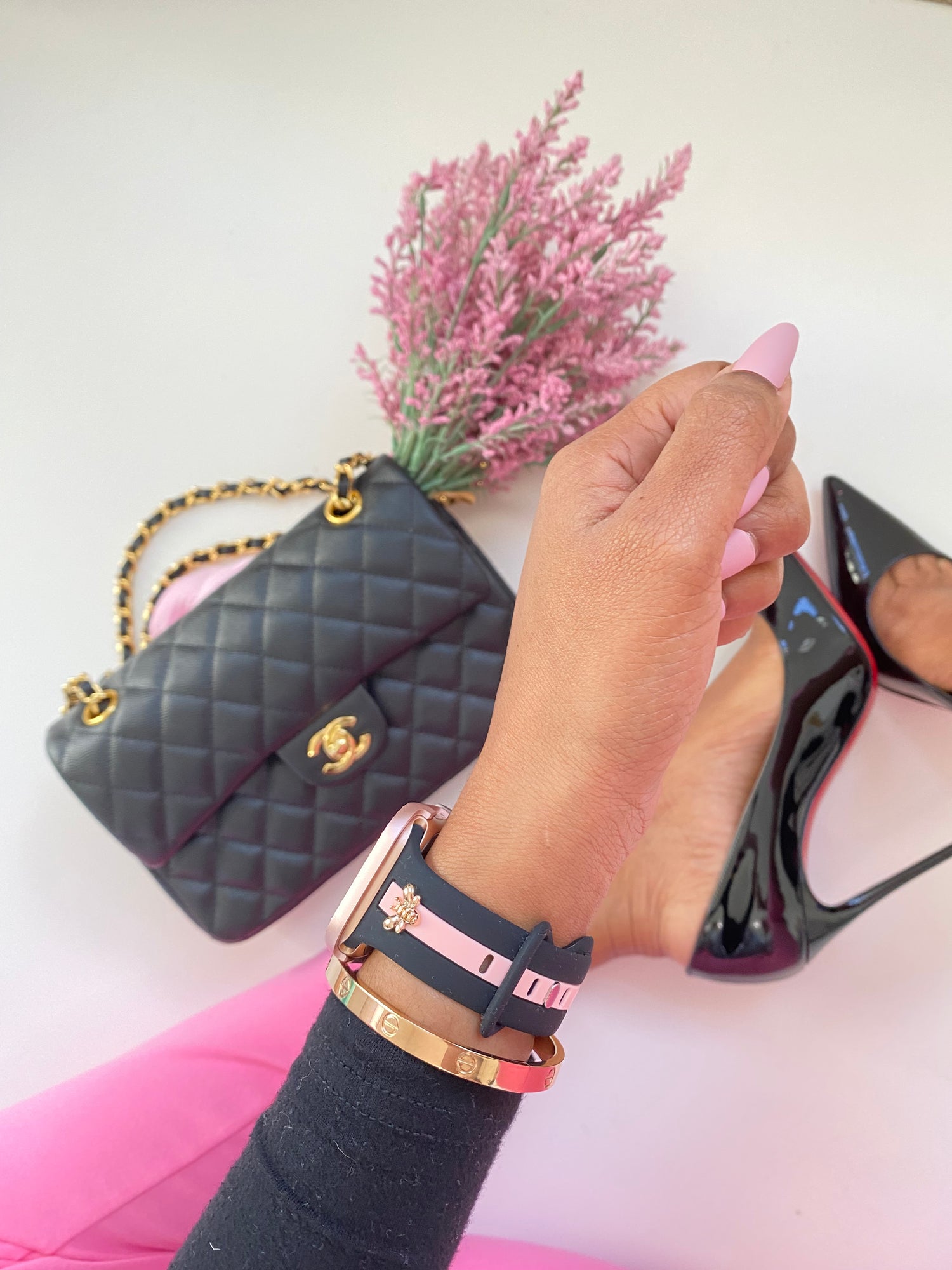 This Apple Watch band features our original molded band (nothing painted on printed on) high quality, soft, comfortable and beautifullll! You have a choice of a pair of dainty white bow charms in either gold, silver or rose gold finish.