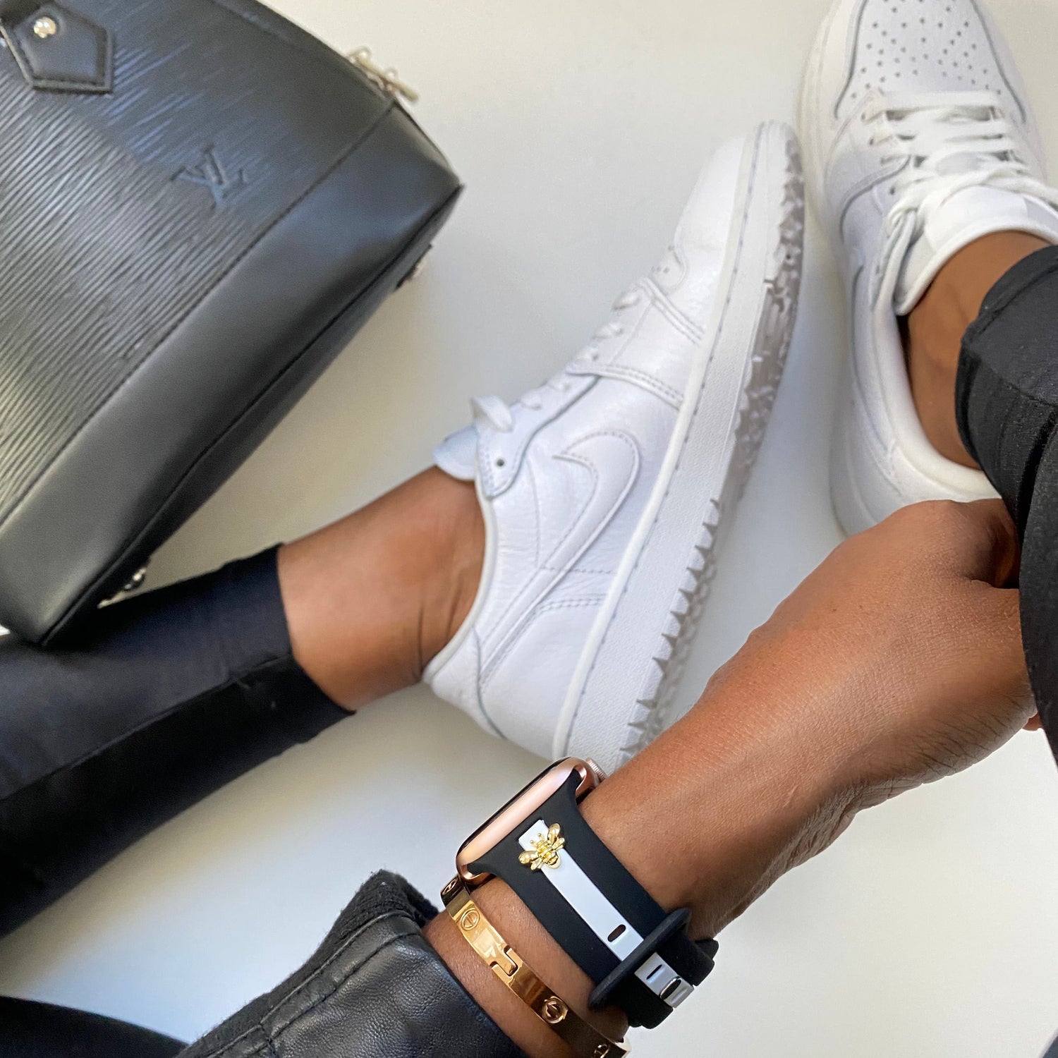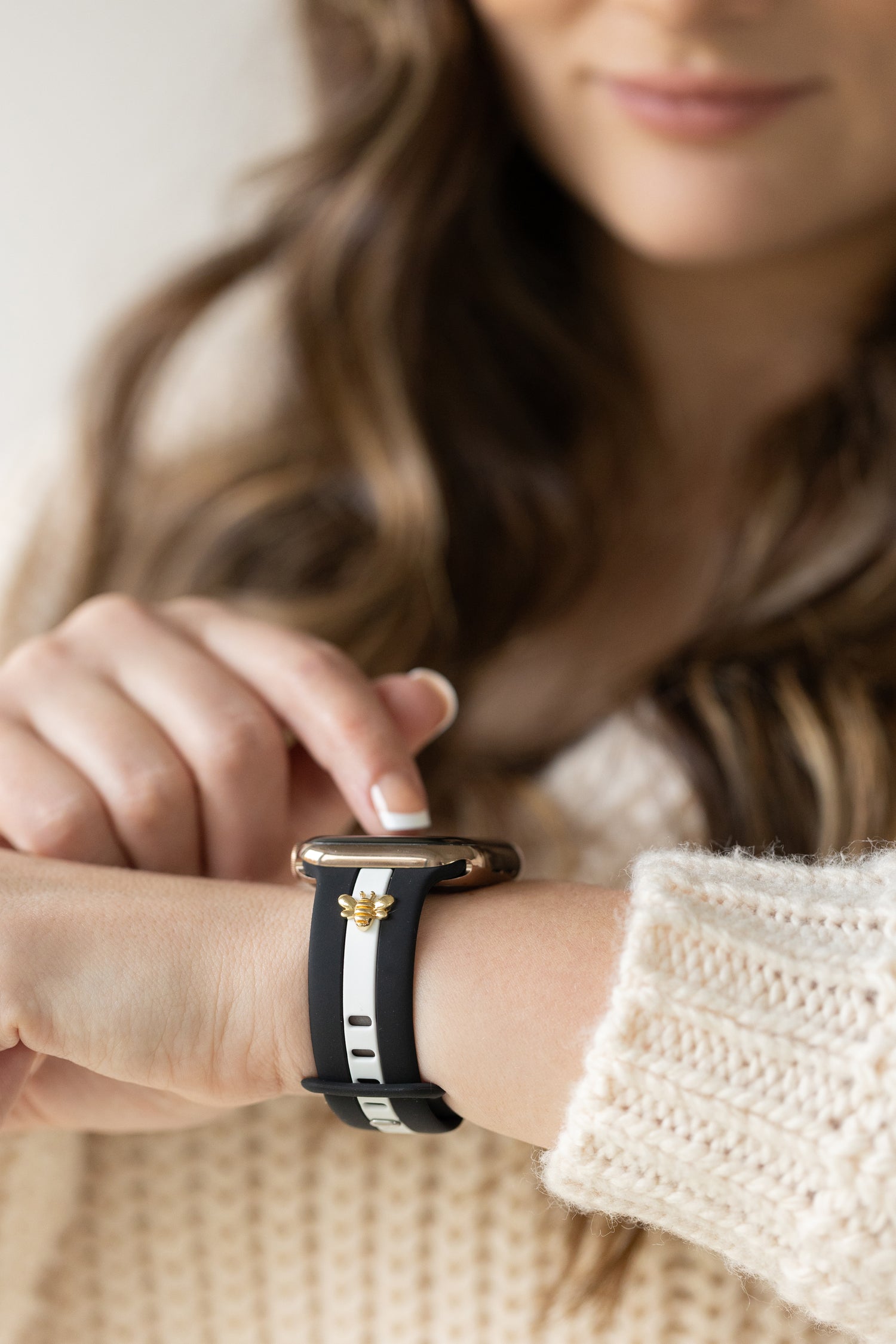This Apple Watch band features our original molded band (nothing painted on printed on) high quality, soft, comfortable and beautifullll! You have a choice of a pair of dainty white bow charms in either gold, silver or rose gold finish.