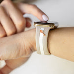 This Apple Watch band features our original molded band (nothing painted on printed on) high quality, soft, comfortable and beautifullll! You have a choice of a pair of dainty white bow charms in either gold, silver or rose gold finish.