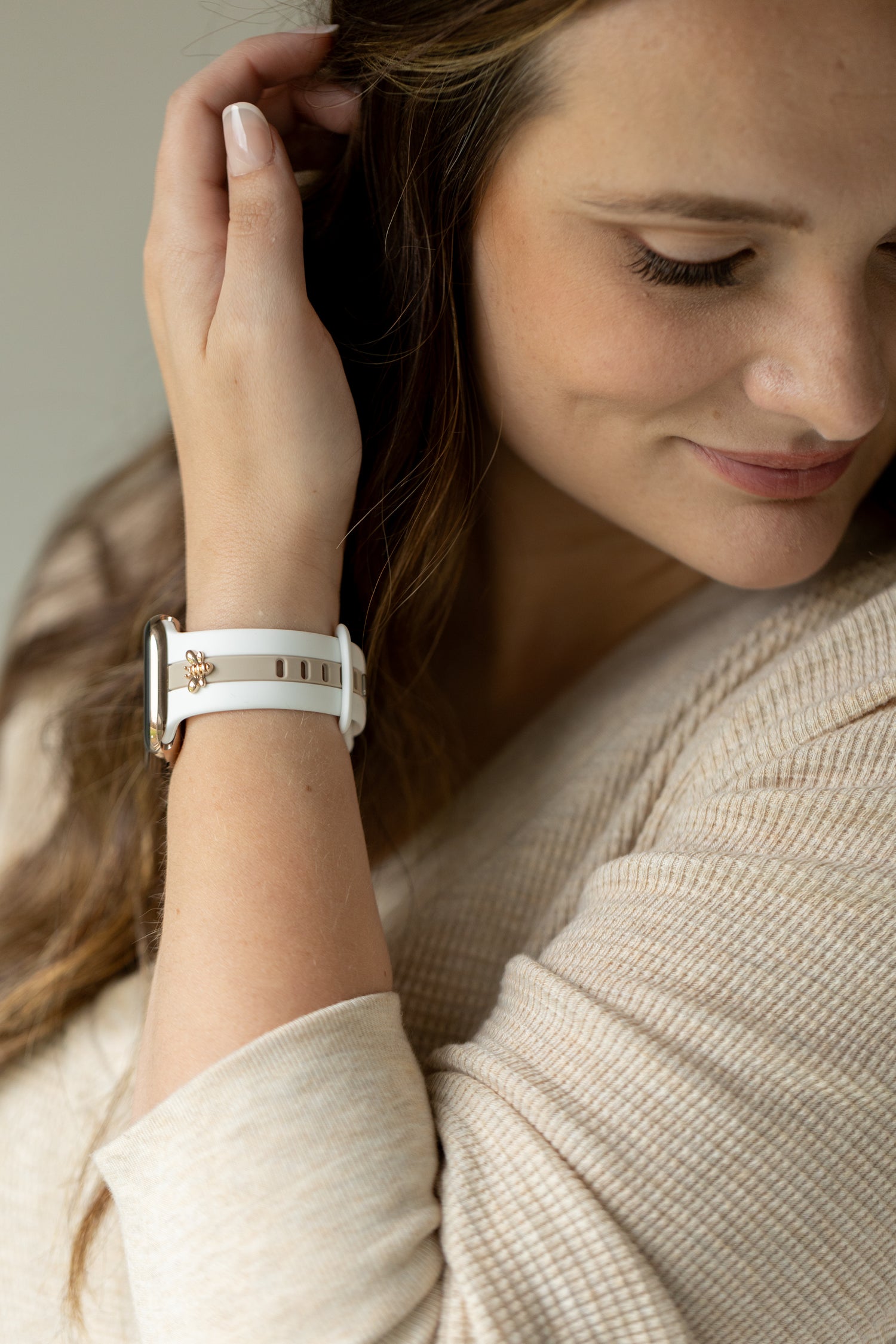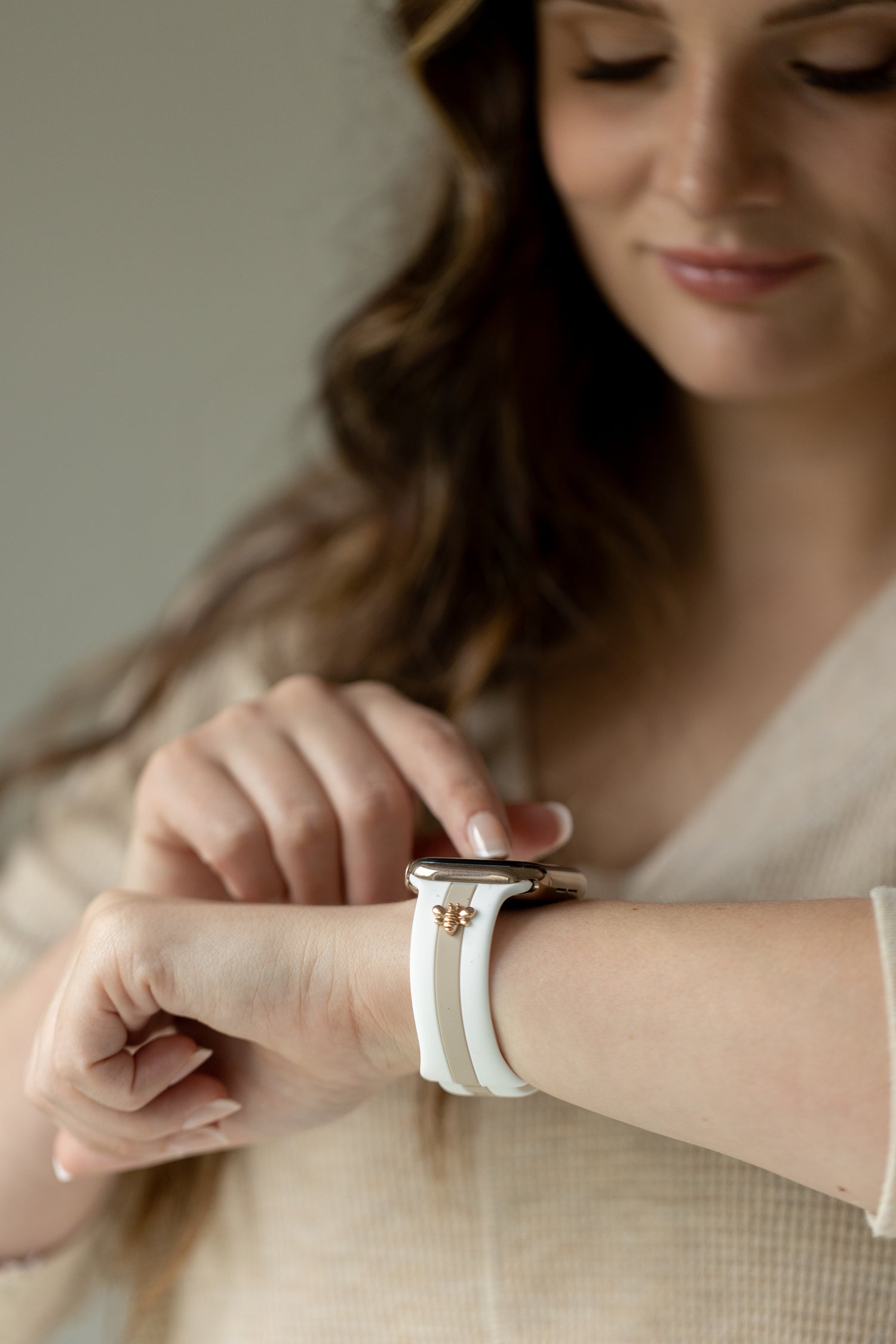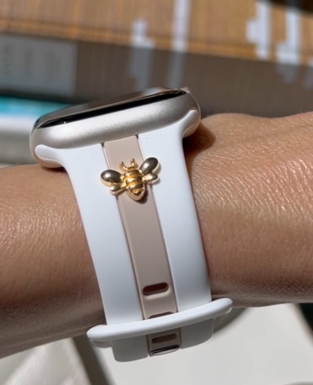 This Apple Watch band features our original molded band (nothing painted on printed on) high quality, soft, comfortable and beautifullll! You have a choice of a pair of dainty white bow charms in either gold, silver or rose gold finish.