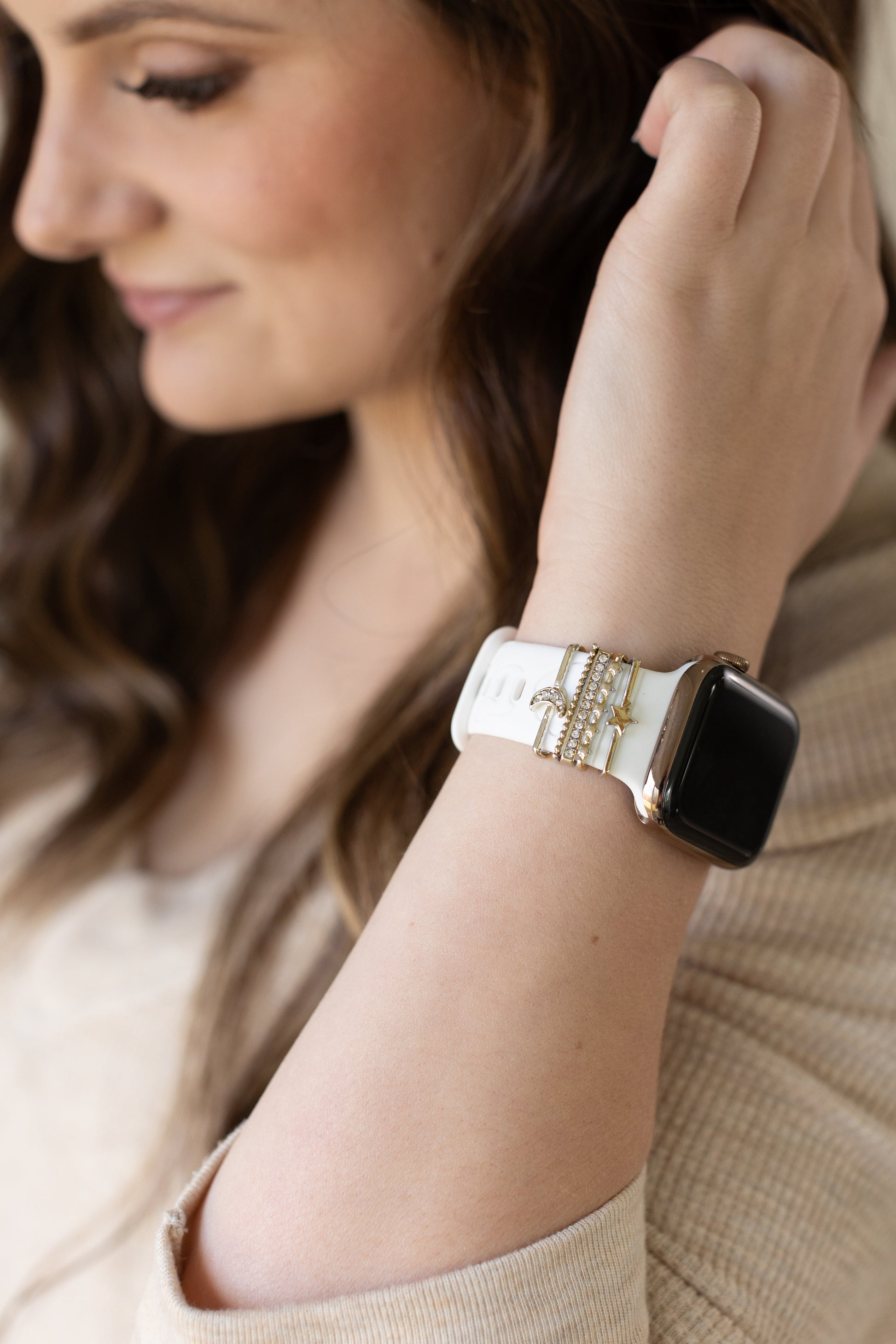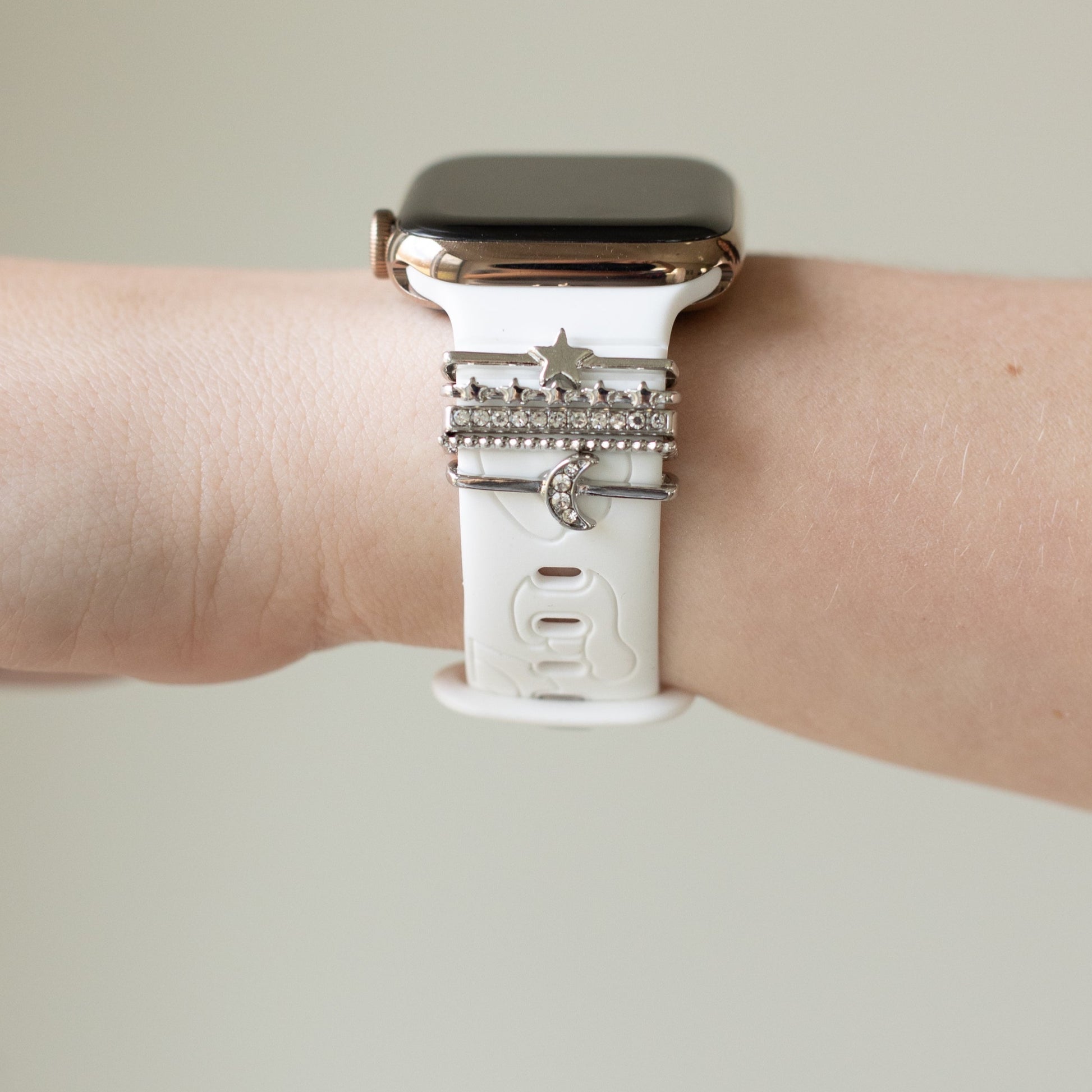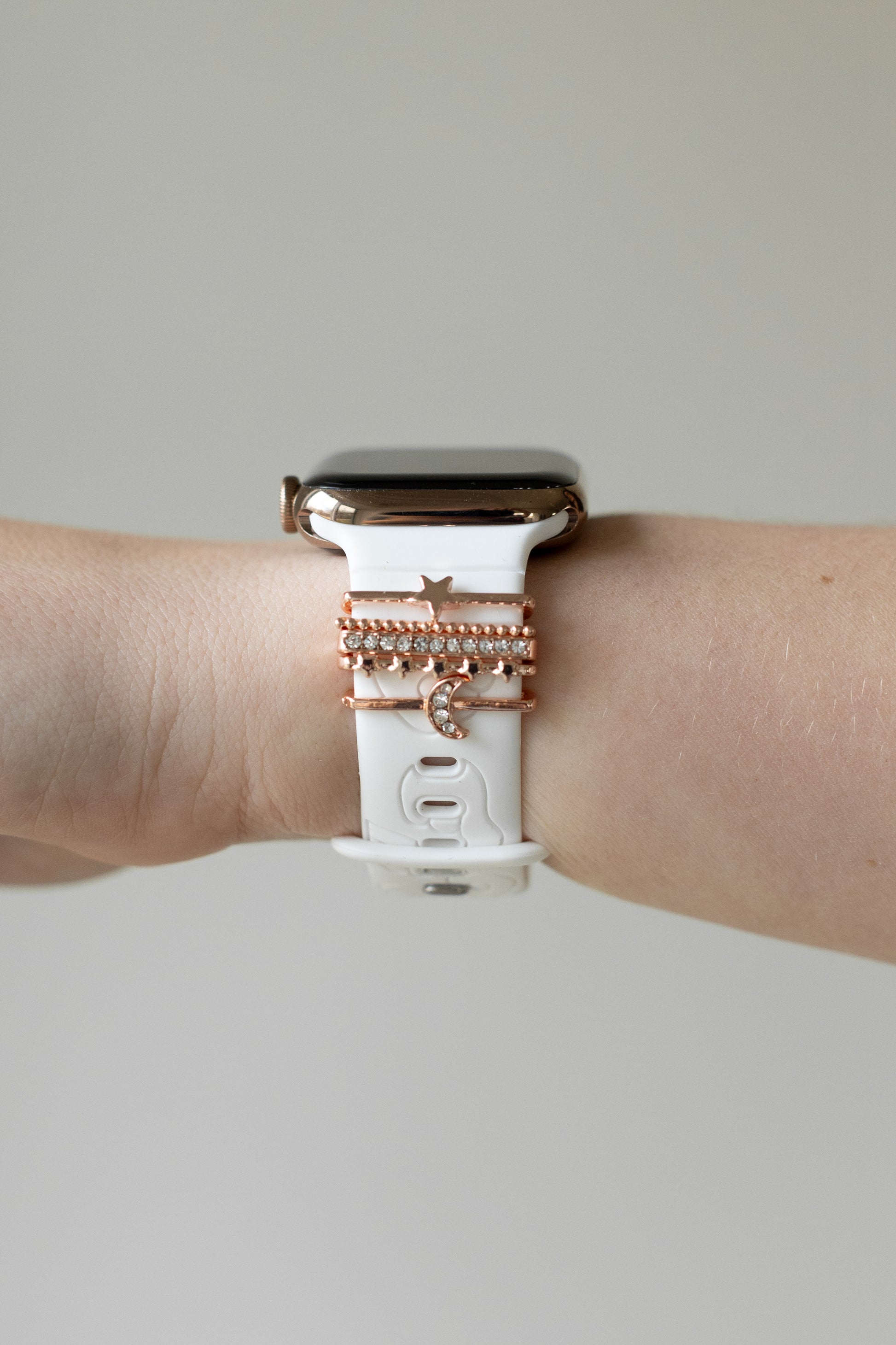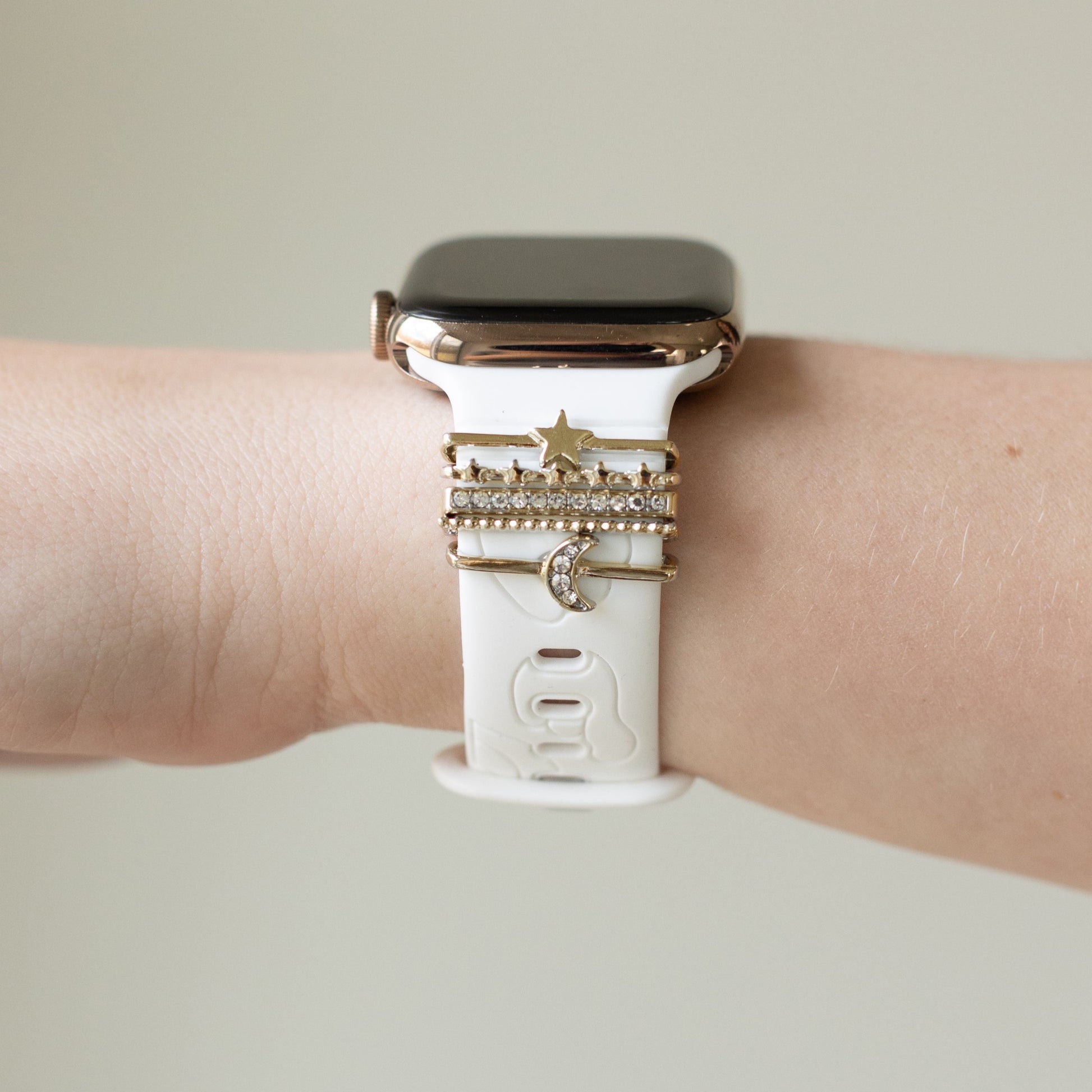This is another addition to our popular leopard molded Apple Watch bands. This band is so simple but such a show stopper. The gold ring stack features delicate rhinestones and a moon and star accent. Makes a great gift.