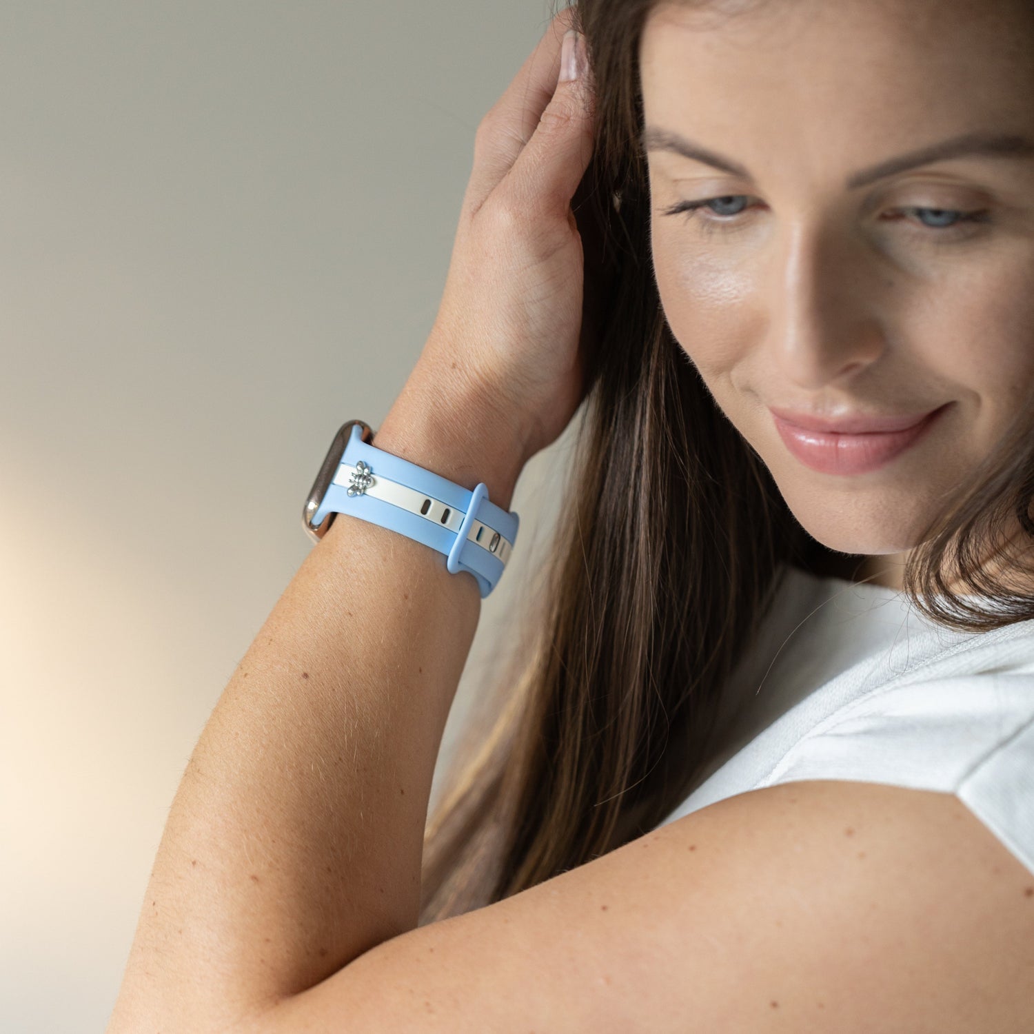 This band is designer-esque, comfiest silicone with the cutest, delicate charm options in gold, rose gold, or silver.