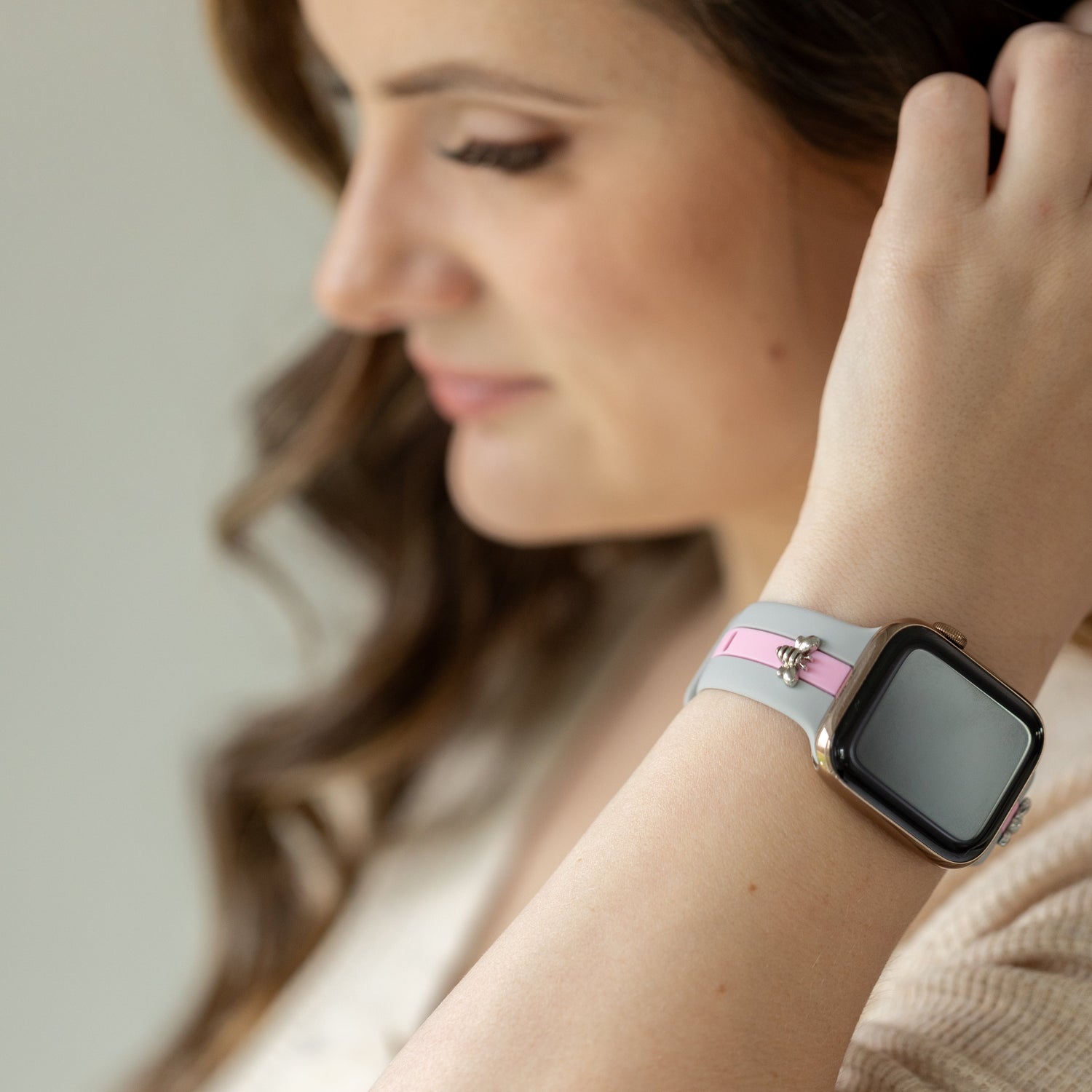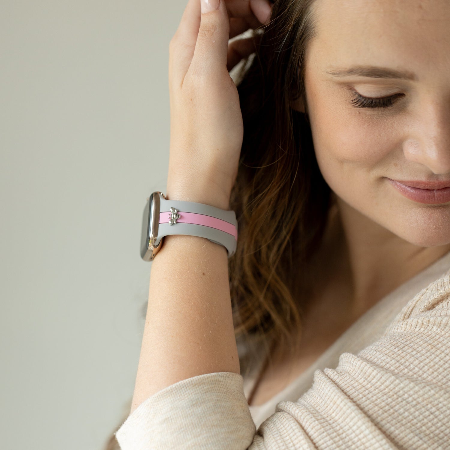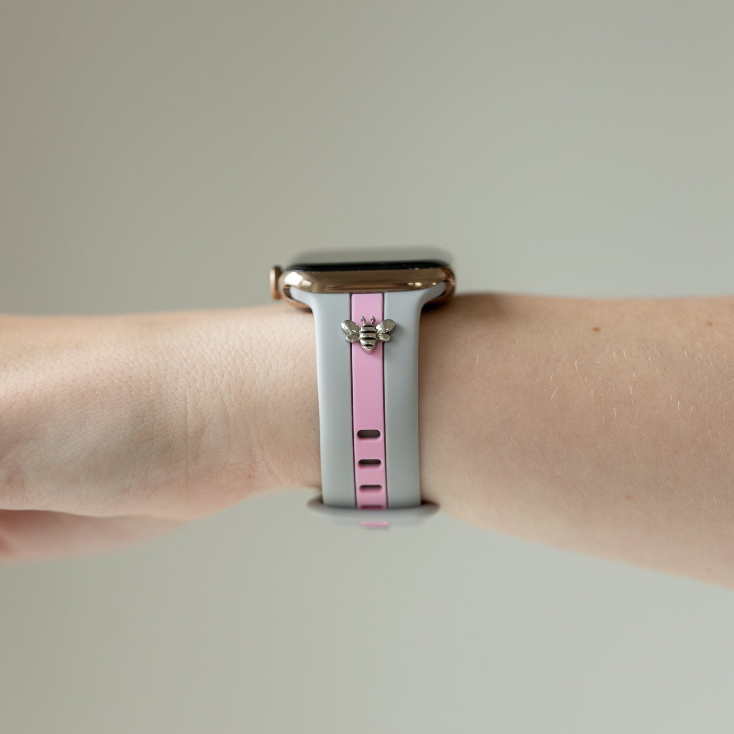 This band is designer-esque, comfiest silicone with the cutest, delicate charm options in gold, rose gold, or silver.
