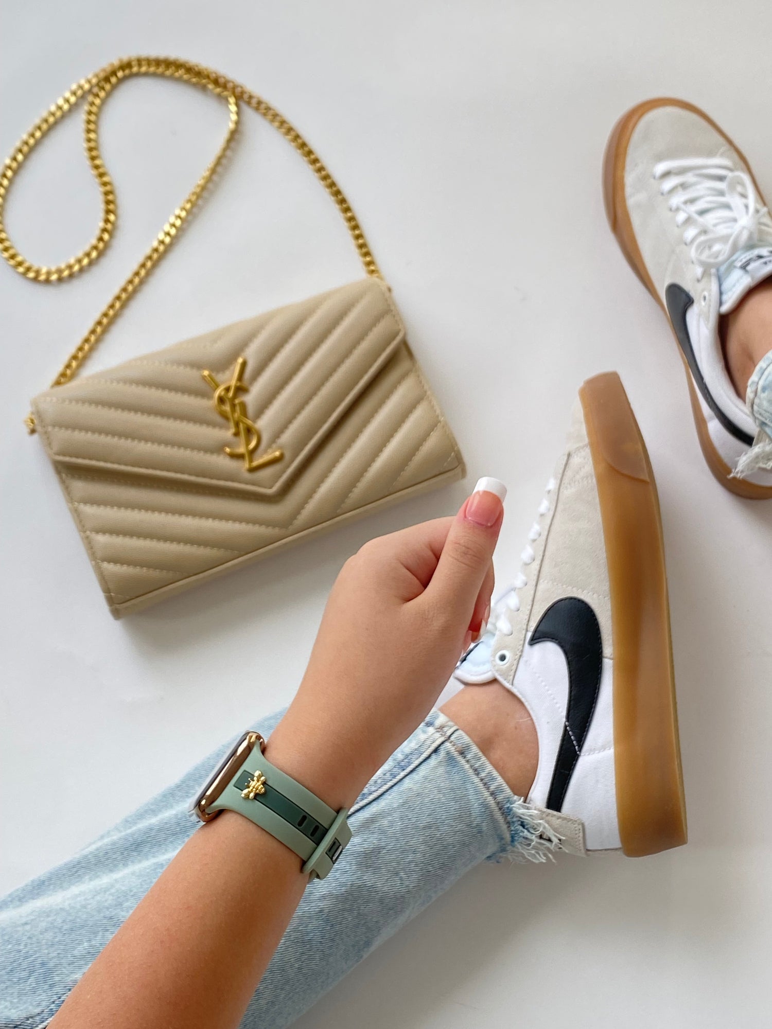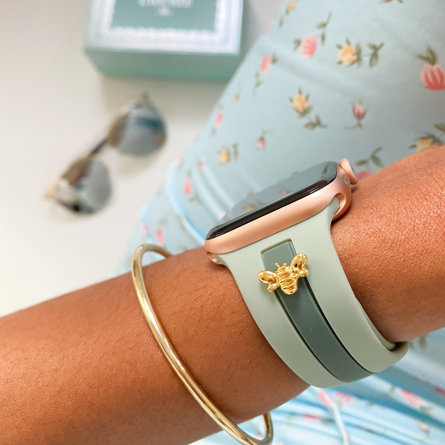 This band is designer-esque, comfiest silicone with the cutest, delicate charm options in gold, rose gold, or silver.