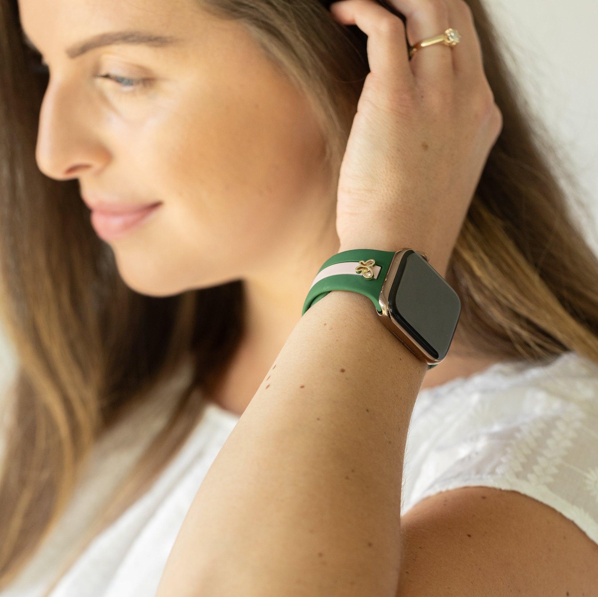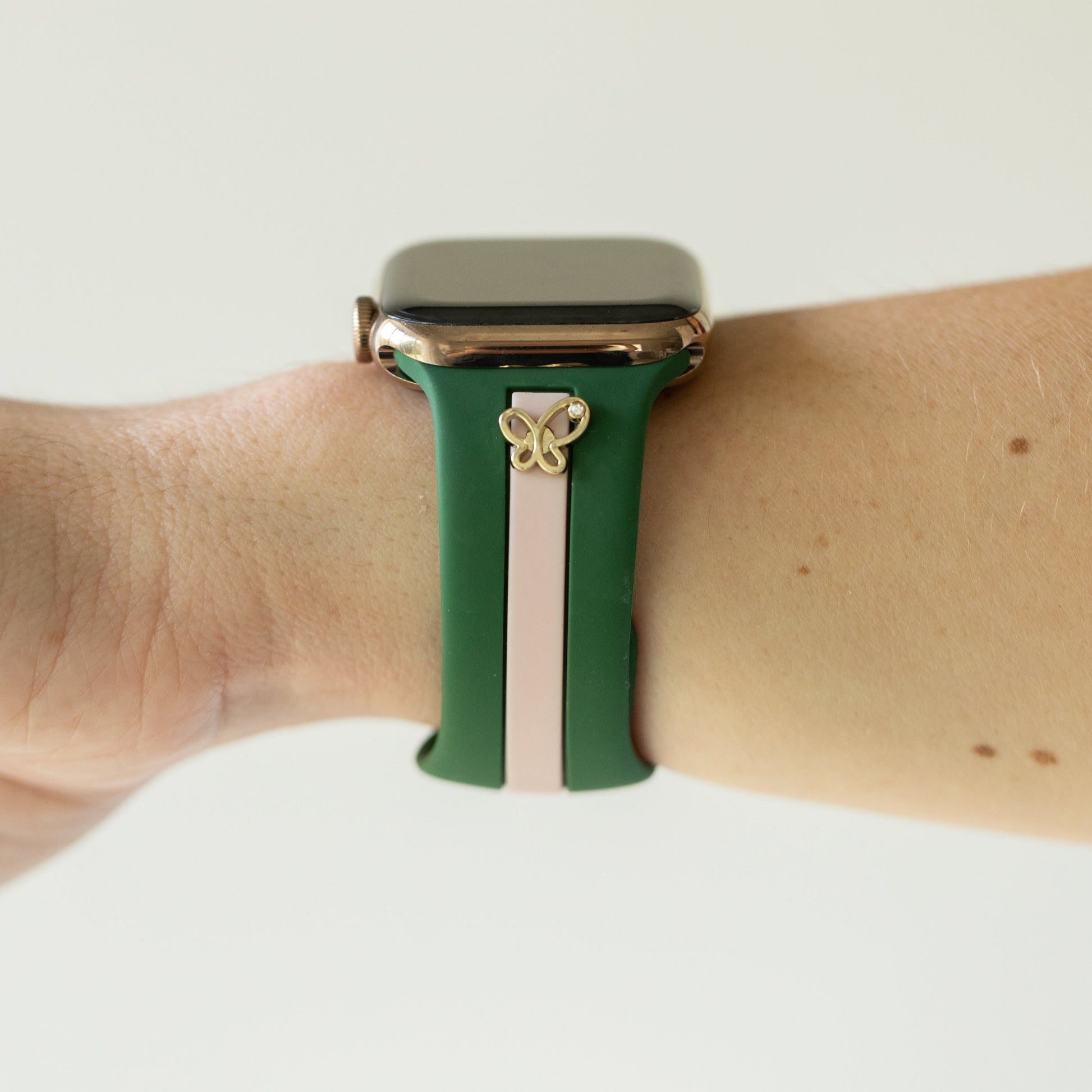 This Apple Watch band features our original molded band (nothing painted on printed on) high quality, soft, comfortable and beautifullll! You have a choice of a pair of butterfly charms in either gold, silver or rose gold finish.