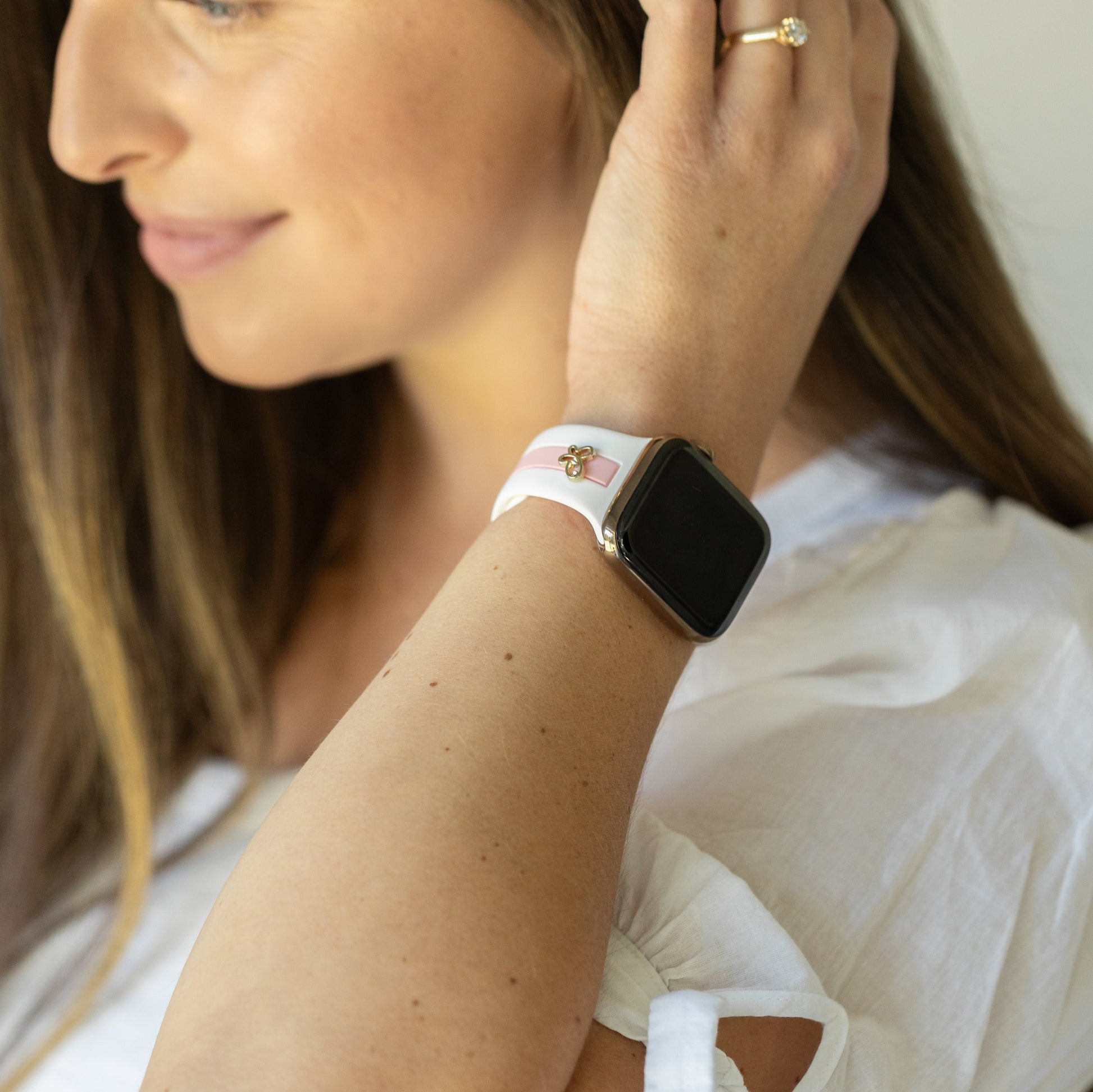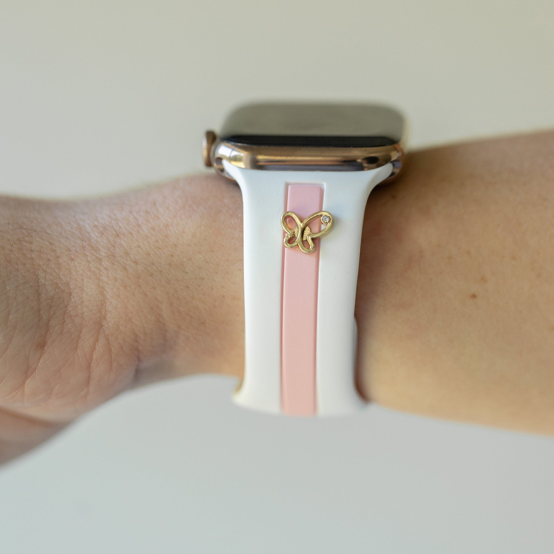 This Apple Watch band features our original molded band (nothing painted on printed on) high quality, soft, comfortable and beautifullll! You have a choice of a pair of butterfly charms in either gold, silver or rose gold finish.