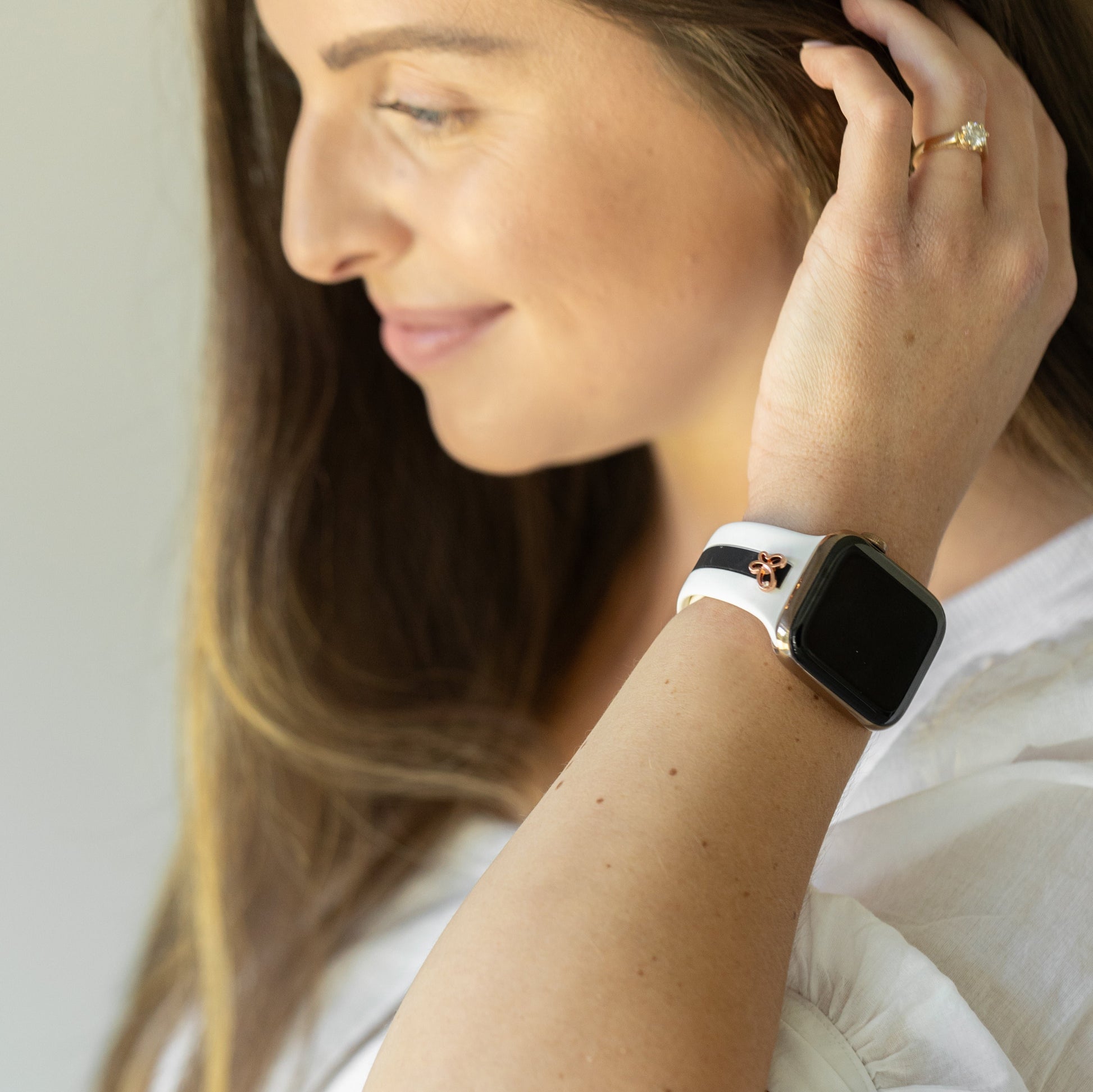 This Apple Watch band features our original molded band (nothing painted on printed on) high quality, soft, comfortable and beautifullll! You have a choice of a pair of butterfly charms in either gold, silver or rose gold finish.
