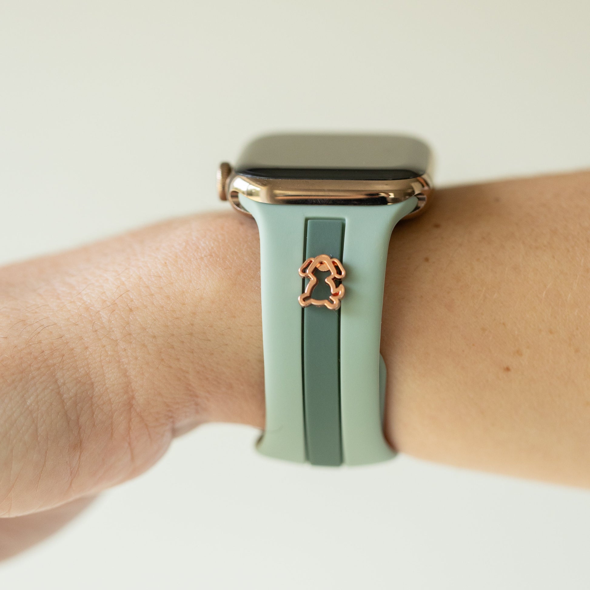 This Apple Watch band features our original molded band (nothing painted on printed on) high quality, soft, comfortable and beautifullll! You have a choice of a pair of Pup charms in either gold, silver or rose gold finish.