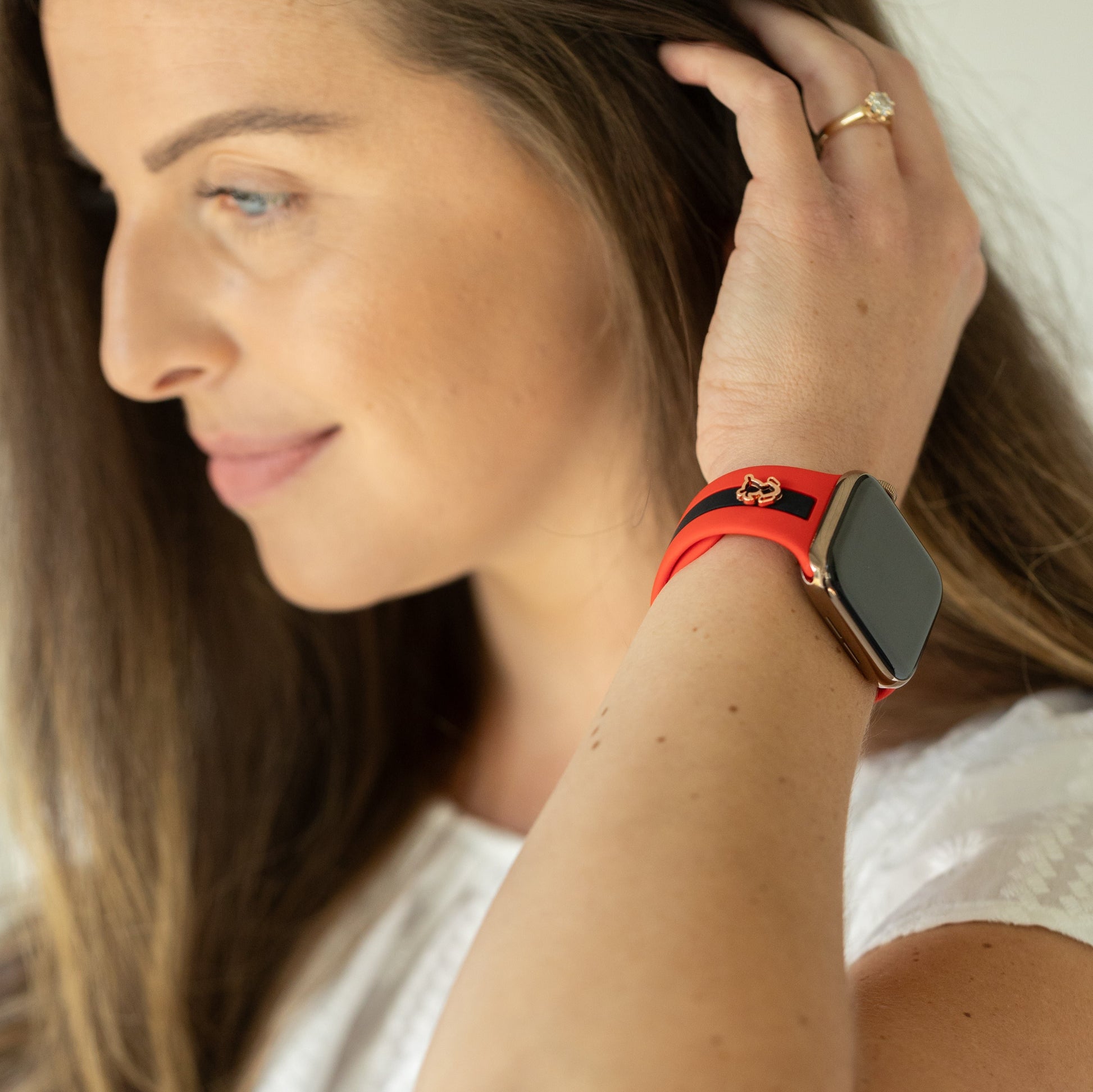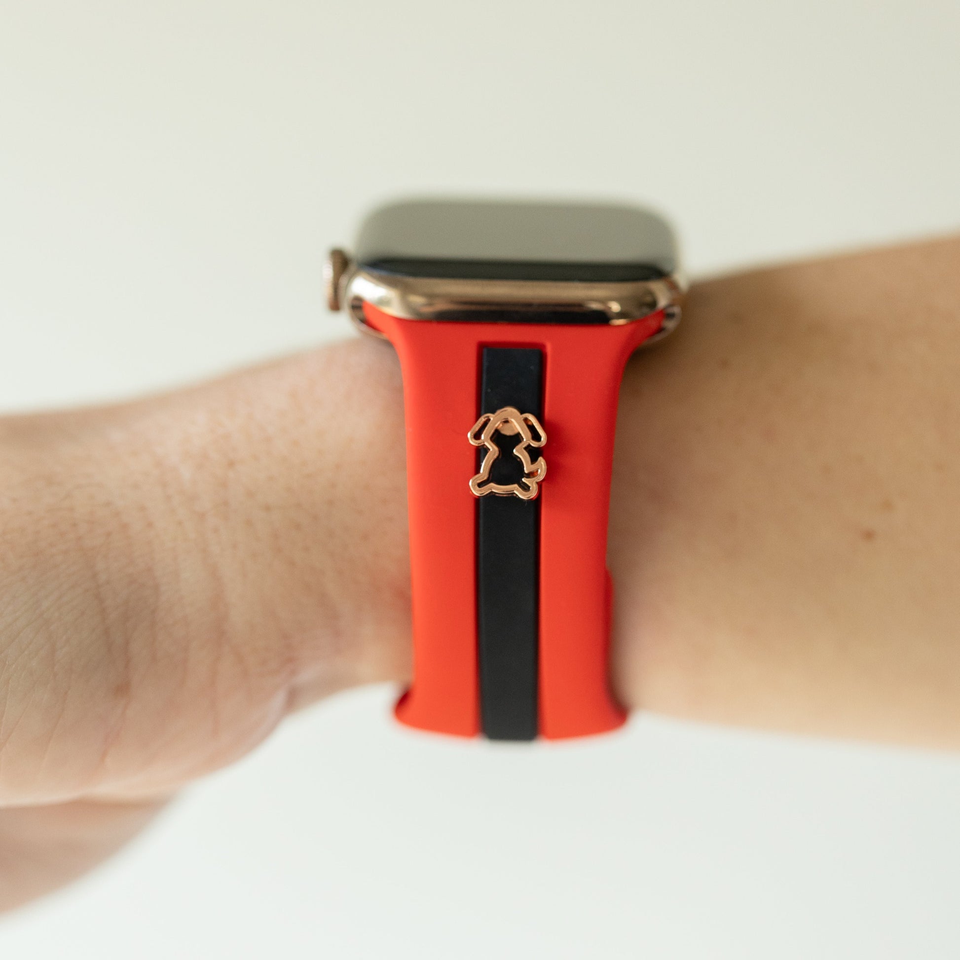 This Apple Watch band features our original molded band (nothing painted on printed on) high quality, soft, comfortable and beautifullll! You have a choice of a pair of Pup charms in either gold, silver or rose gold finish.