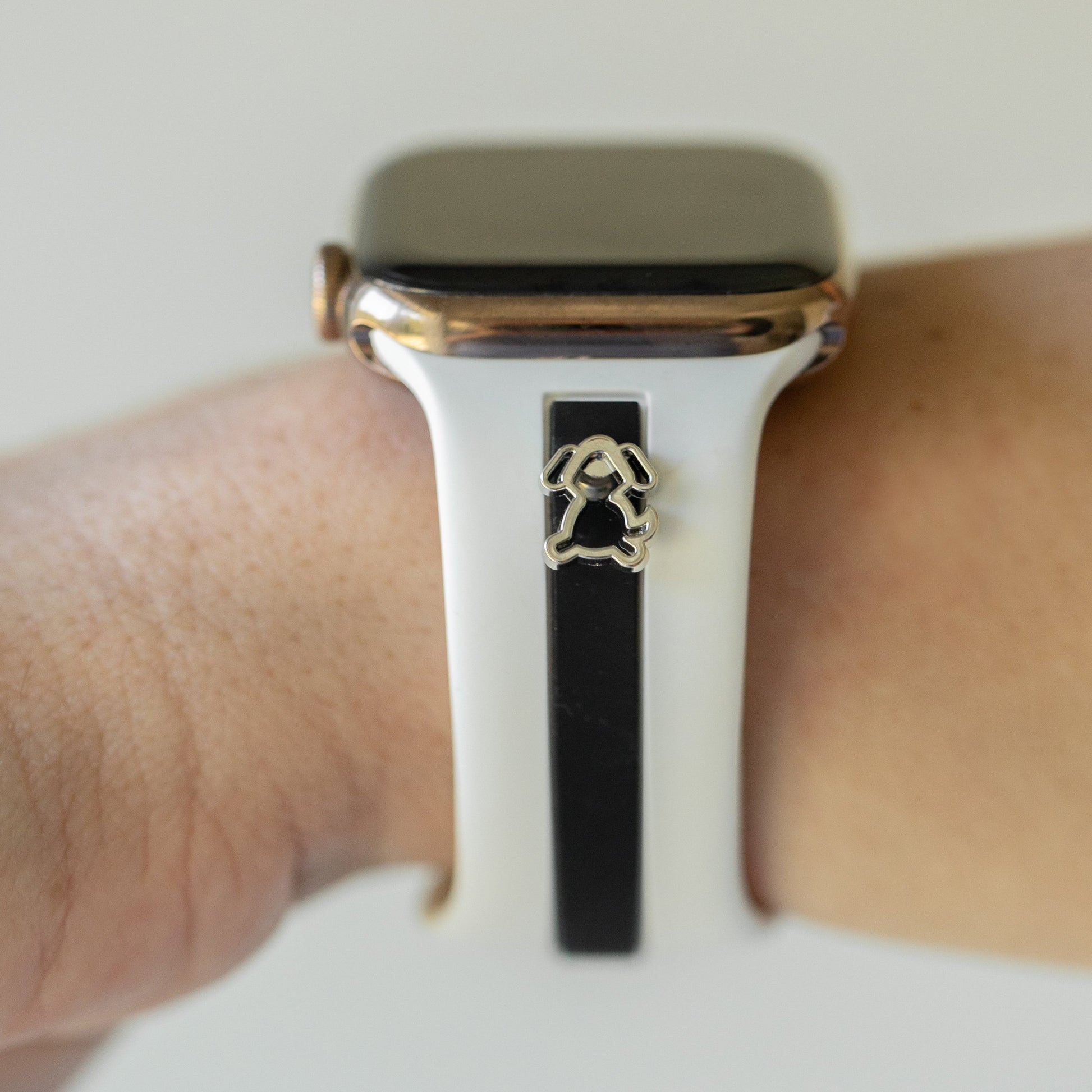 This Apple Watch band features our original molded band (nothing painted on printed on) high quality, soft, comfortable and beautifullll! You have a choice of a pair of Pup charms in either gold, silver or rose gold finish.