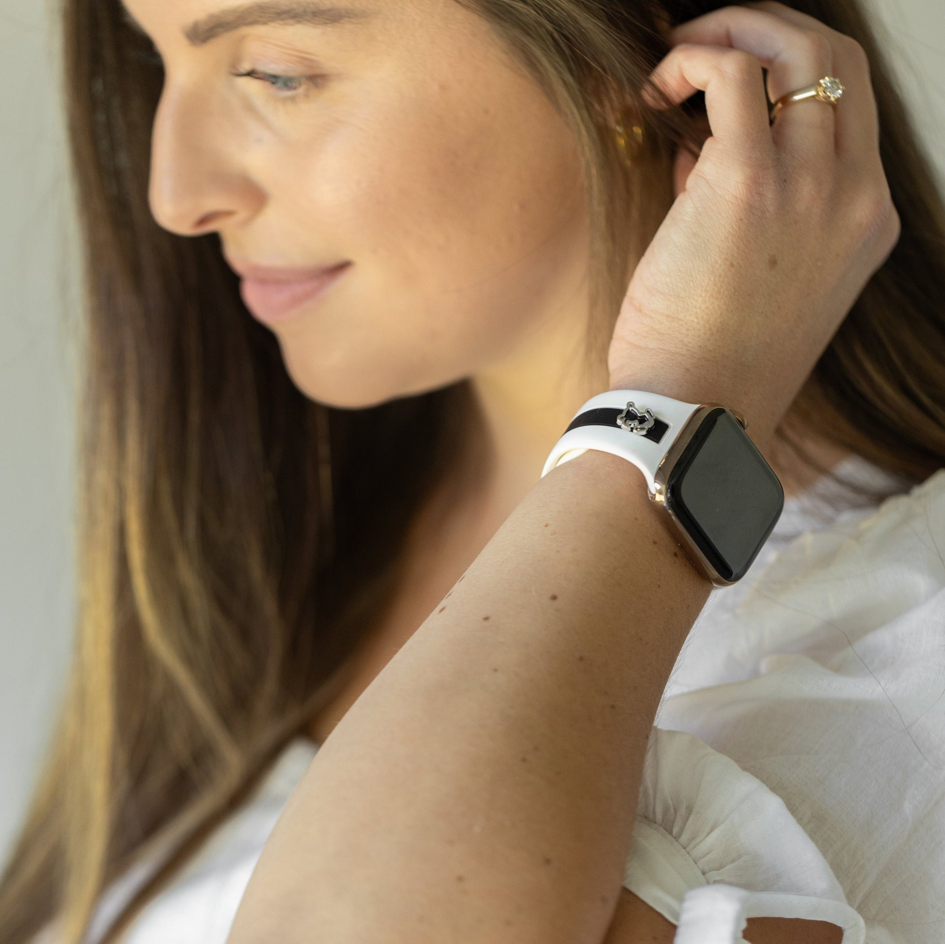 Bark up your style with the Dog Gone Love🐾 Smart Watch Band. High-quality and charming, with a cute doggie detail in gold, rose gold, or silver. Perfect for dog lovers who want to look paws-itively fashionable.