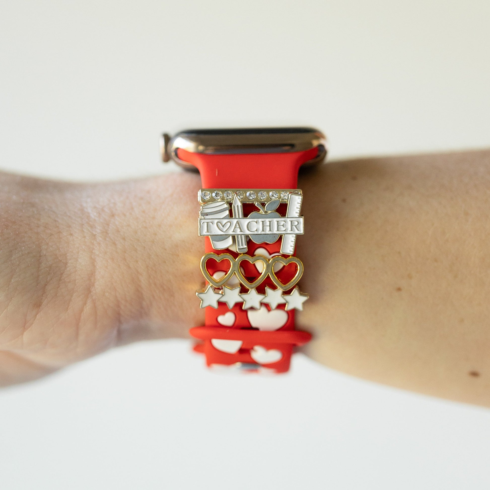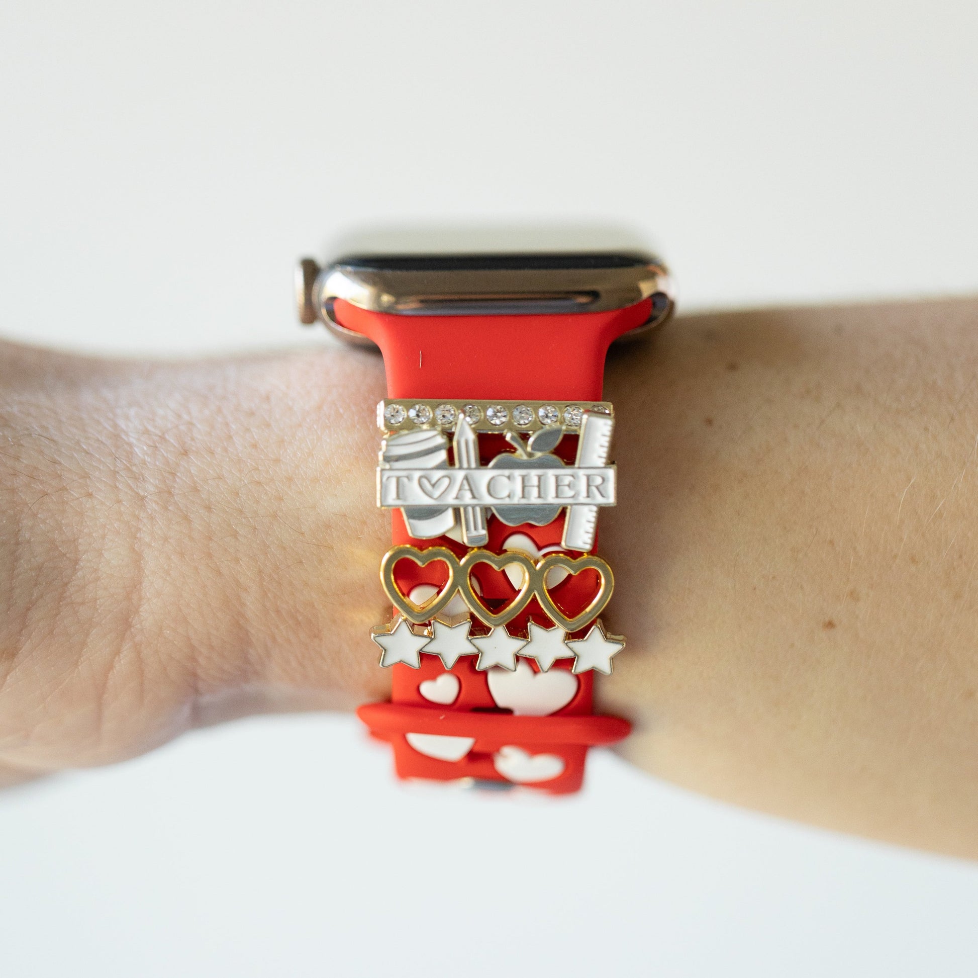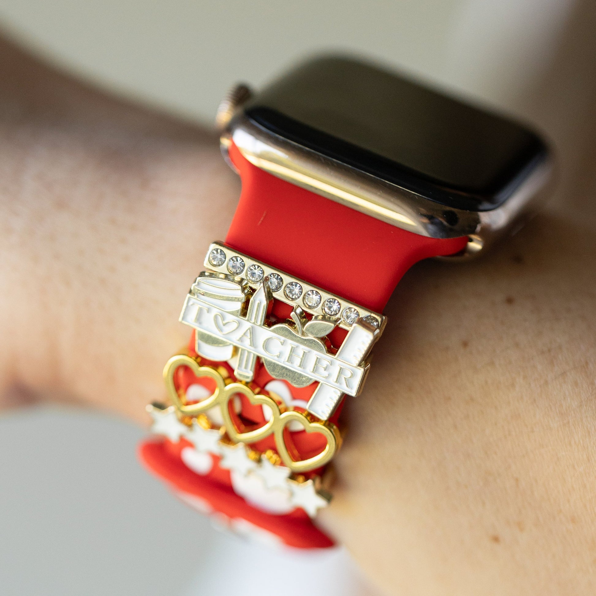 "For The Teachers". This 4-piece watch band charm set features delicate gold, white enamel, and rhinestone accents. Pair this charm set with our limited edition Candy Red Apple Love and Luxe watch band or purchase separately.