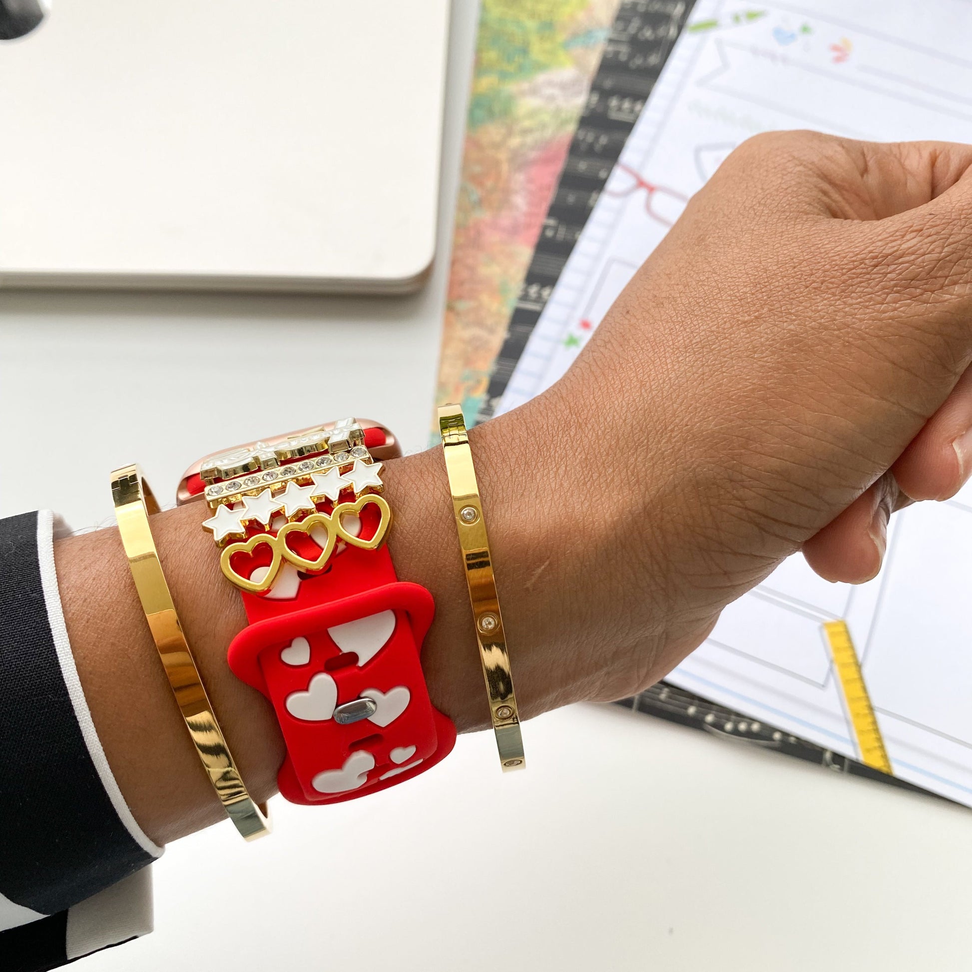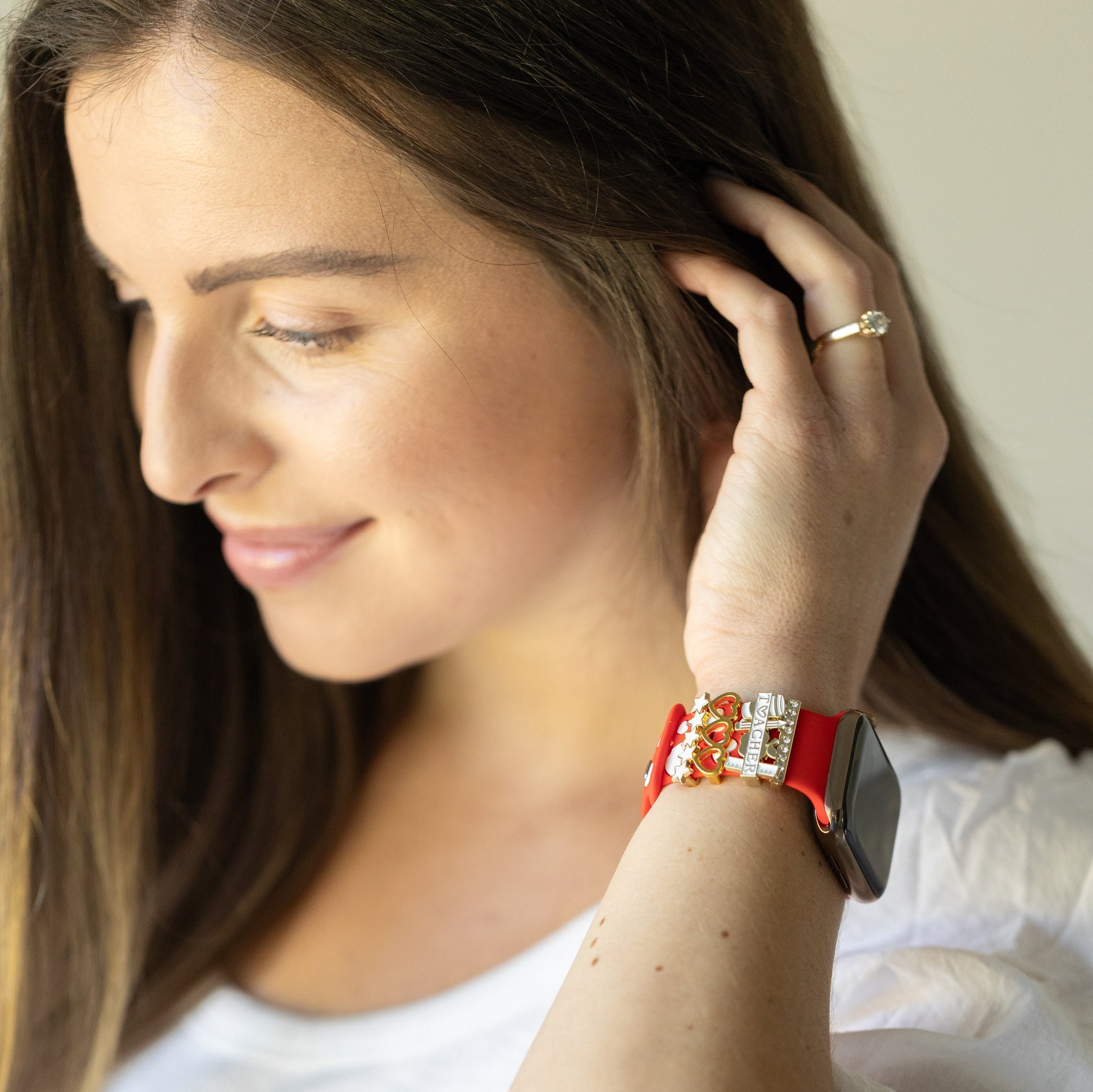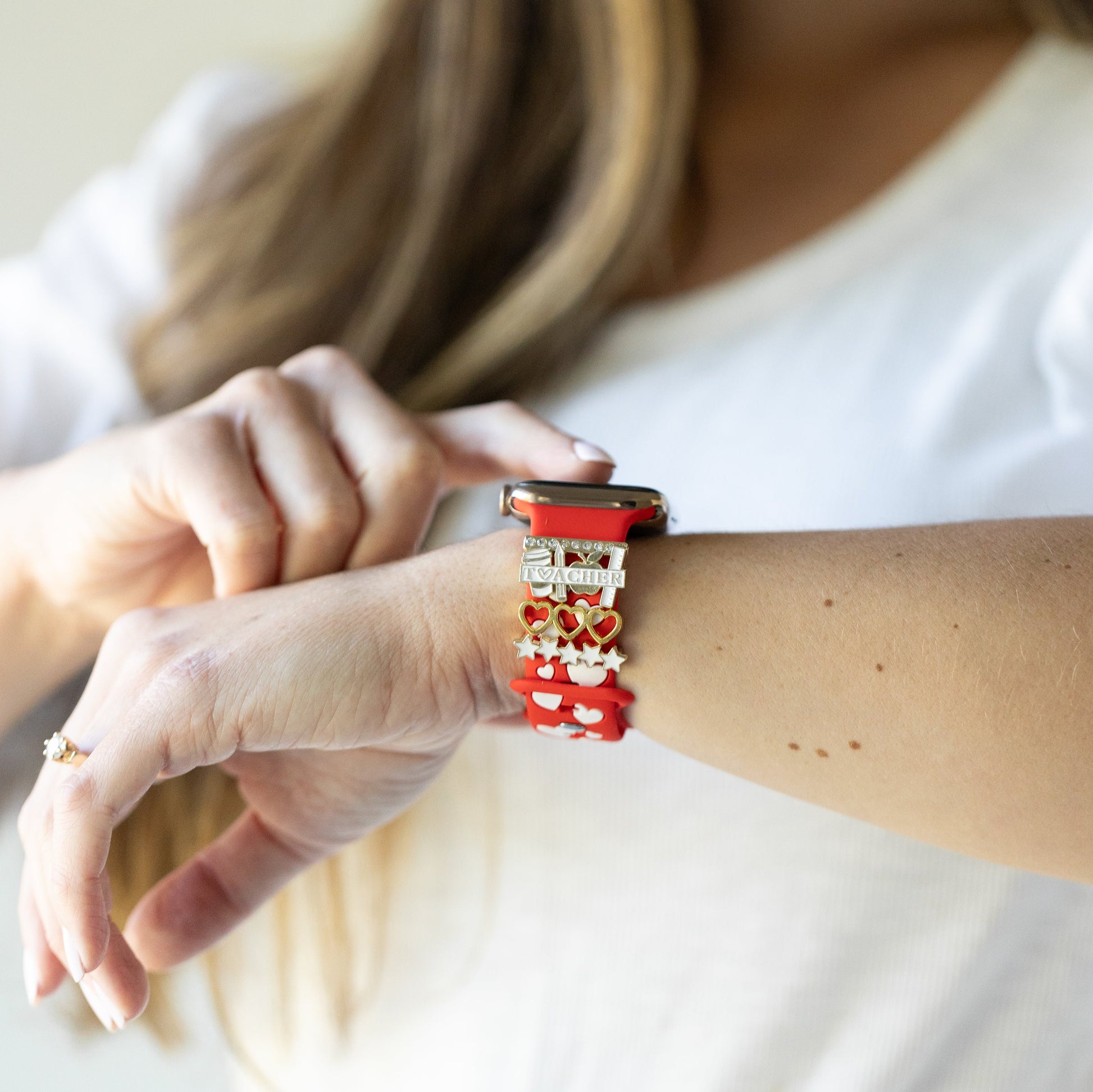 "For The Teachers". This 4-piece watch band charm set features delicate gold, white enamel, and rhinestone accents. Pair this charm set with our limited edition Candy Red Apple Love and Luxe watch band or purchase separately.