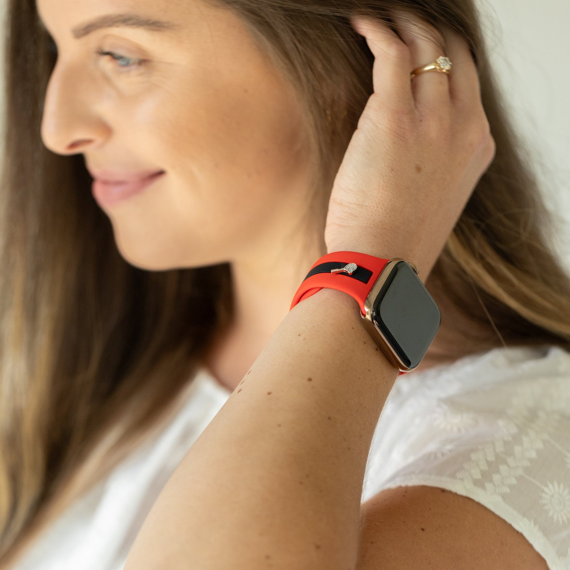 This Apple Watch band features our original molded band (nothing painted on printed on) high quality, soft, comfortable and beautifullll! You have a choice of a pair of dainty white bow charms in either gold, silver or rose gold finish.