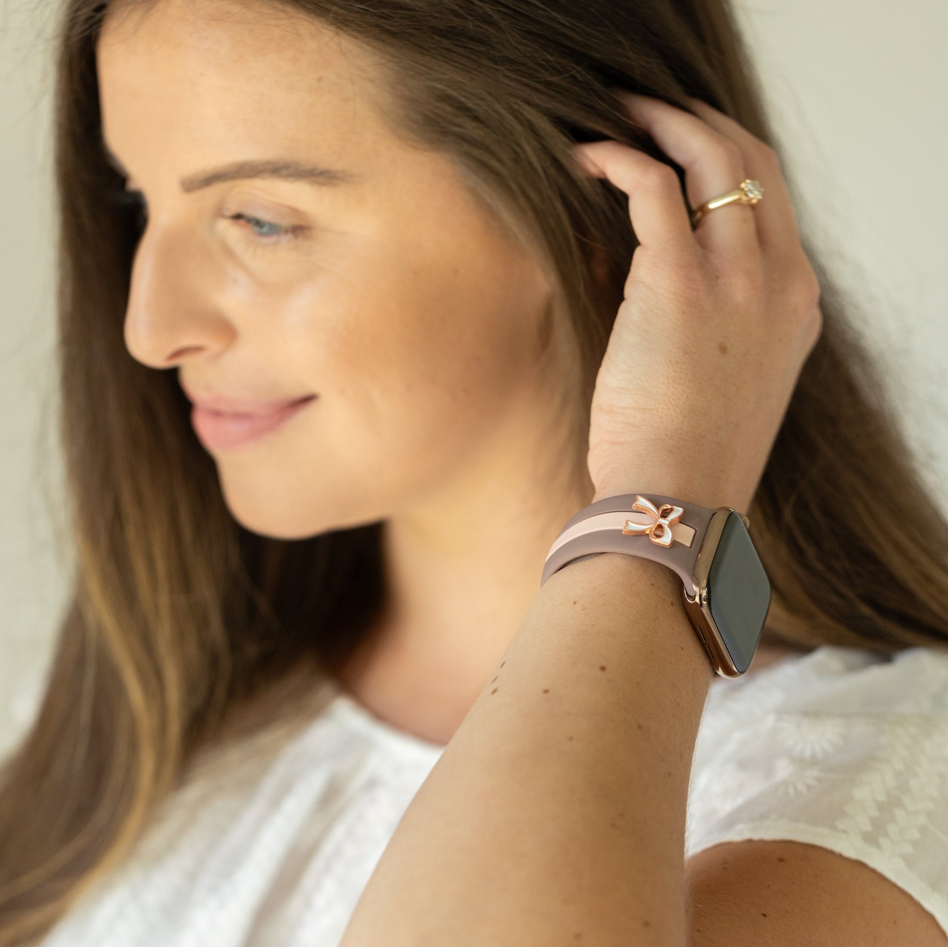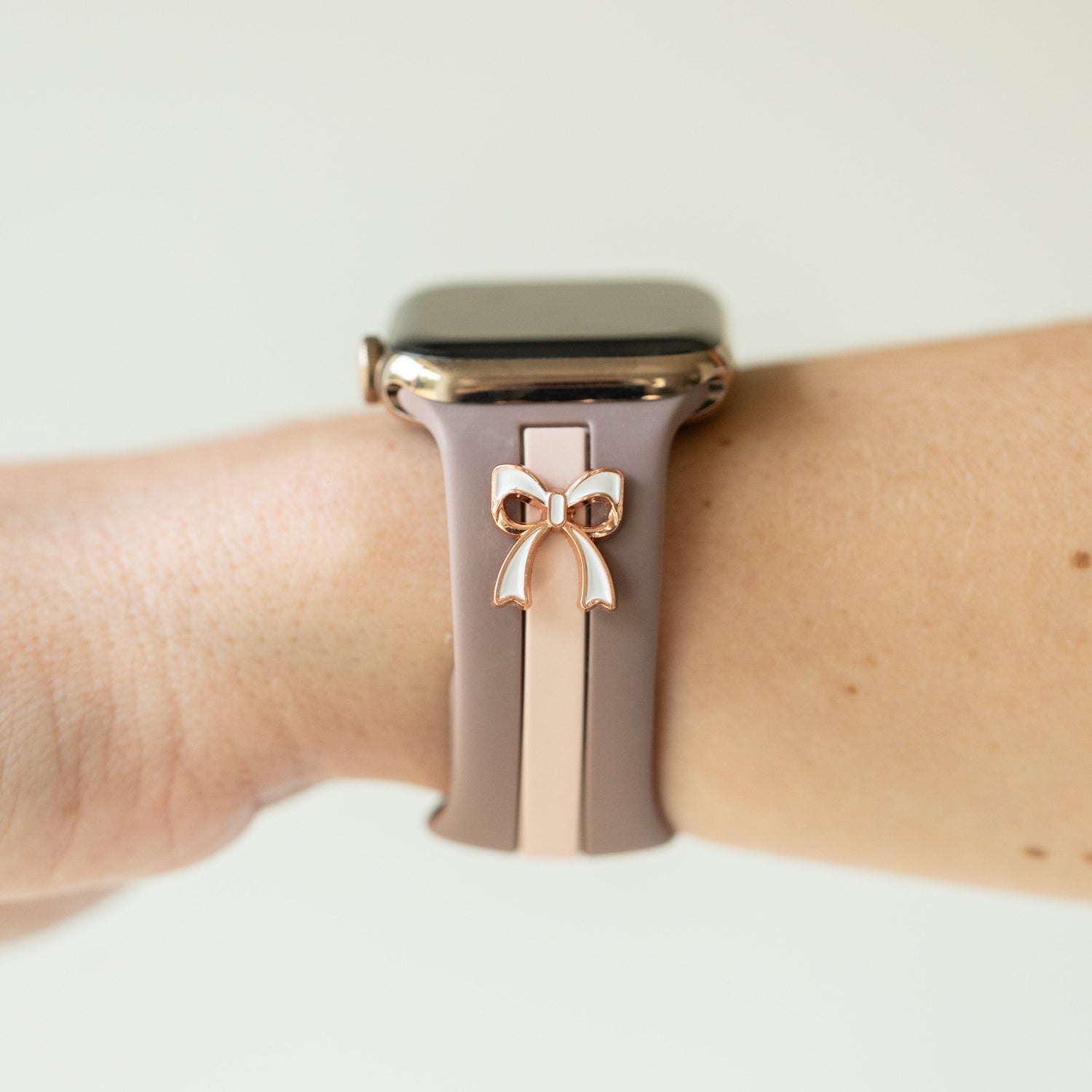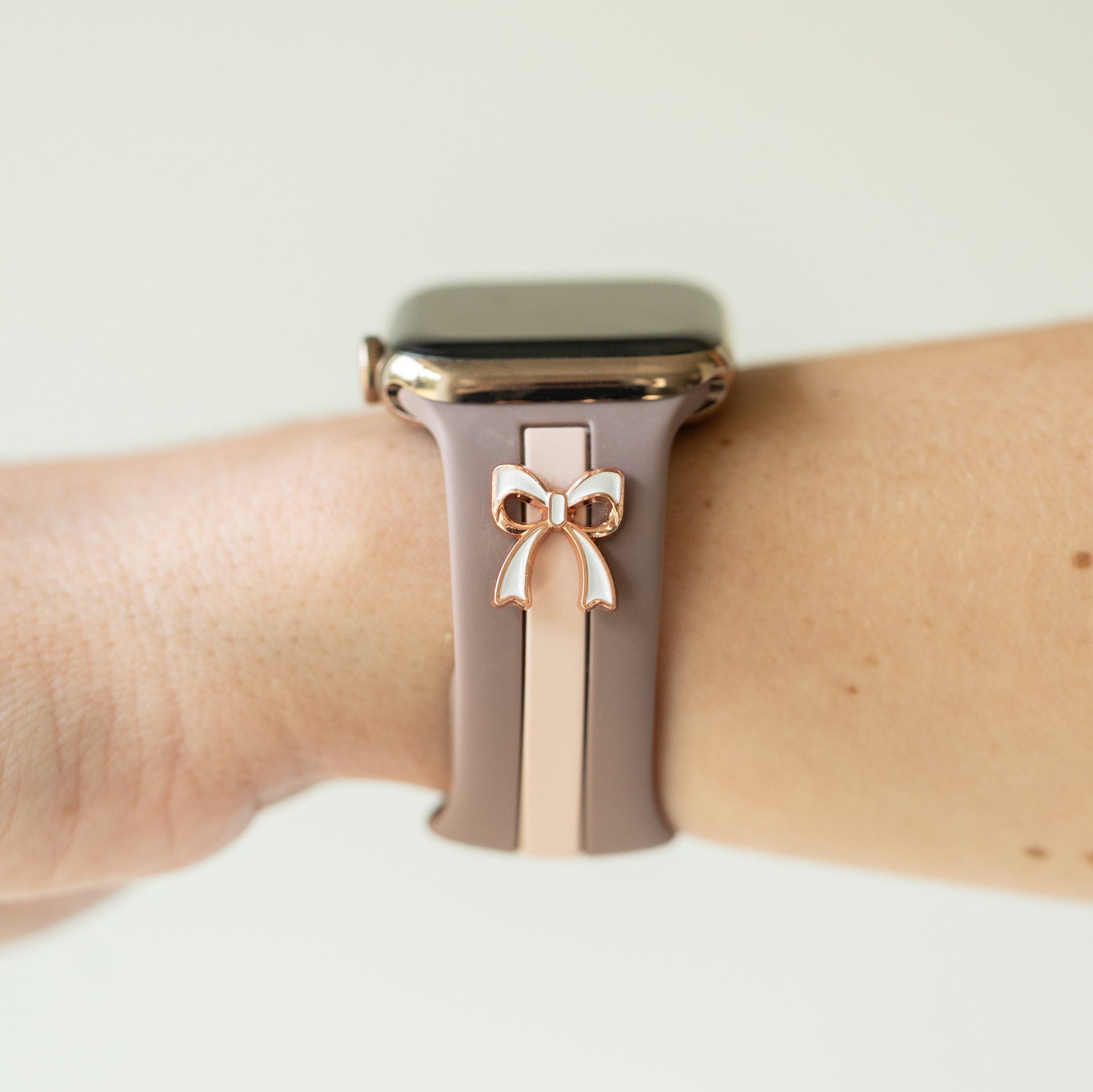 This Apple Watch band features our original molded band (nothing painted on printed on) high quality, soft, comfortable and beautifullll! You have a choice of a pair of dainty white bow charms in either gold, silver or rose gold finish.