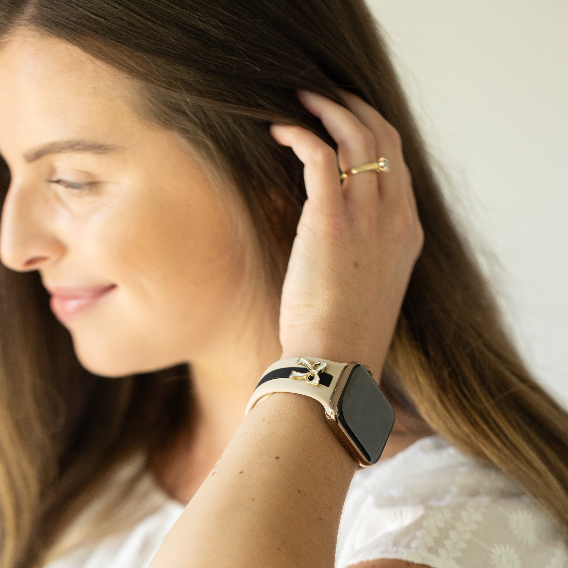 This Apple Watch band features our original molded band (nothing painted on printed on) high quality, soft, comfortable and beautifullll! You have a choice of a pair of dainty white bow charms in either gold, silver or rose gold finish.