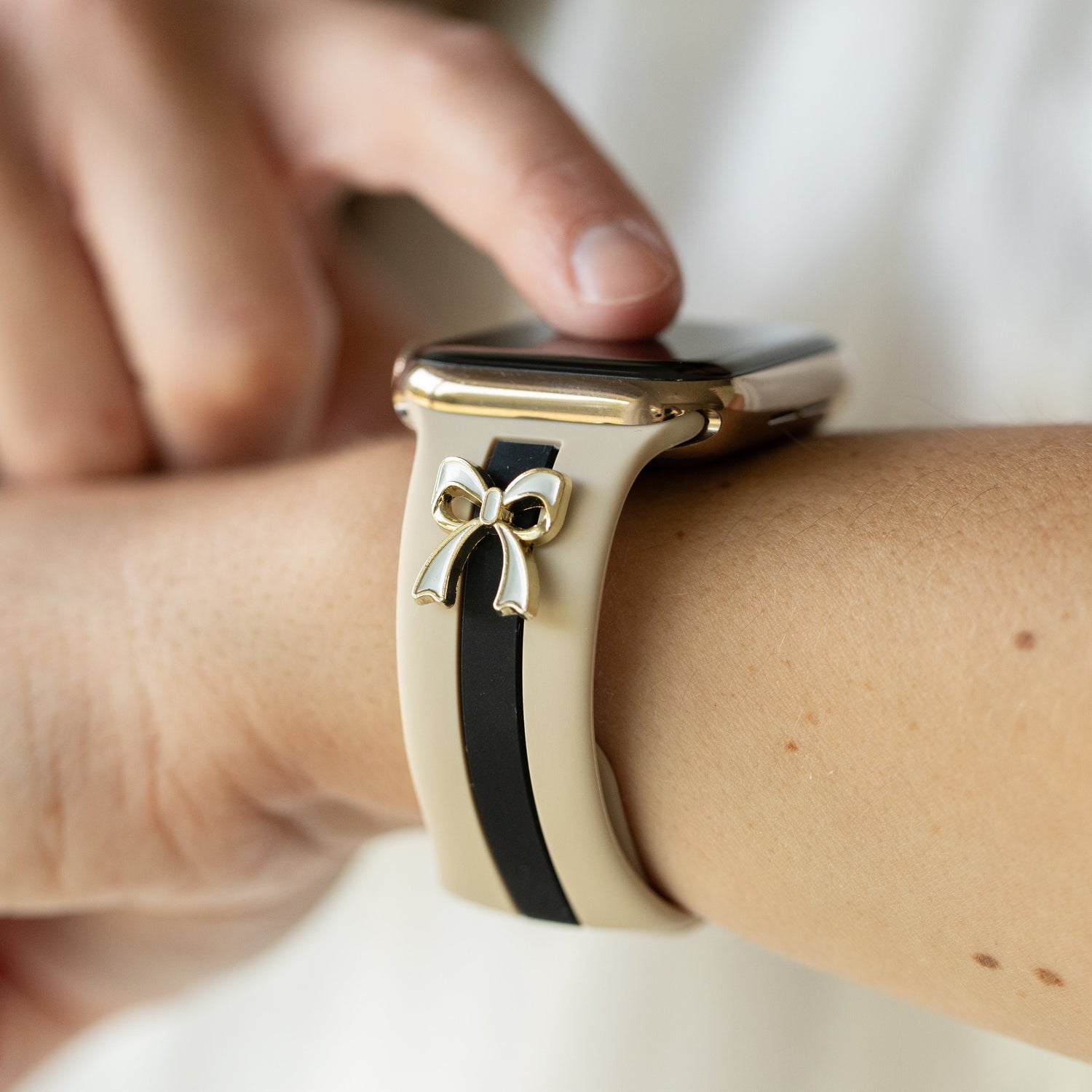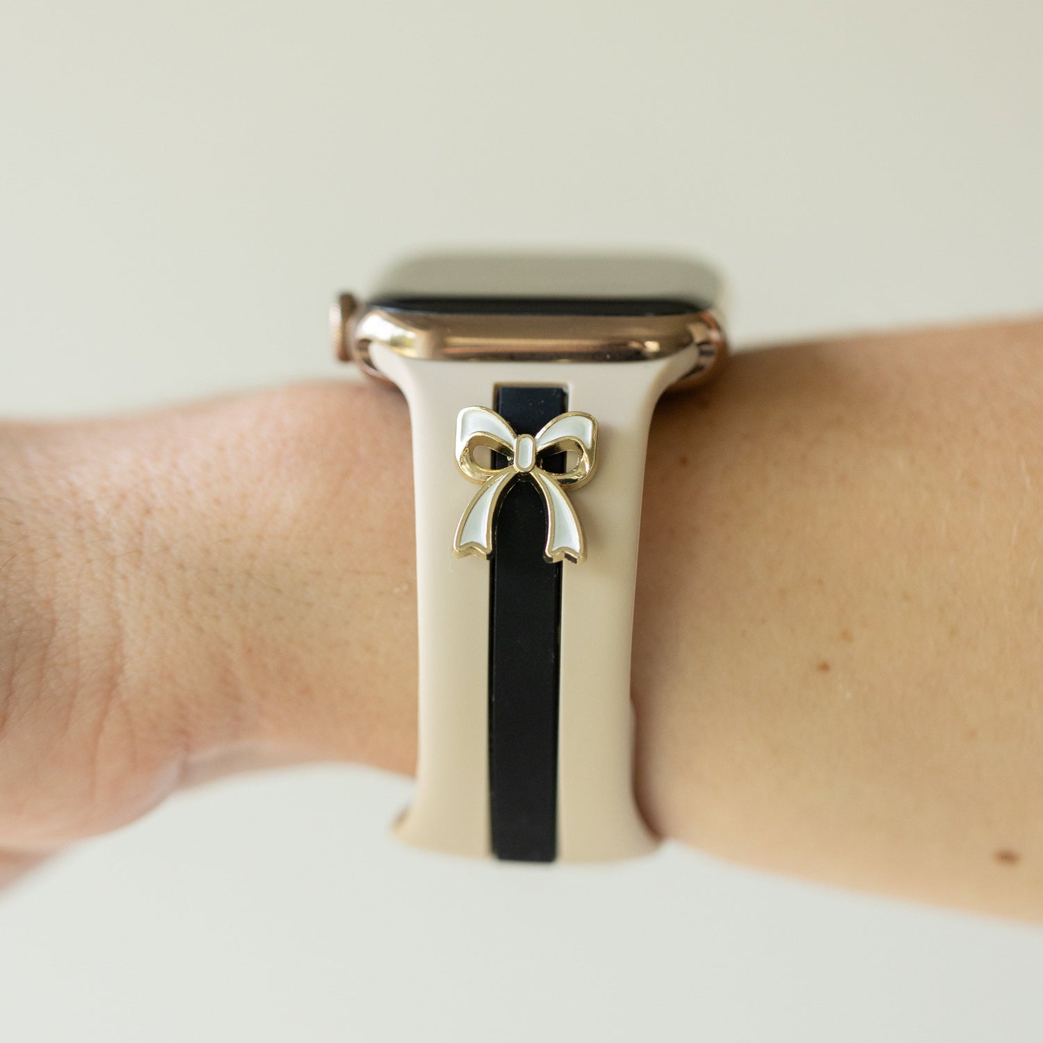 This Apple Watch band features our original molded band (nothing painted on printed on) high quality, soft, comfortable and beautifullll! You have a choice of a pair of dainty white bow charms in either gold, silver or rose gold finish.