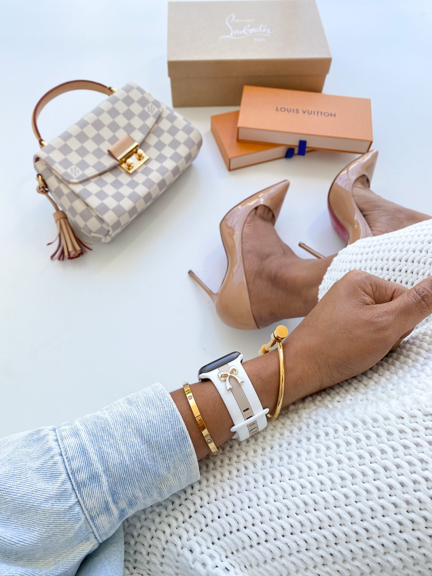 This Apple Watch band features our original molded band (nothing painted on printed on) high quality, soft, comfortable and beautifullll! You have a choice of a pair of dainty white bow charms in either gold, silver or rose gold finish.