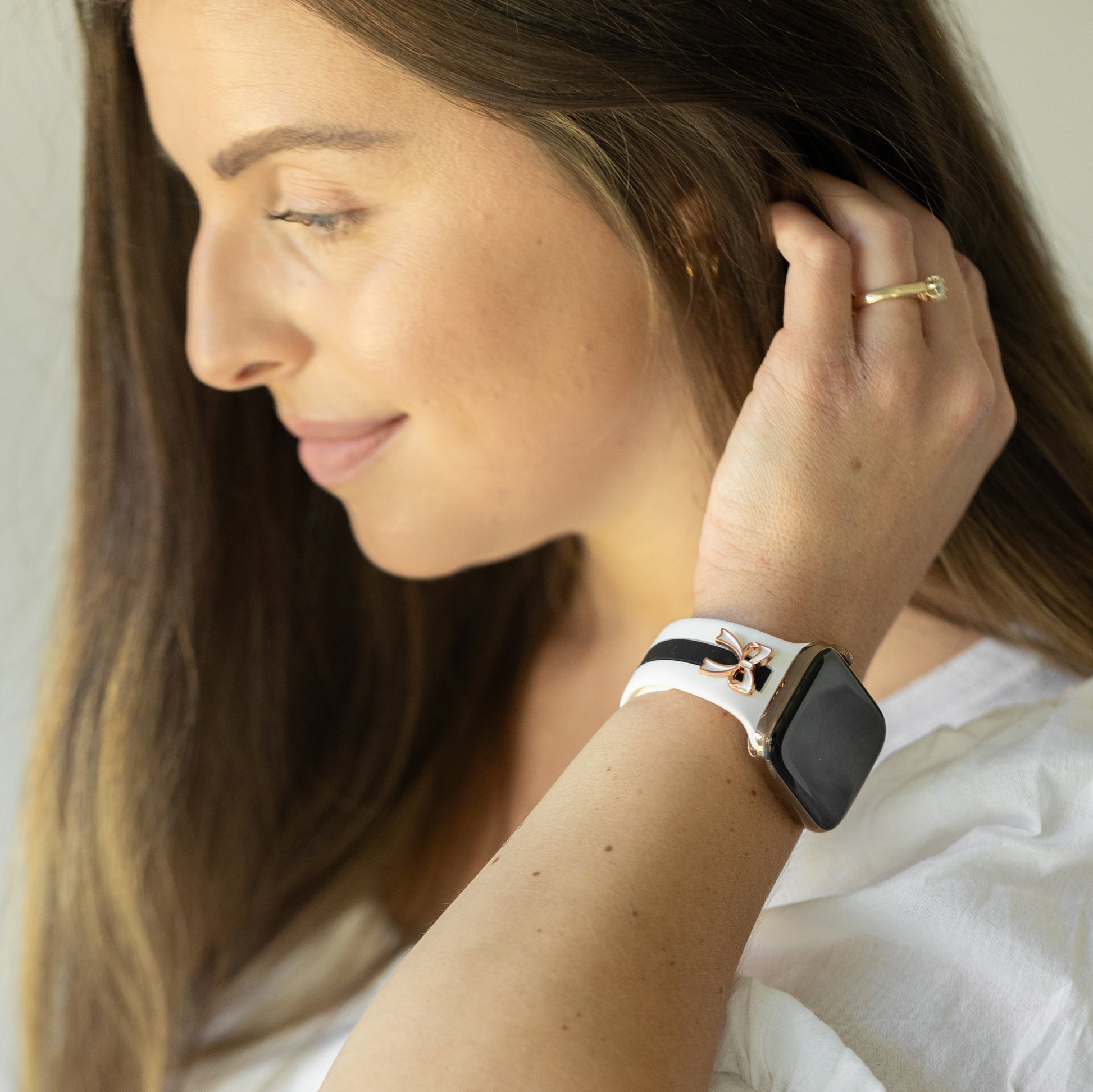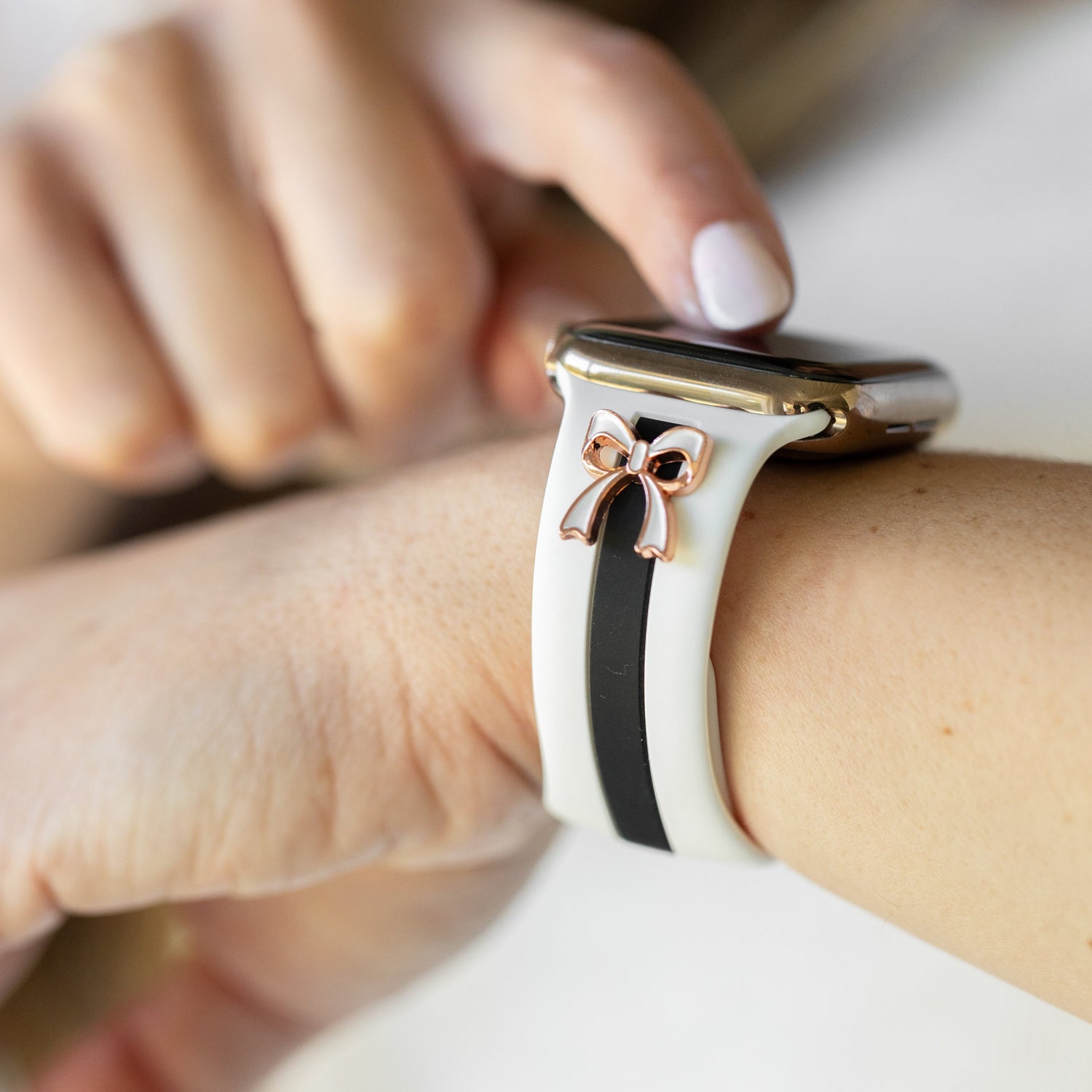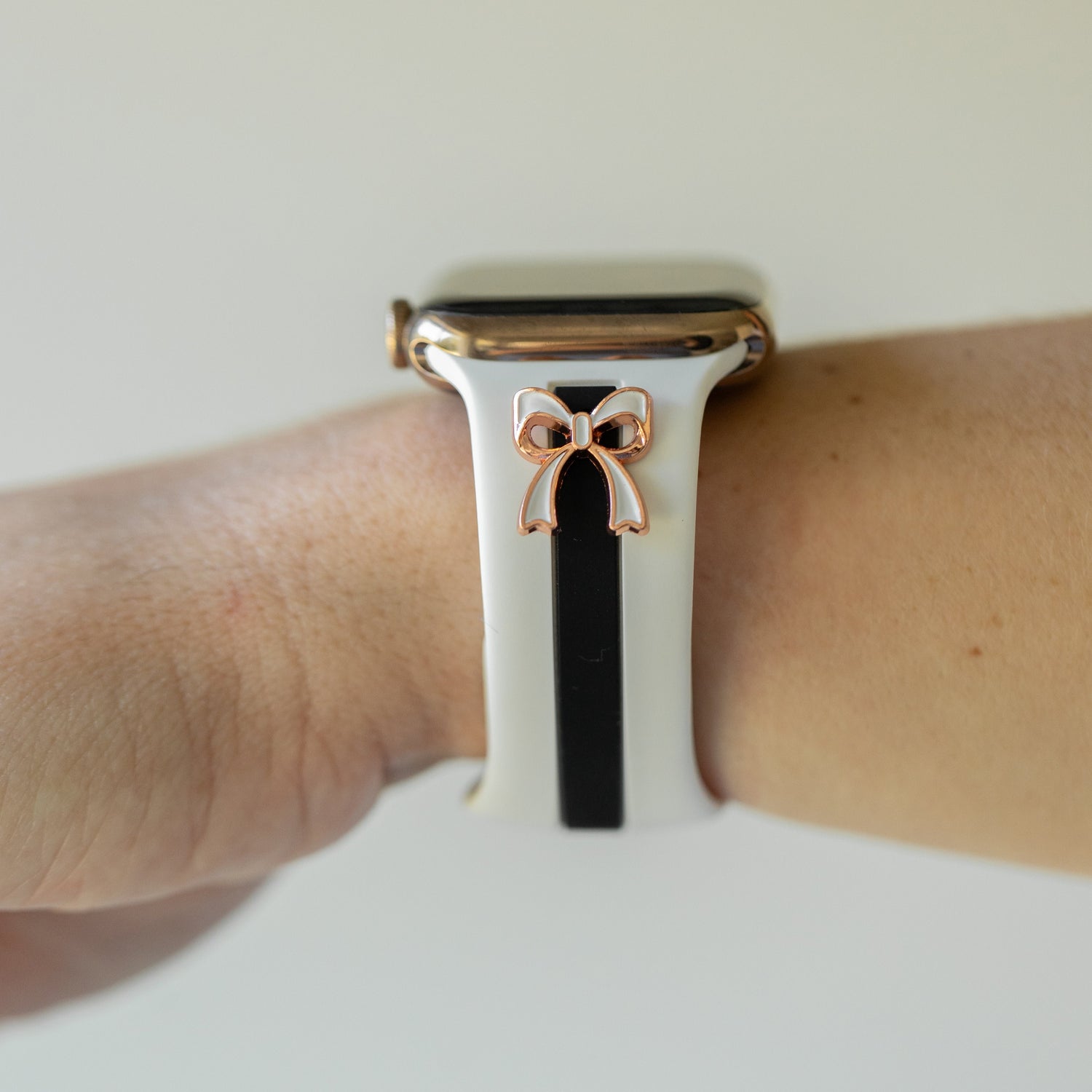 This Apple Watch band features our original molded band (nothing painted on printed on) high quality, soft, comfortable and beautifullll! You have a choice of a pair of dainty white bow charms in either gold, silver or rose gold finish.